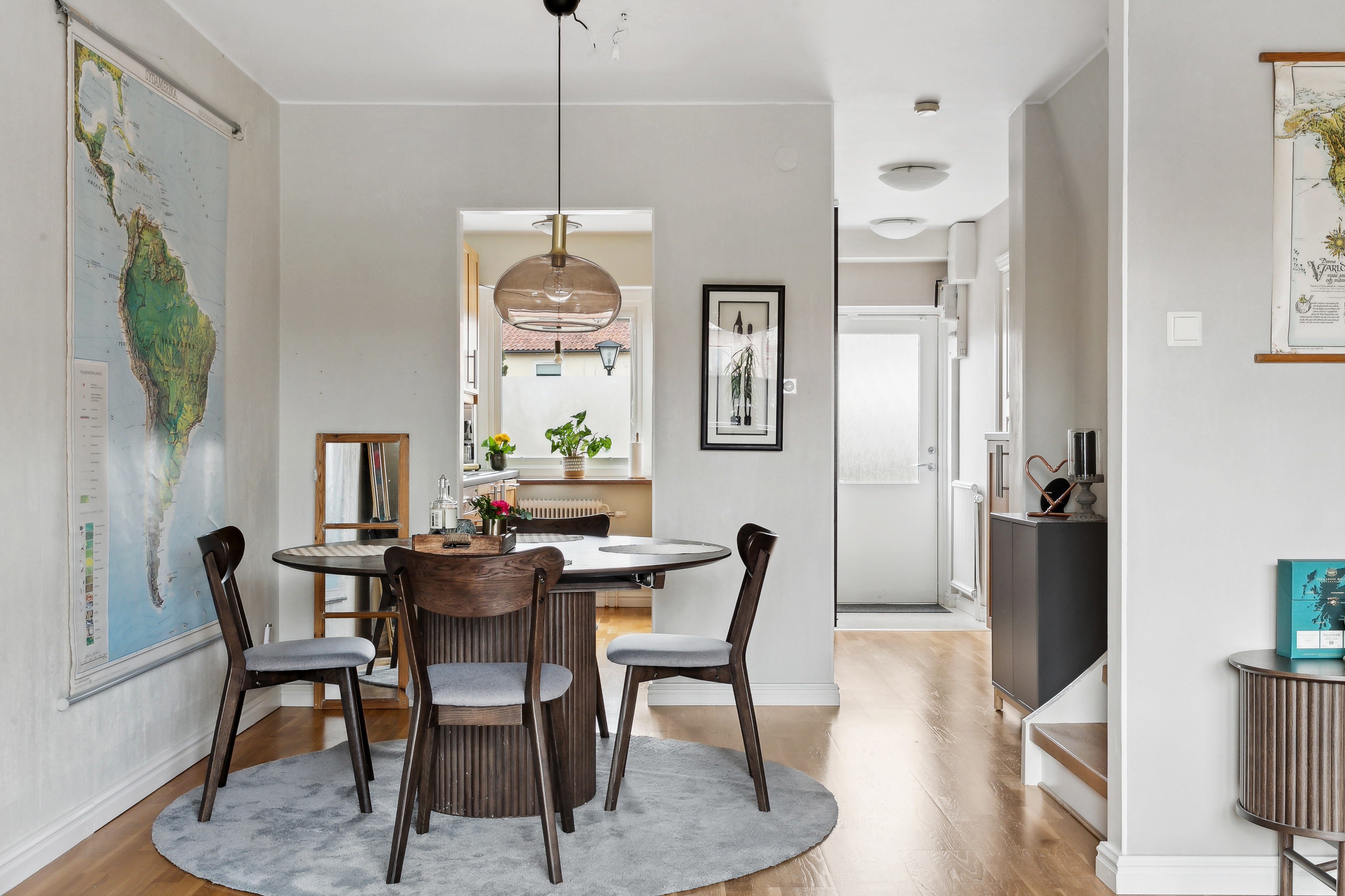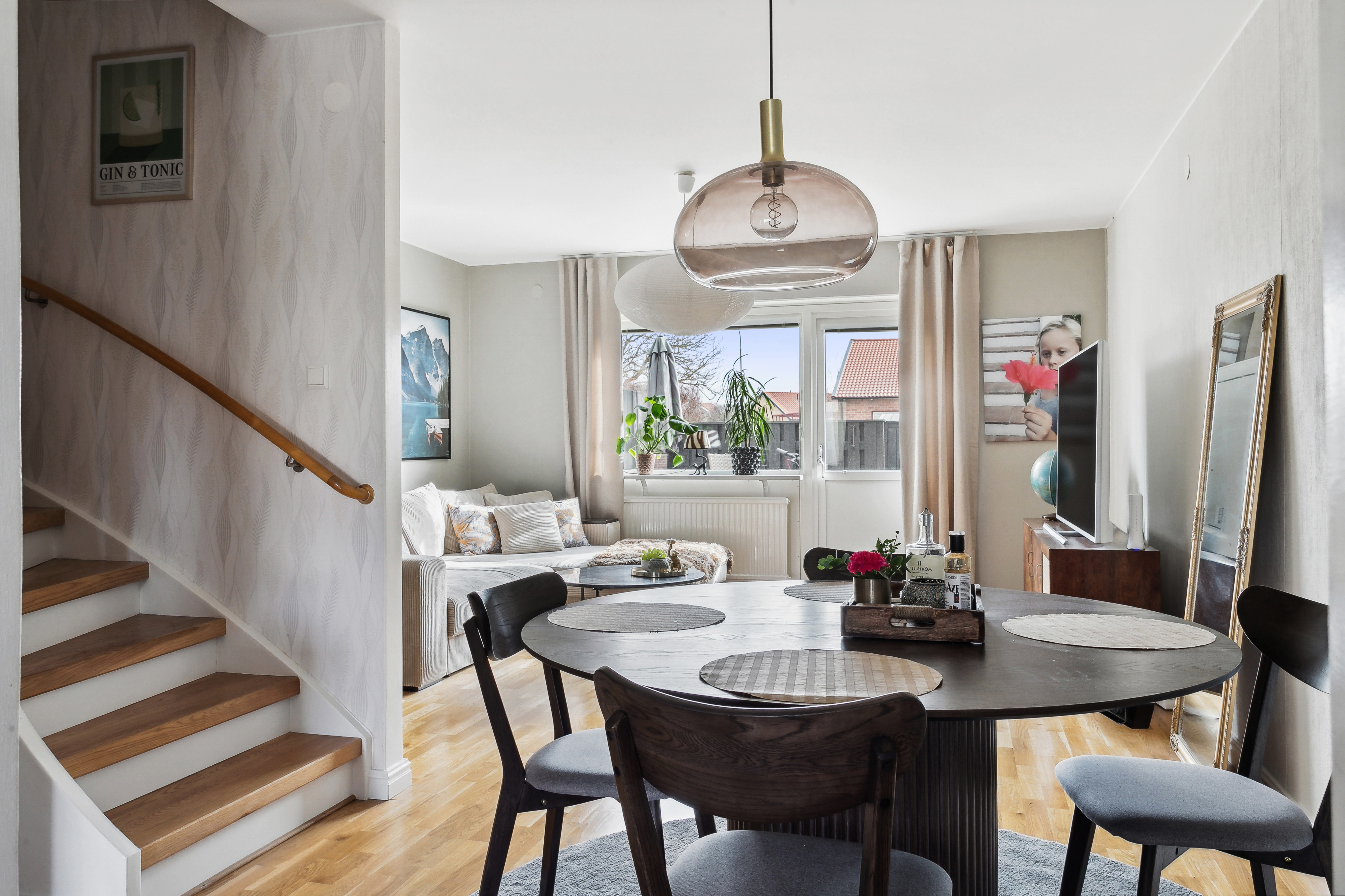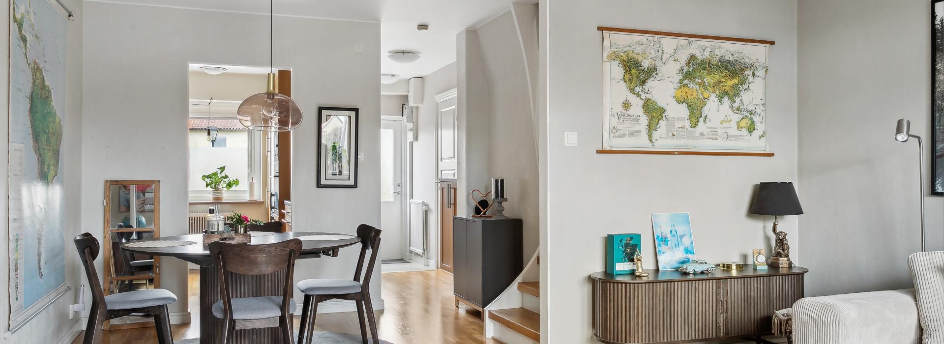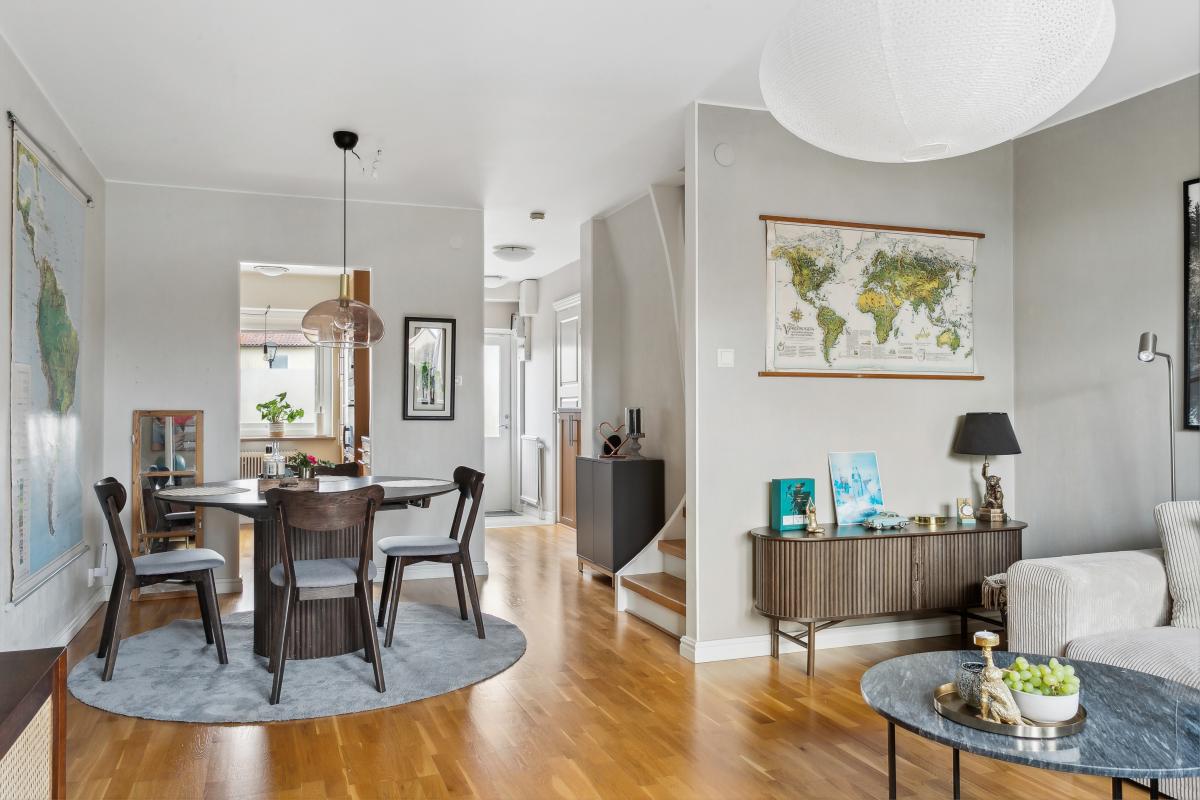I anslutning till köket, och som en del av vardagsrummet, finns en rymlig matplats. Trappa upp till övre plan.