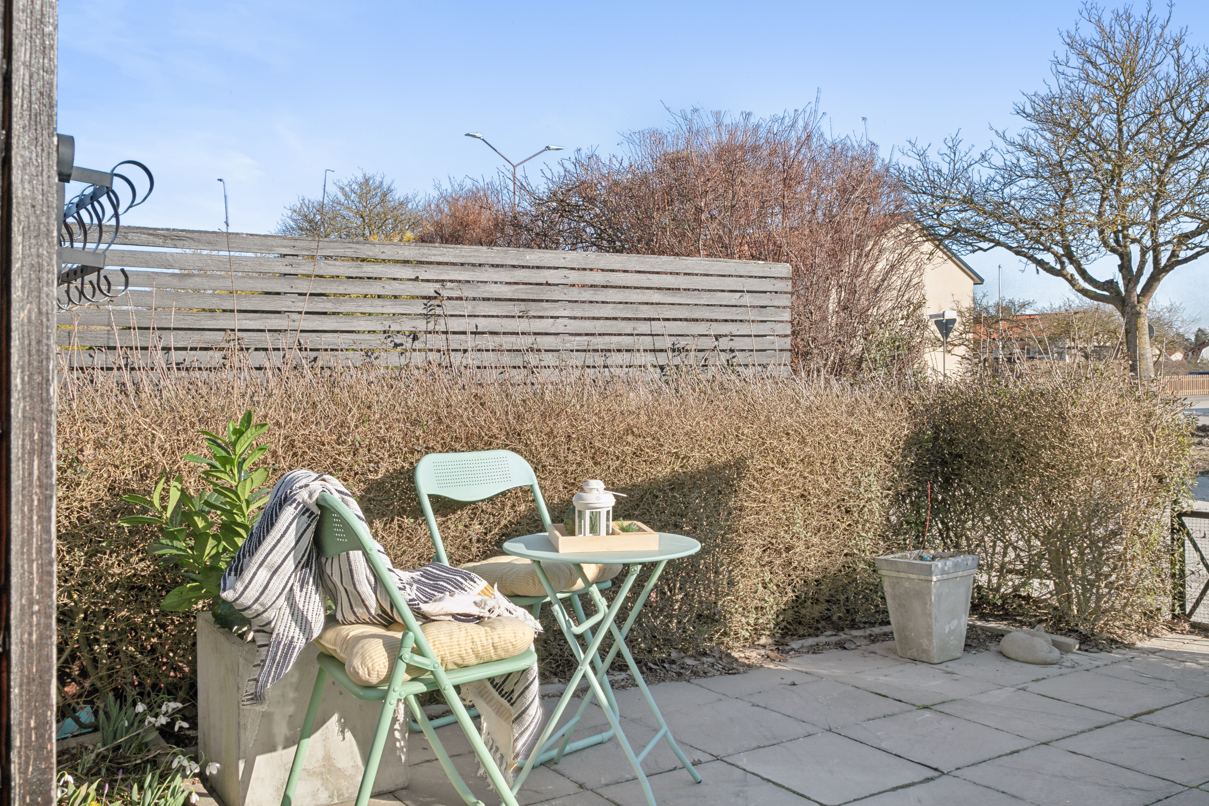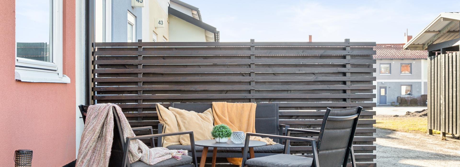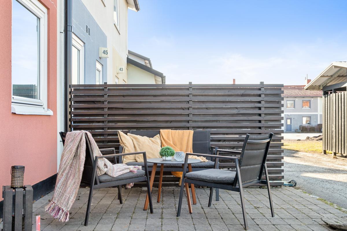 Vid entrén finns även en stensatt uteplats mot innergården med insynsskydd mot grannen.