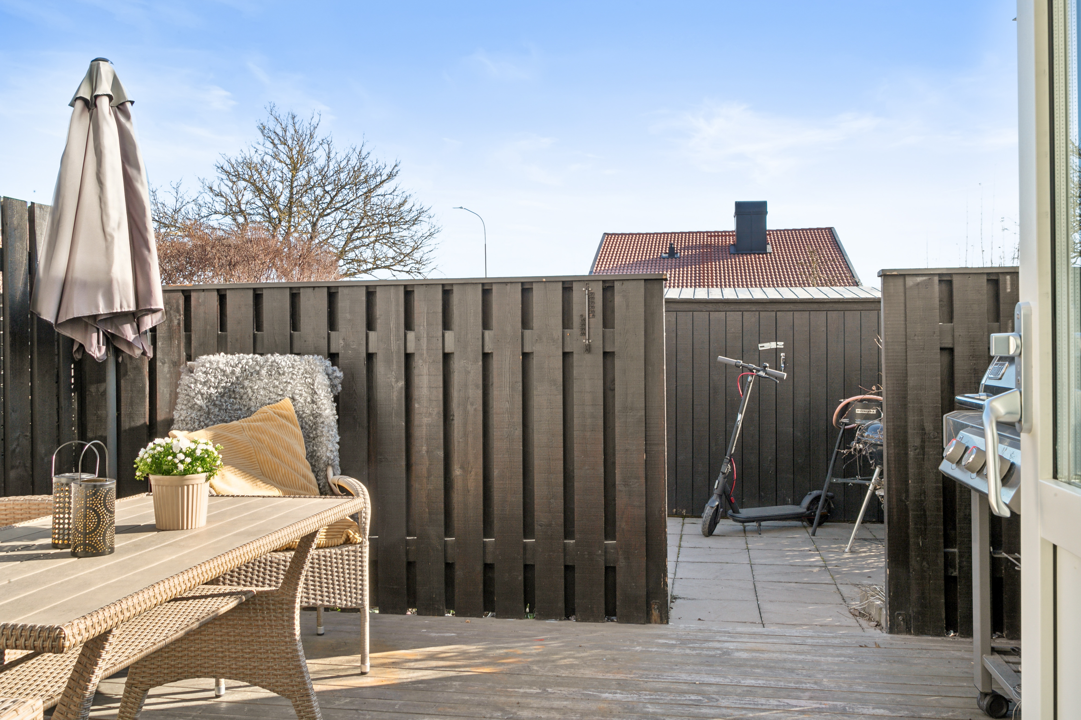 Stor härlig uteplats i soligt söderläge. Uteplatsen har ett inbjudande trädäck närmast huset med eldriven markis och plats för solstolar och loungemöbler. Trädäcket ramas in av ett rejält insynsskydd i trä. Vidare fortsätter uteplatsen med en fin stenlagd del med rabatt, tät häck och grind.