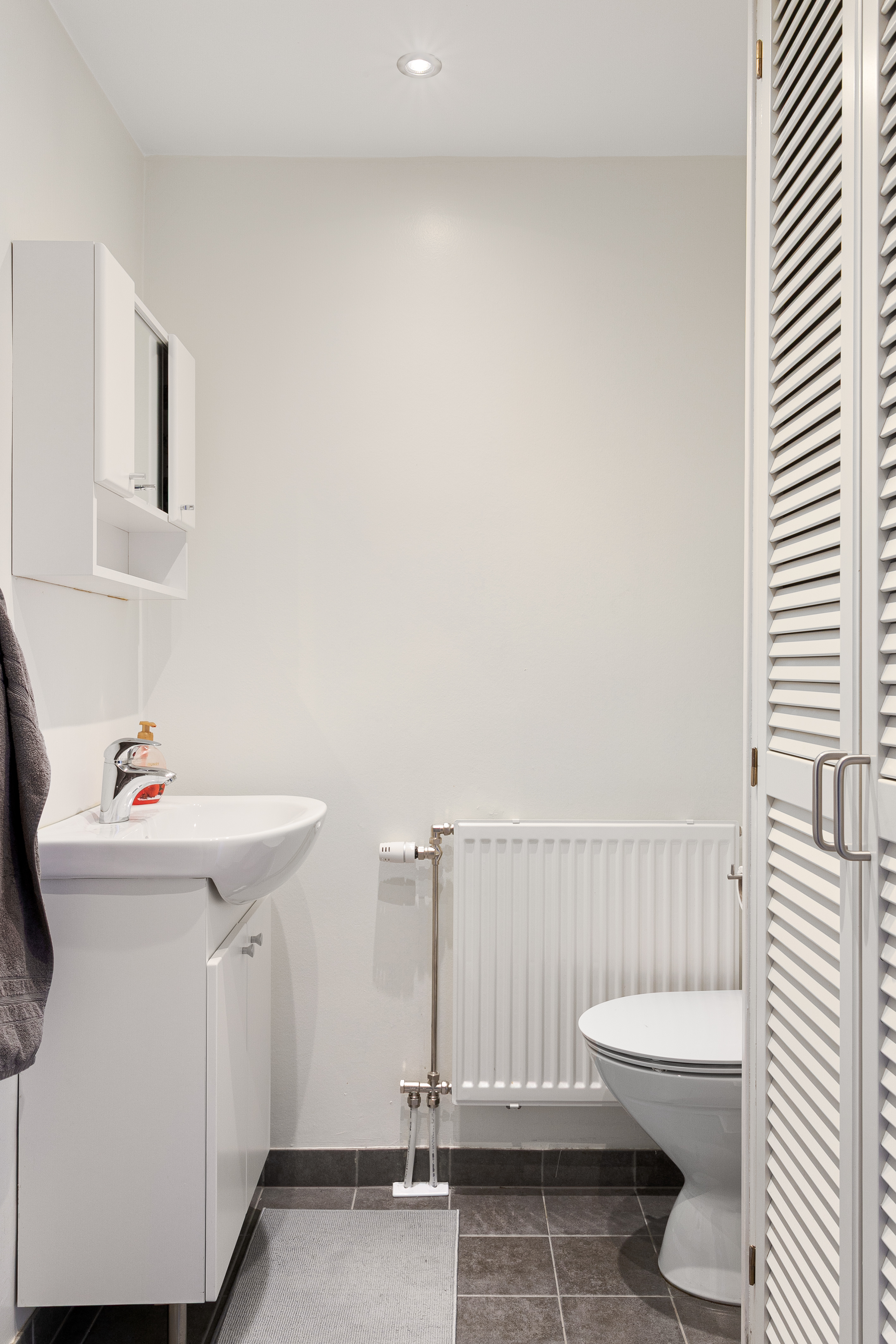 Fräscht badrum med vita helkaklade väggar och grått klinkergolv med golvvärme.