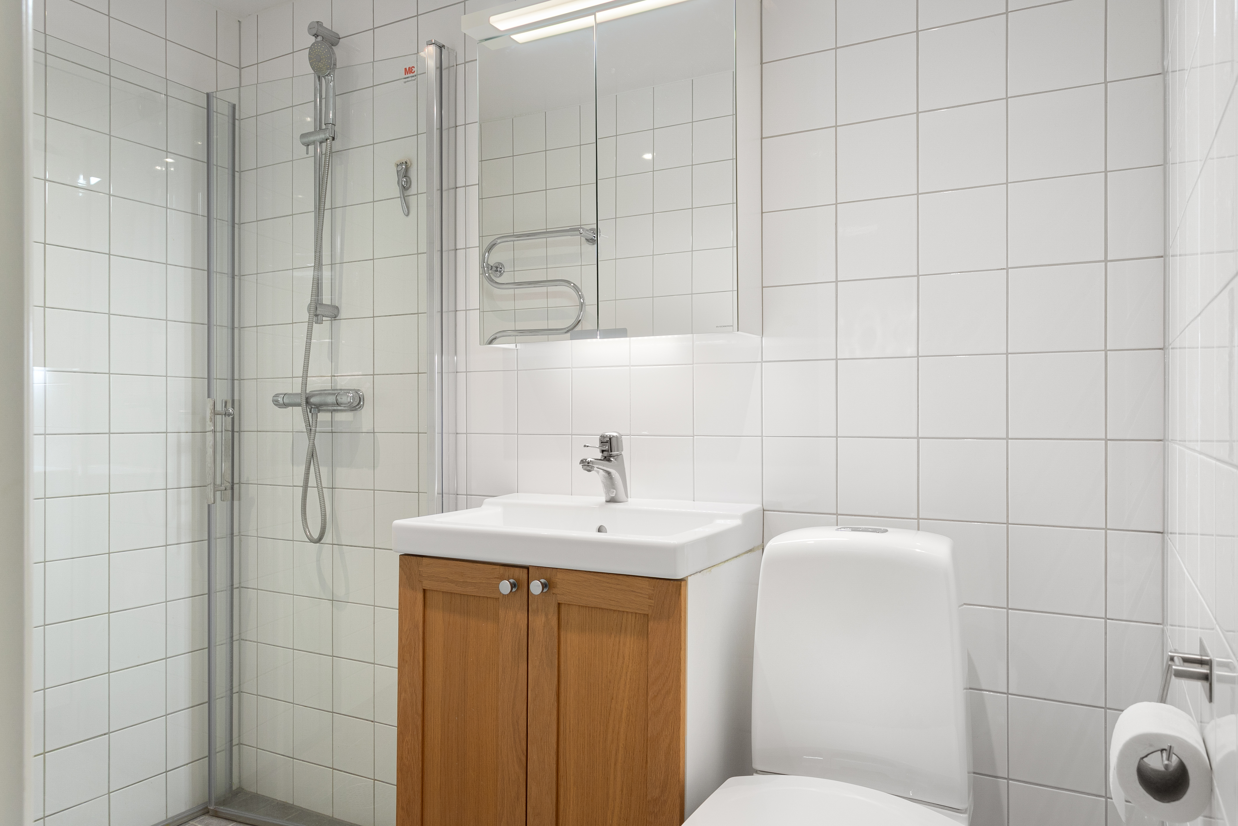 Utrustning: dusch med duschdörrar av glas, tvättställ i kommod, spegelskåp, wc och handdukstork.