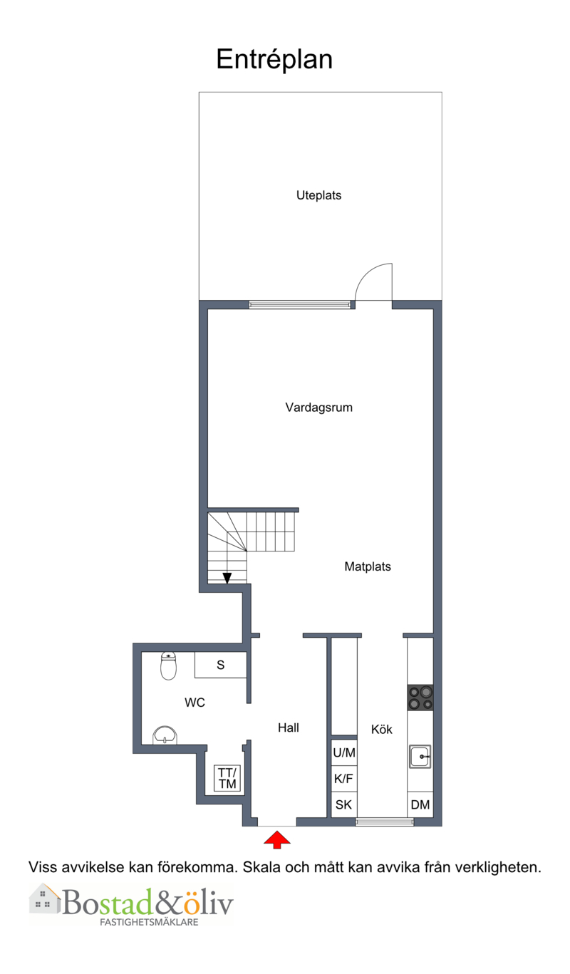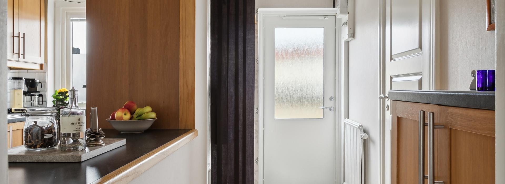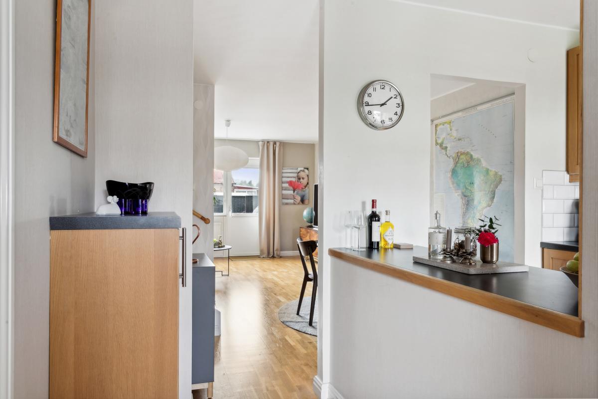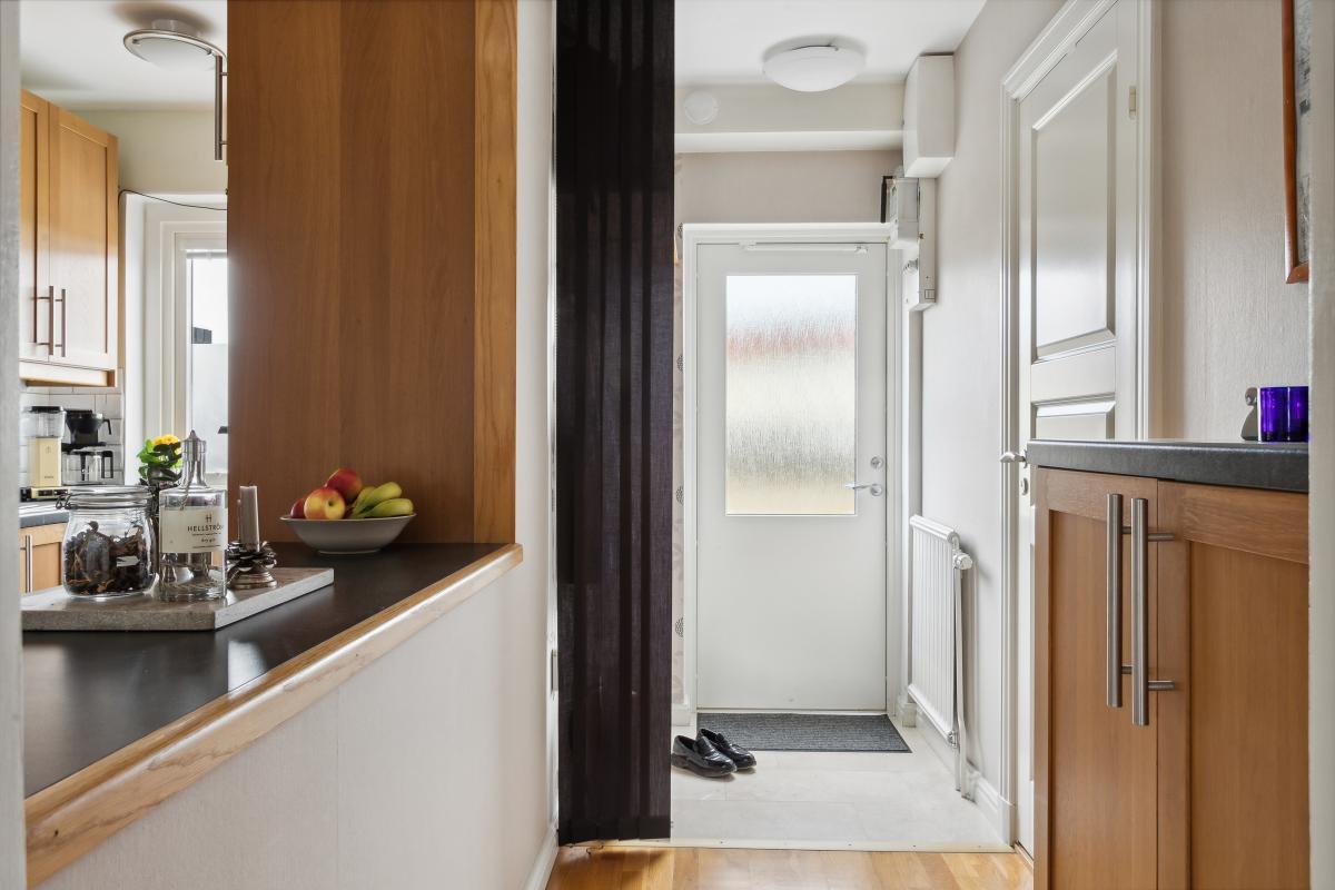 Entré via egen ingång från innergården till hall med plats för ytterkläder och skor. Hallen leder in till vardagsrum och matplats och har en trevlig öppning till höger mot köket med praktisk bänkyta.