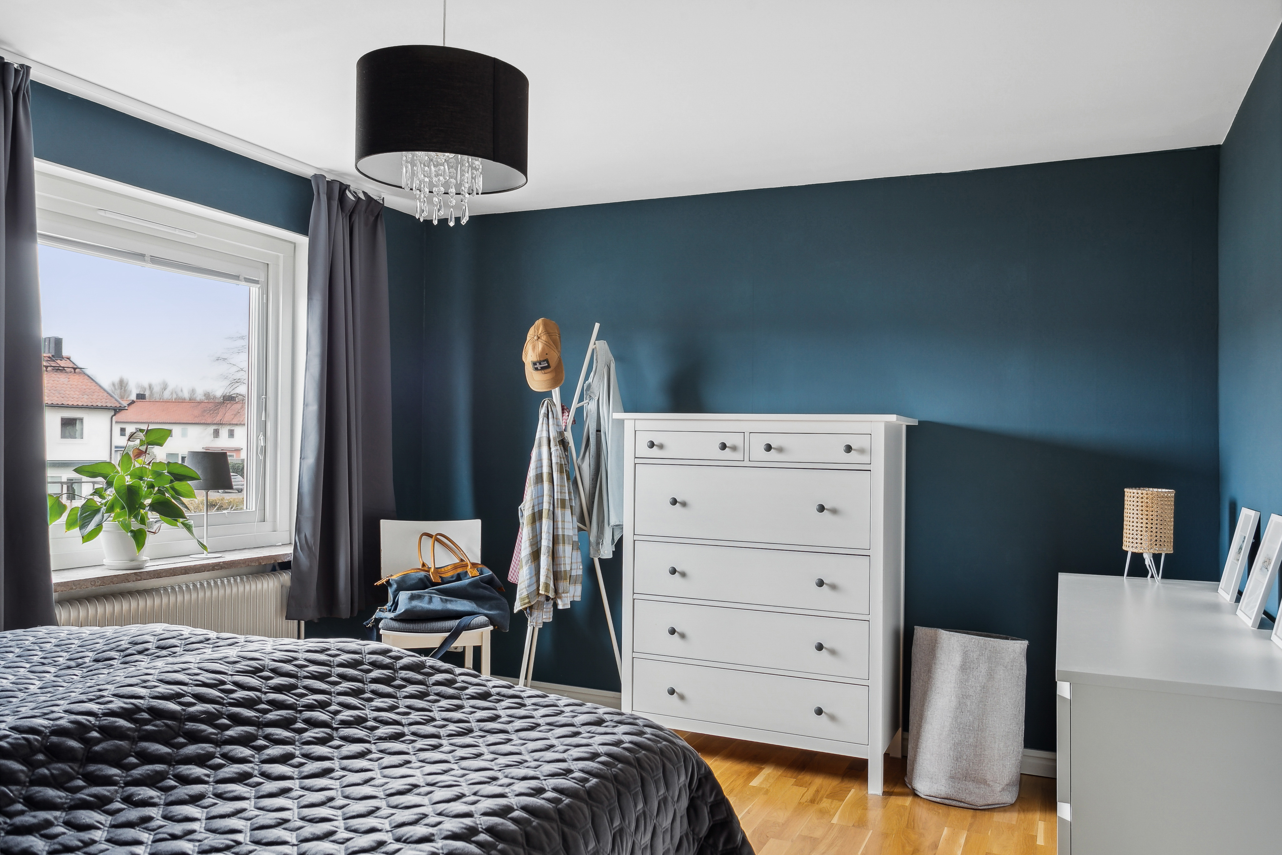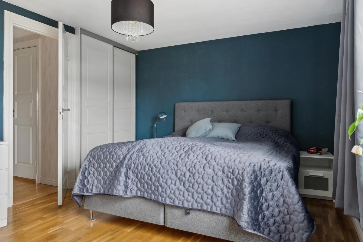 Stort och fint sovrum med plats för dubbelsäng. Rummet har stort fönster i norr och förvaring i garderober med skjutdörrar.