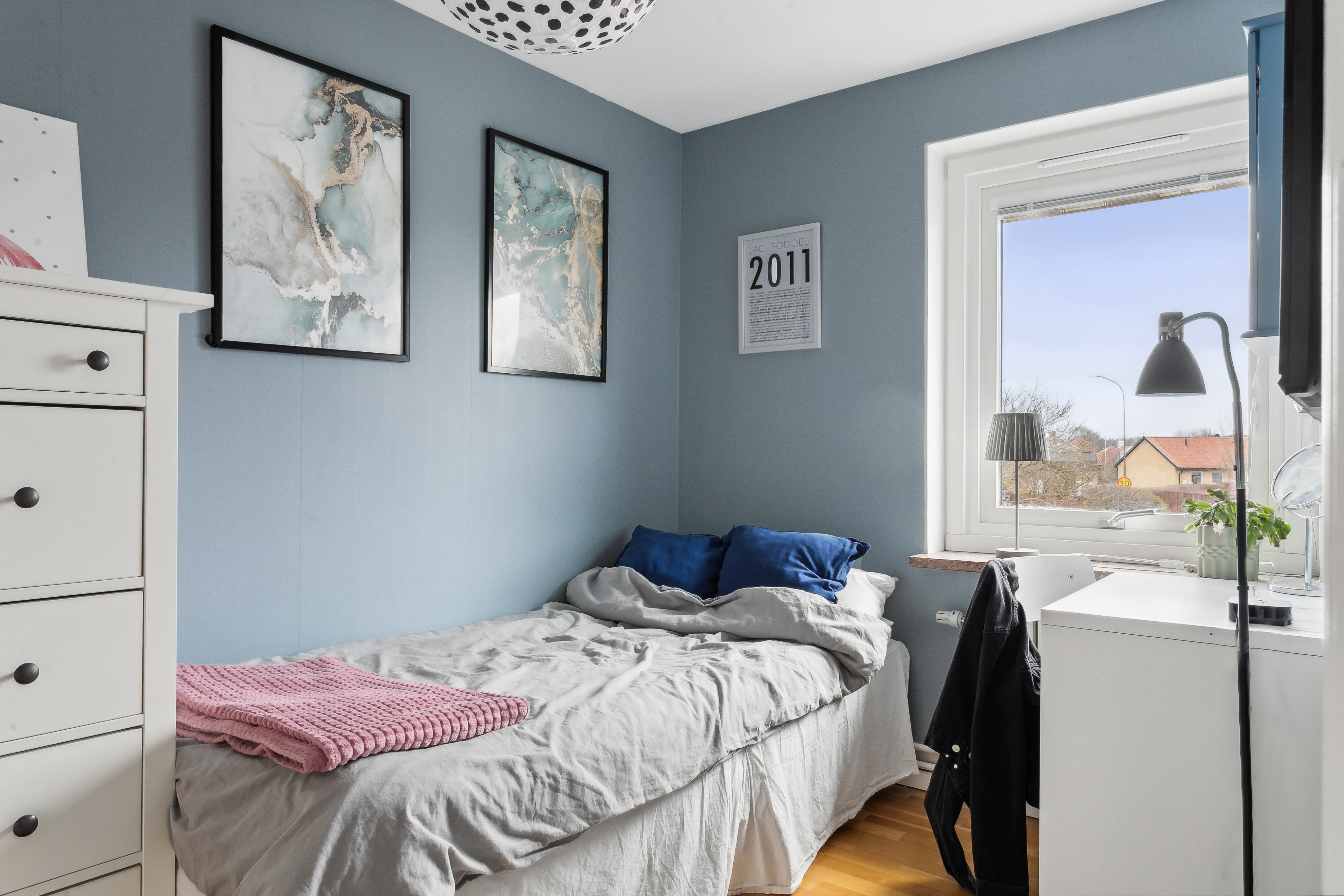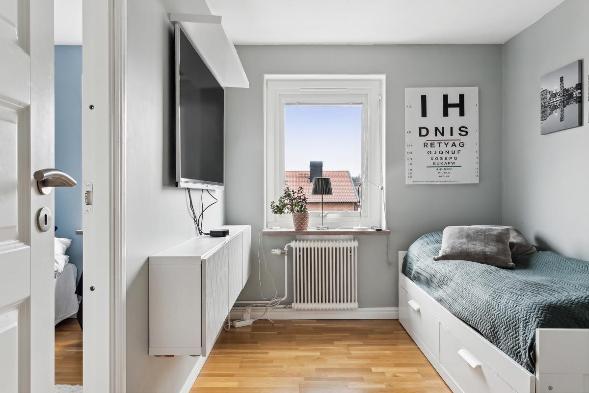 Ljust sovrum med fönster i söder. Rummet var ursprungligen ett stort sovrum som delats av med en vägg för att få två sovrum.