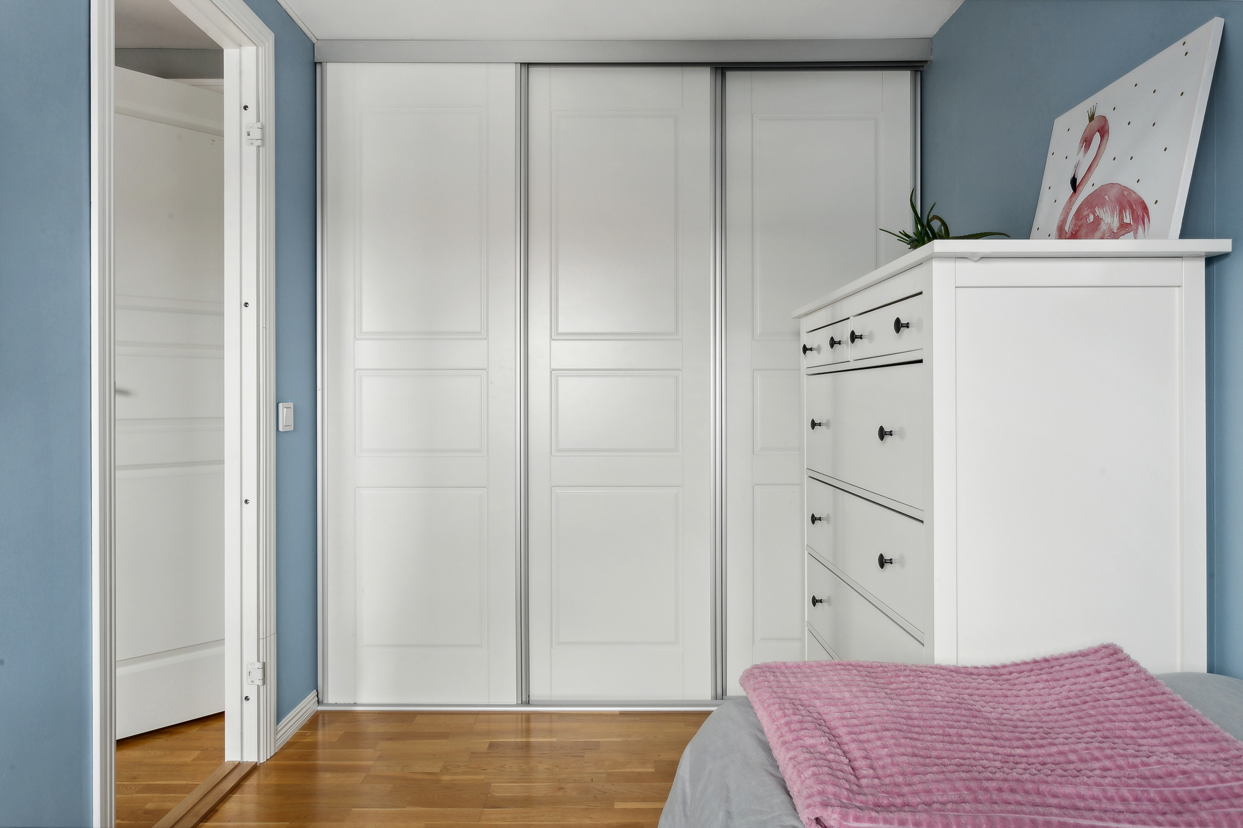 Fint sovrum med bra förvaring i garderober med skjutdörrar.