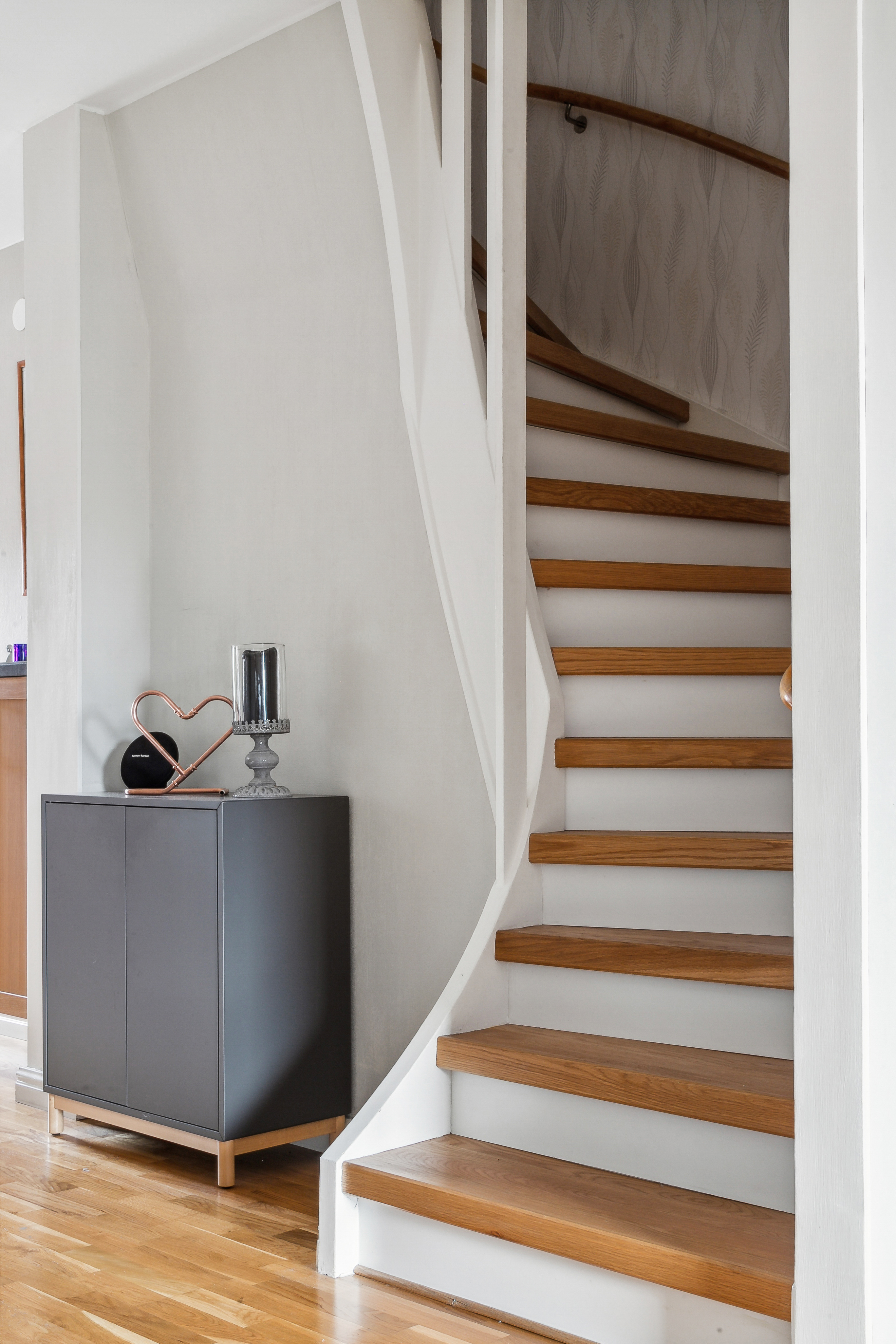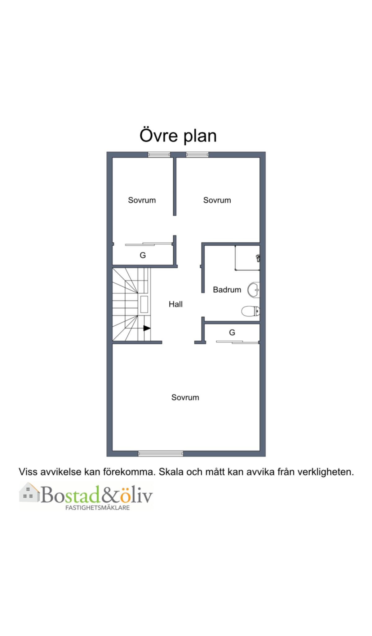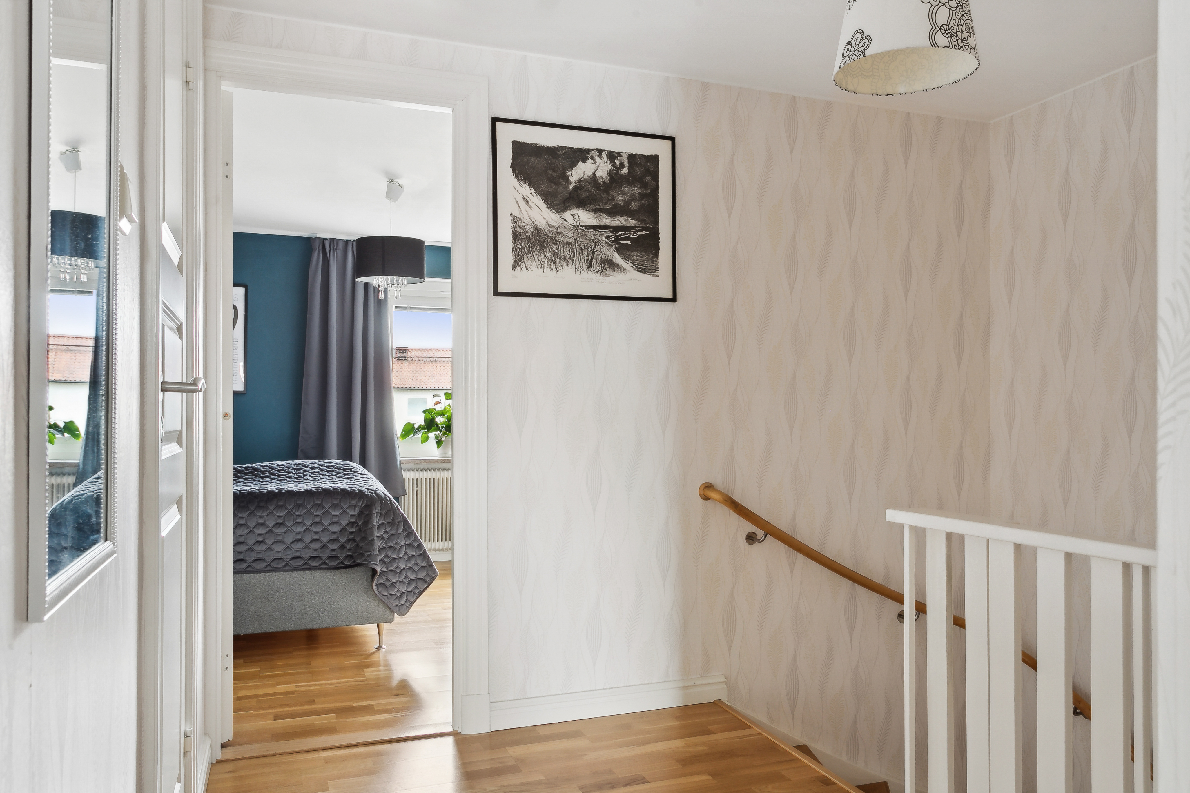 Övre hall med lucka till vind med utdragbar stege. Vinden är rymlig och har gott om förvaring.