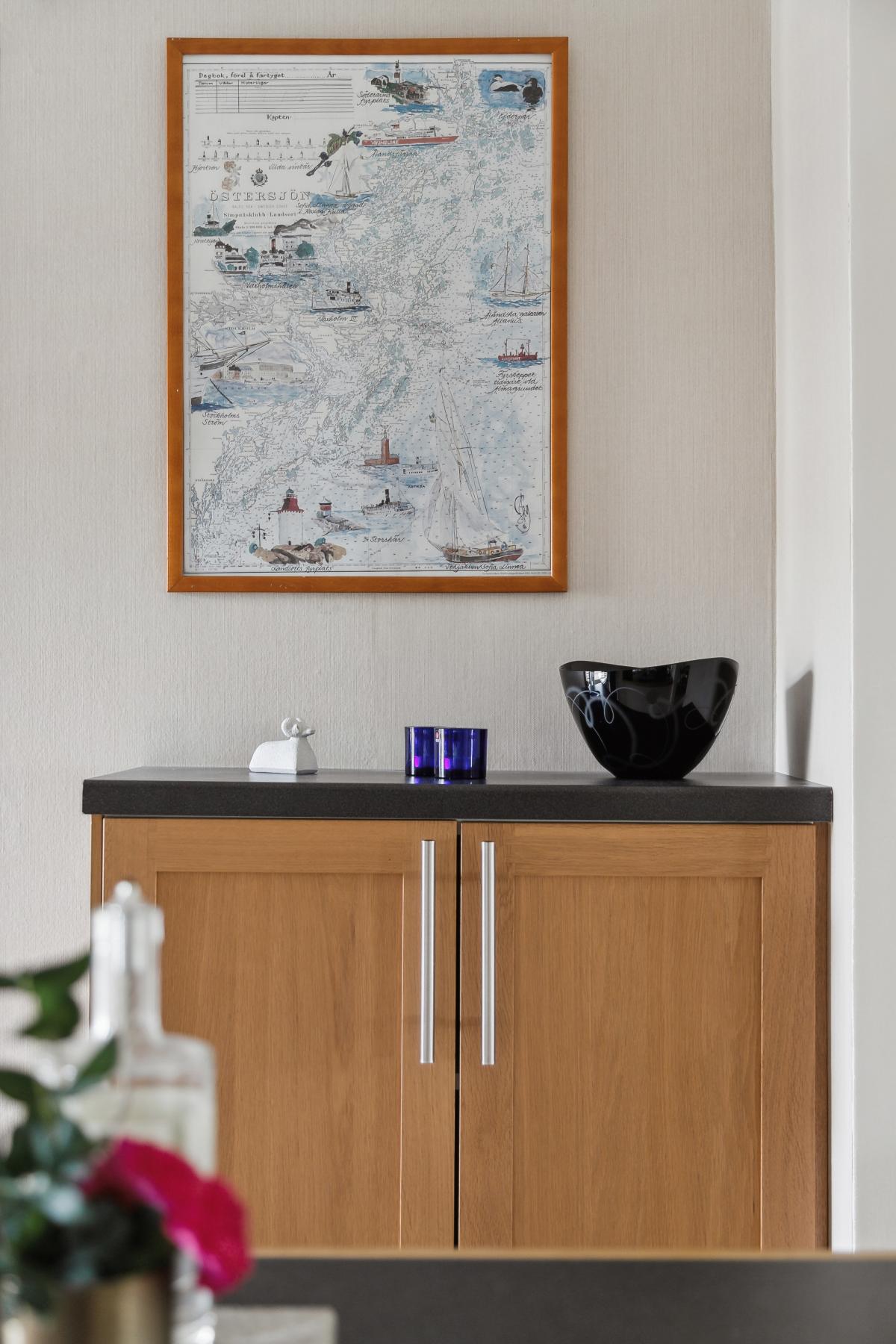 Utrustning: spishäll, spisfläkt, diskmaskin, skafferi, kyl/frys, inbyggd mikrovågsugn och inbyggd varmluftsugn.