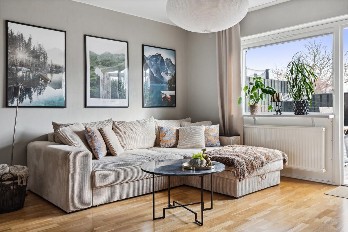 Ljust vardagsrum med stort fönster och utgång till den egna uteplatsen.