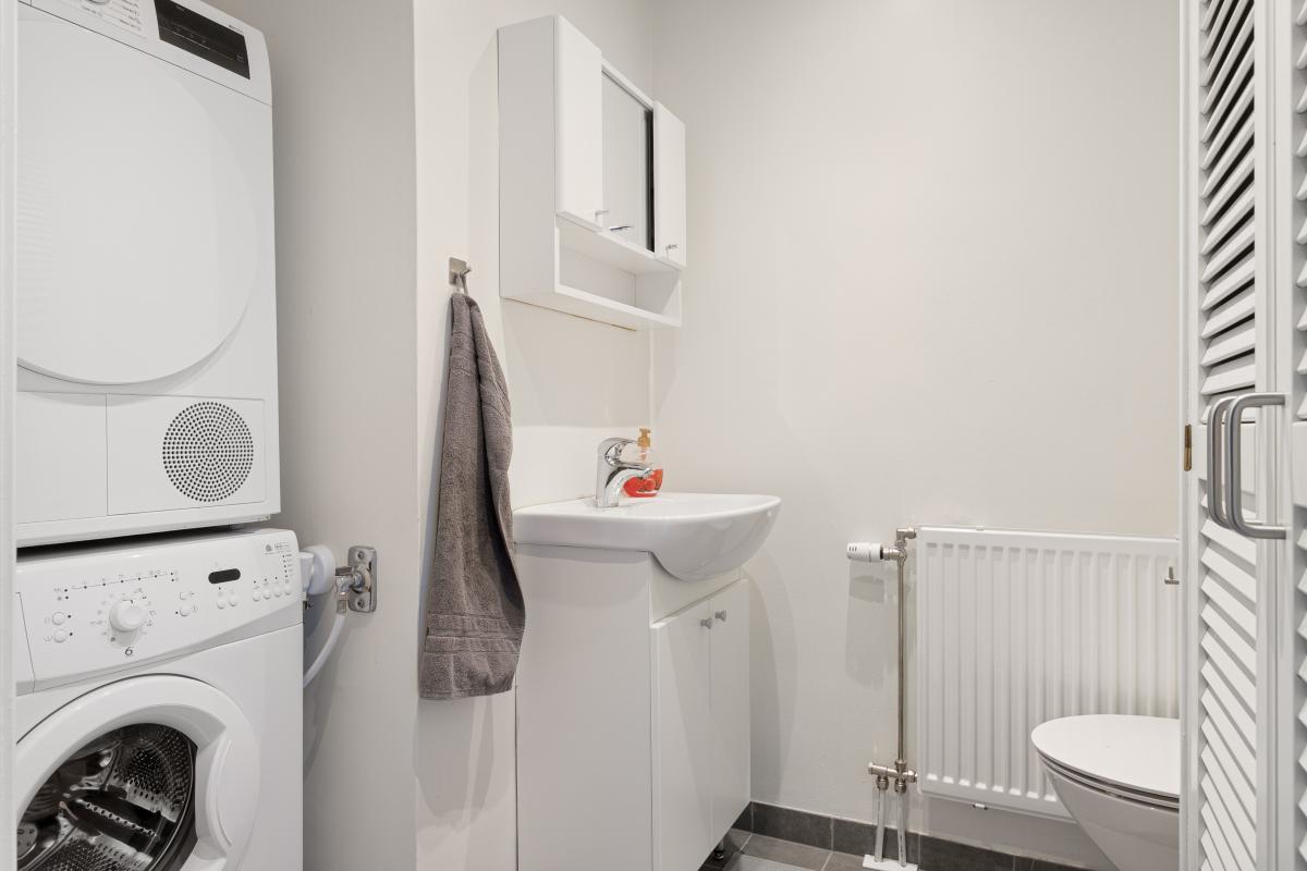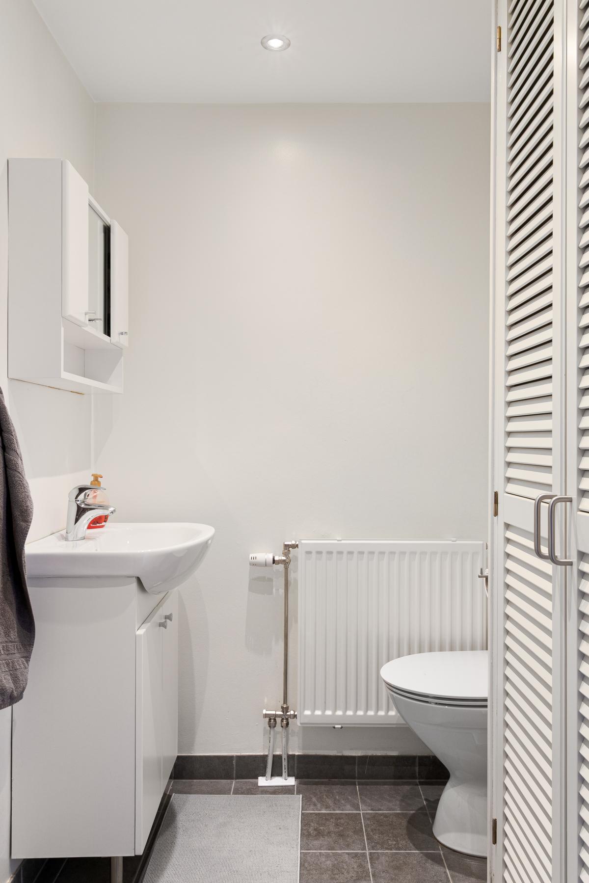 Vid hallen ligger en fin wc med grått klinkergolv och ljusa väggar. Här finns även plats för både tvättmaskin och torktumlare.