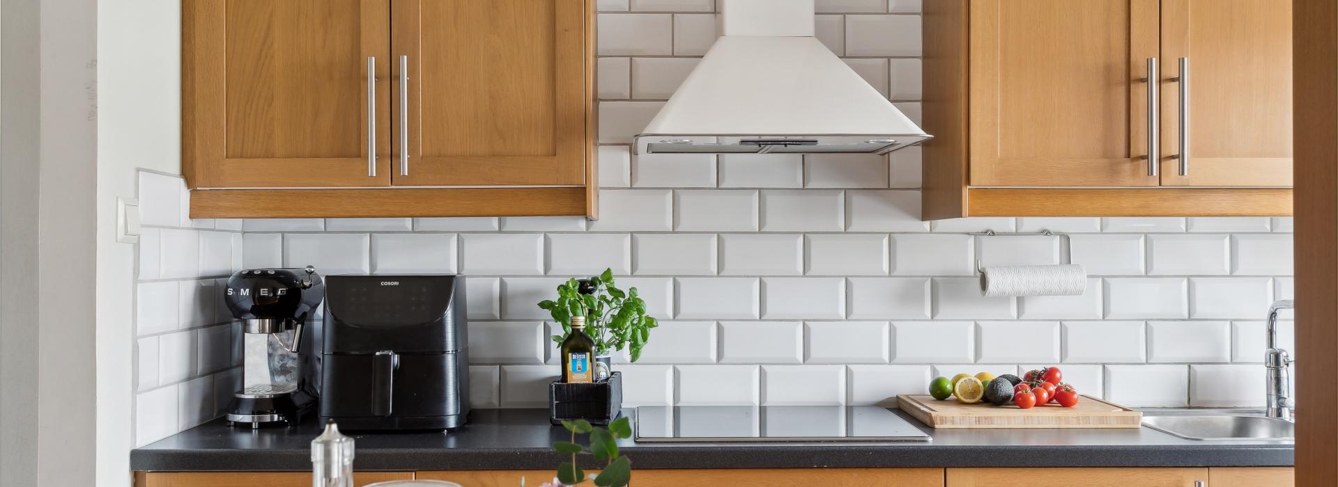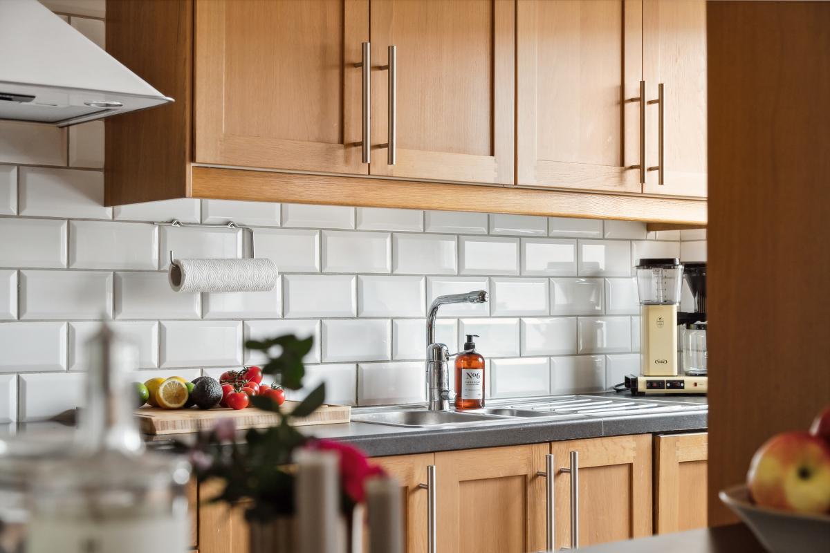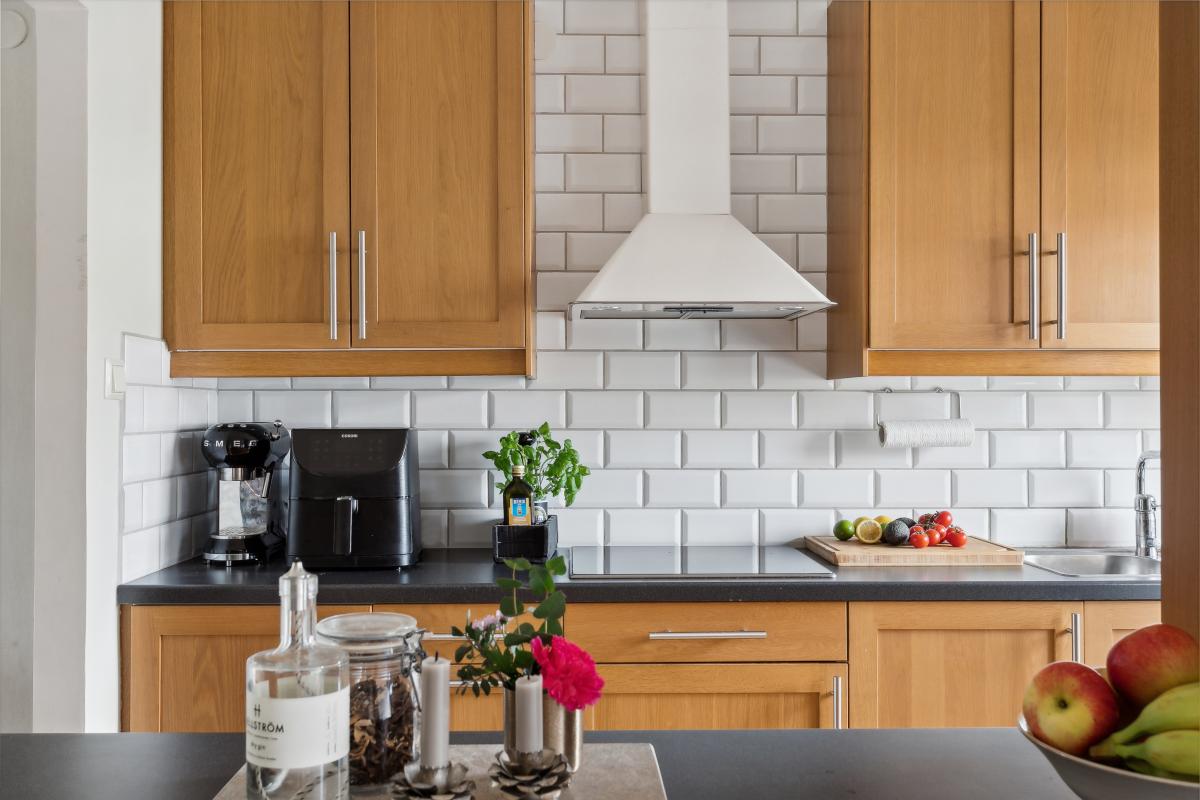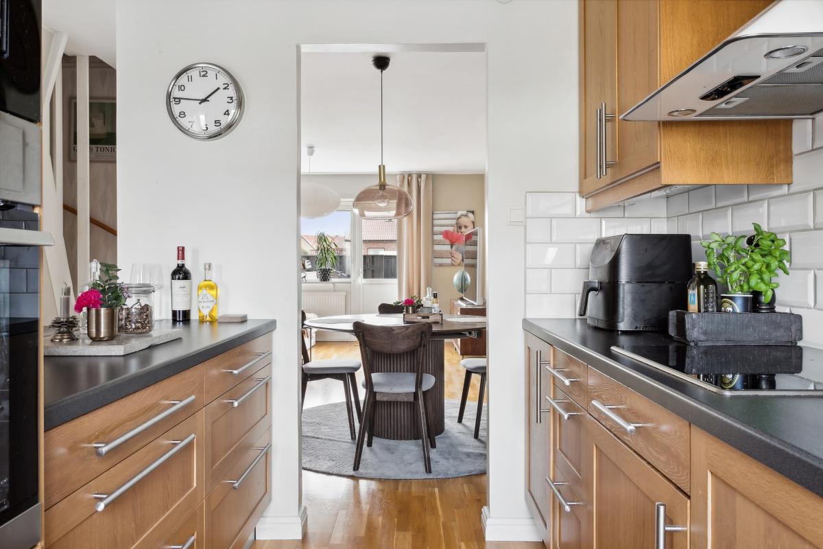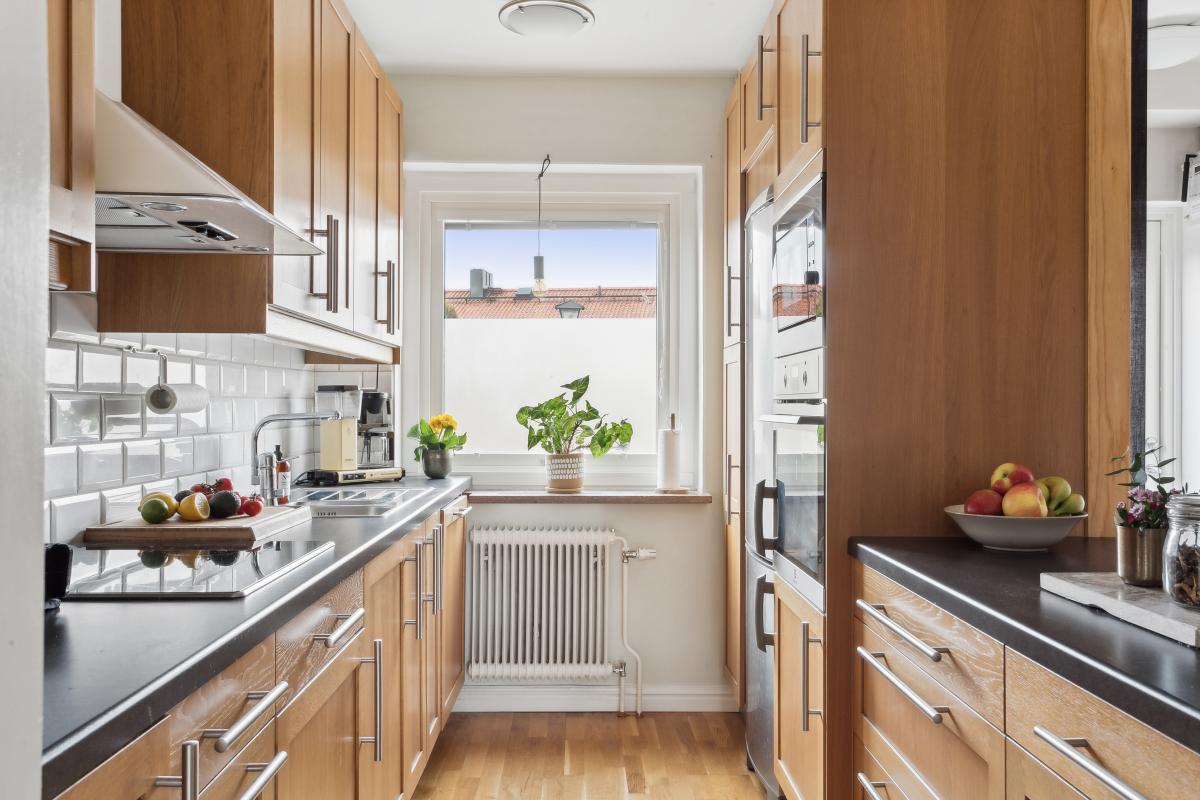 Stilrent arbetskök i ek med fönster mot innergården. Köket är väldisponerat med bra arbetsytor och gott om förvaring. Mörkgrå bänkskiva av laminat samt vit kaklad vägg.