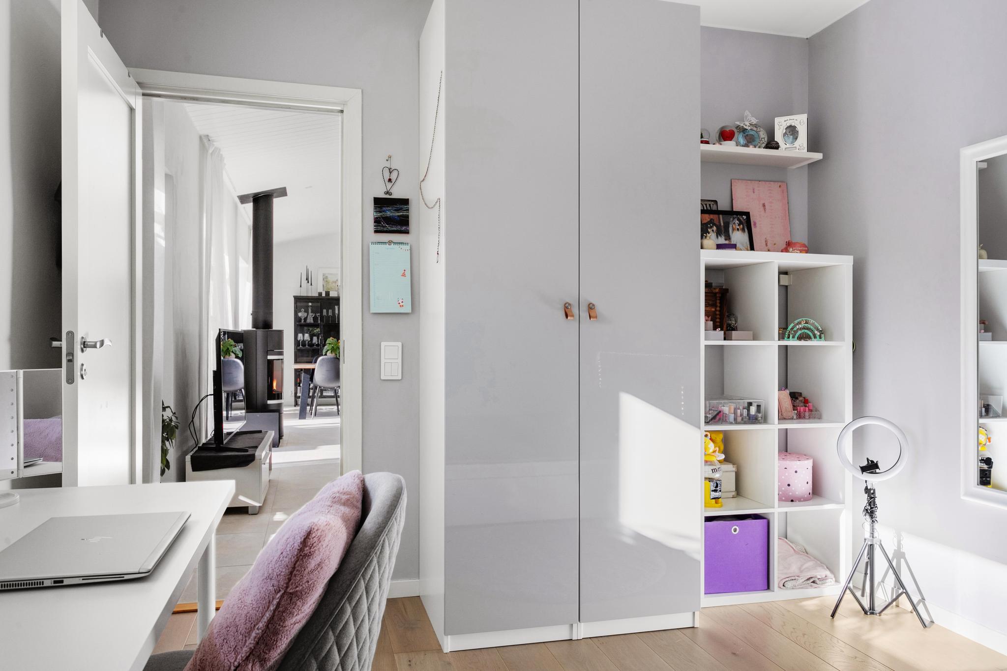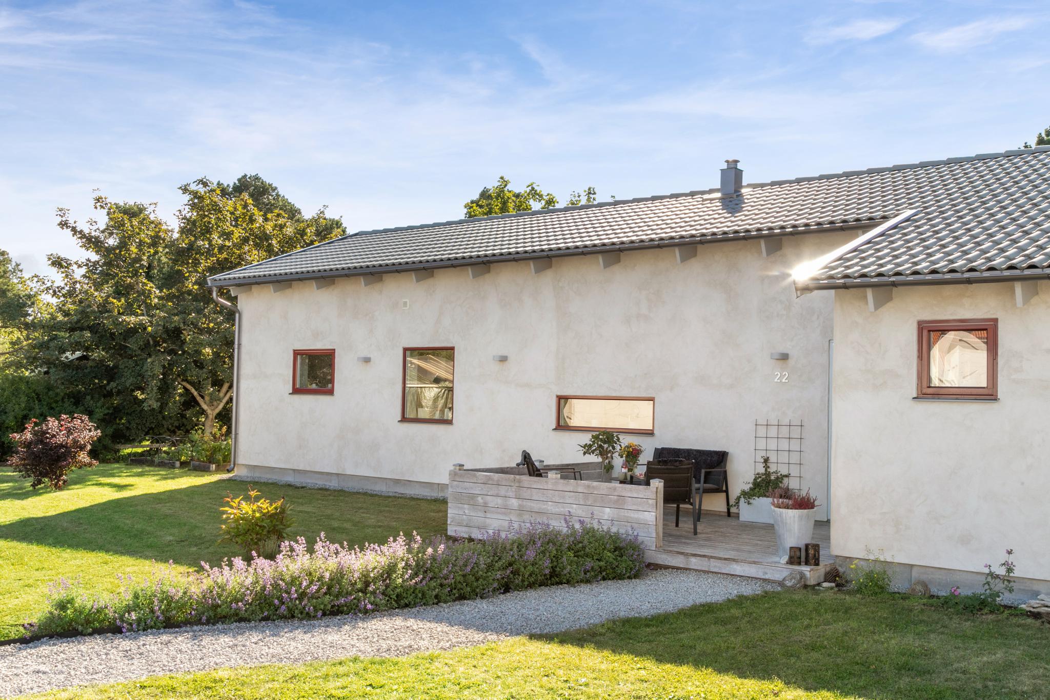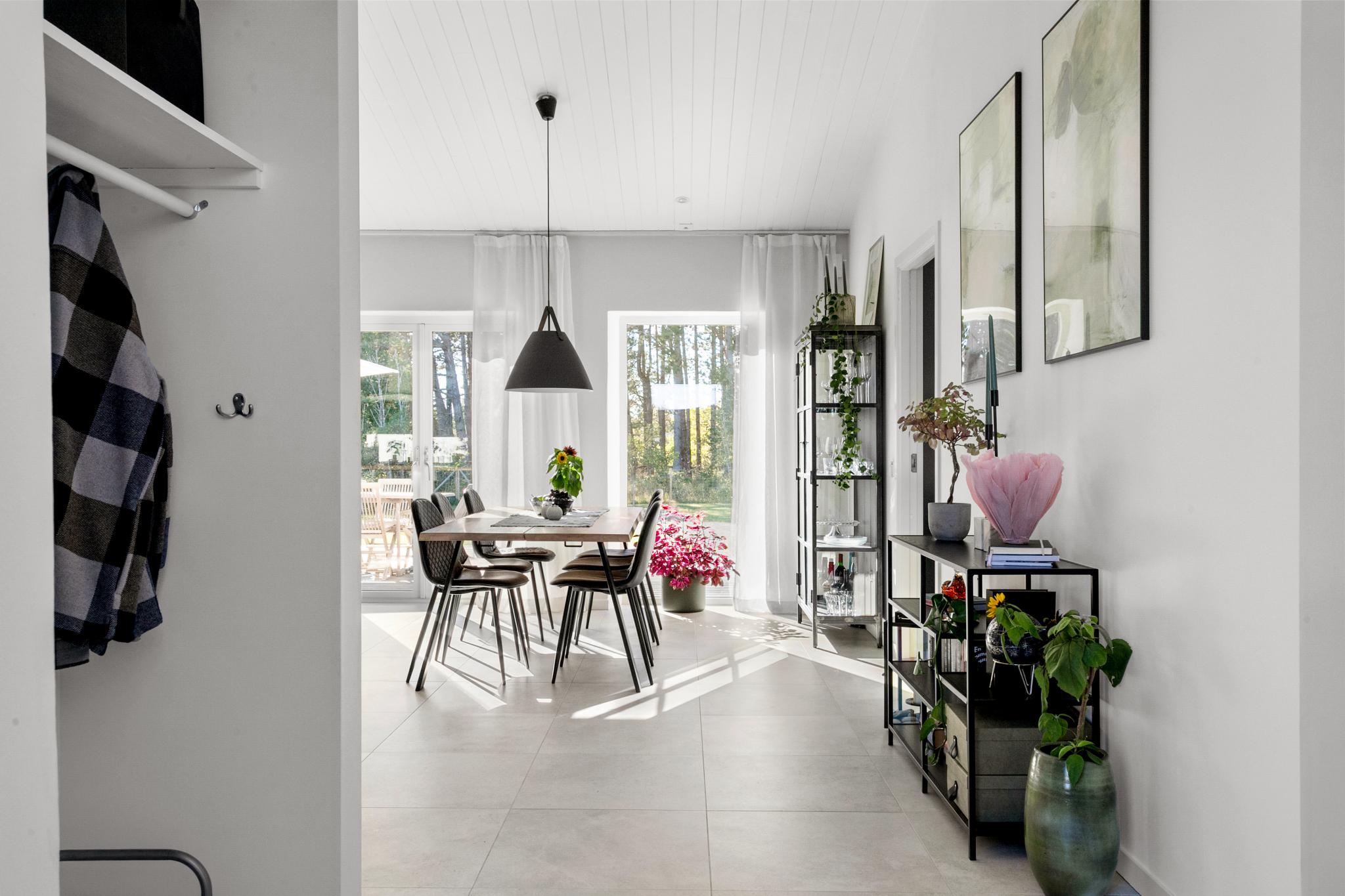 Välkommen till ett mycket trevligt hus med många fördelar. Huset har en tilltalande öppen planlösning med kök och allrum som bjuder in till både umgänge och avkoppling. Rummet har ryggåstak med 3,60 m till nock vilket ger en skön och luftig känsla. Alla rum har vattenburen golvvärme, smakfulla färgval och fönsterbänkar av gotländsk kalksten. Putsade väggar och klinkergolv i alla rum utom sovrummen som har ekgolv. Belysning i form av dimbara spotlights och dessutom minispotlights i alla fönster gör det extra trivsamt. Modernt med ljusstyrning från Plejd via app i mobilen och förberett för högtalare i taket i allrummet.