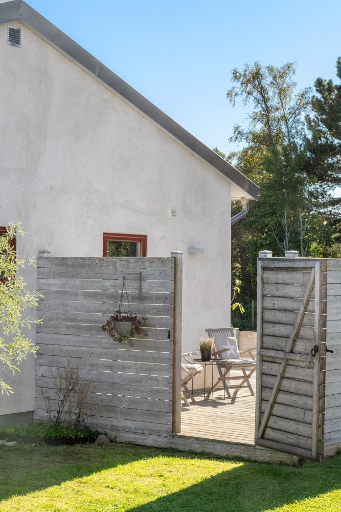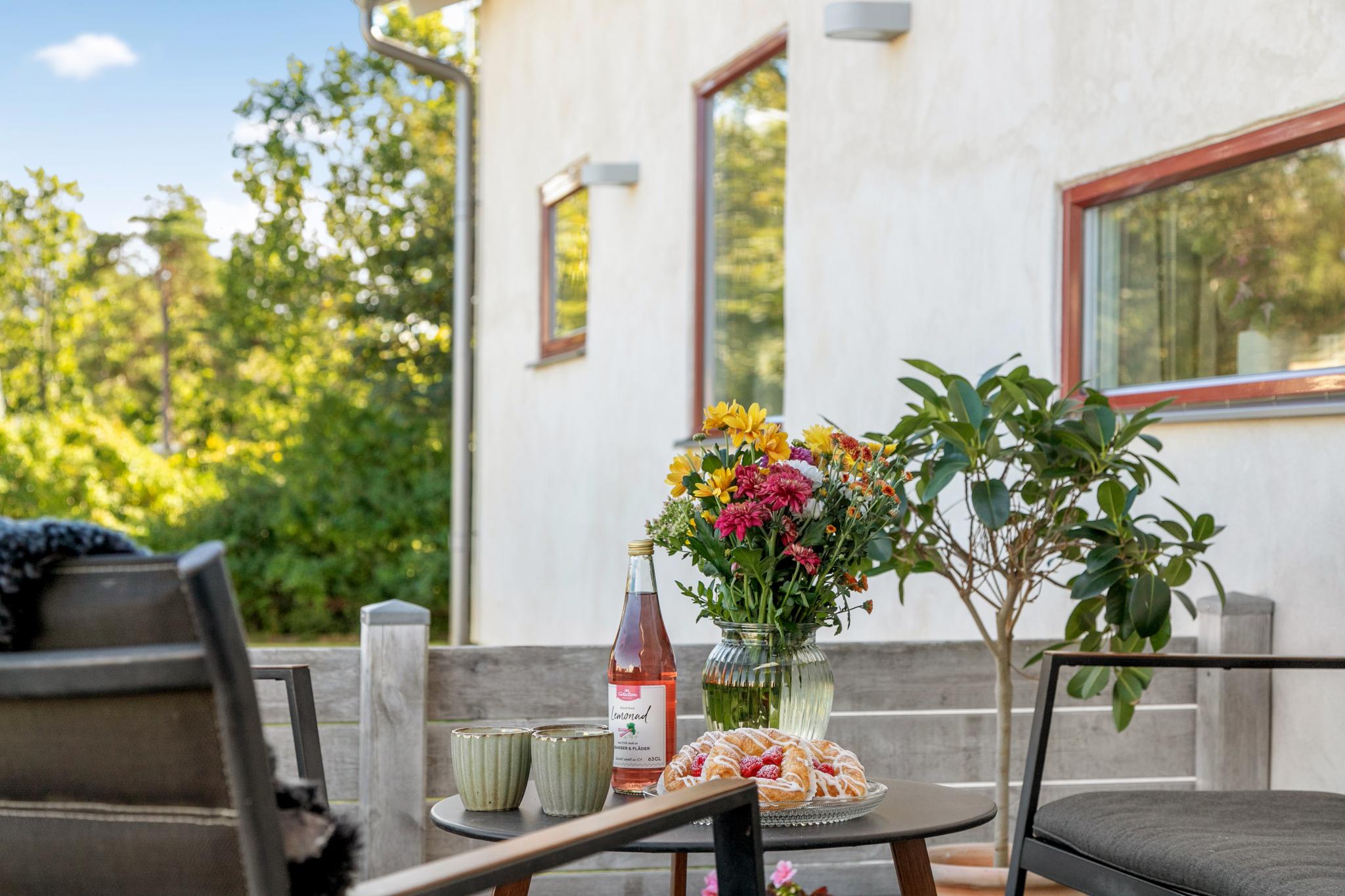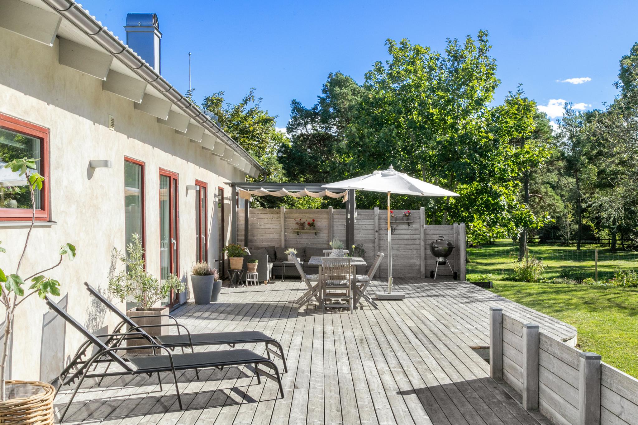 På husets soliga baksida finns en stor altan i trä (Organowood) i vinkel runt huset. Uteplatsen är underbart stor och fint inramad. Här finns plats för både solstolar, loungemöbler och trädgårdsmöbler. Perfekt för lata sommardagar eller sköna grillkvällar. På huset framsida finns en skyddad altan i anslutning till entrén. Här njuter du av frukost i morgonsolen eller om solens strålar på baksidan blir för varma.