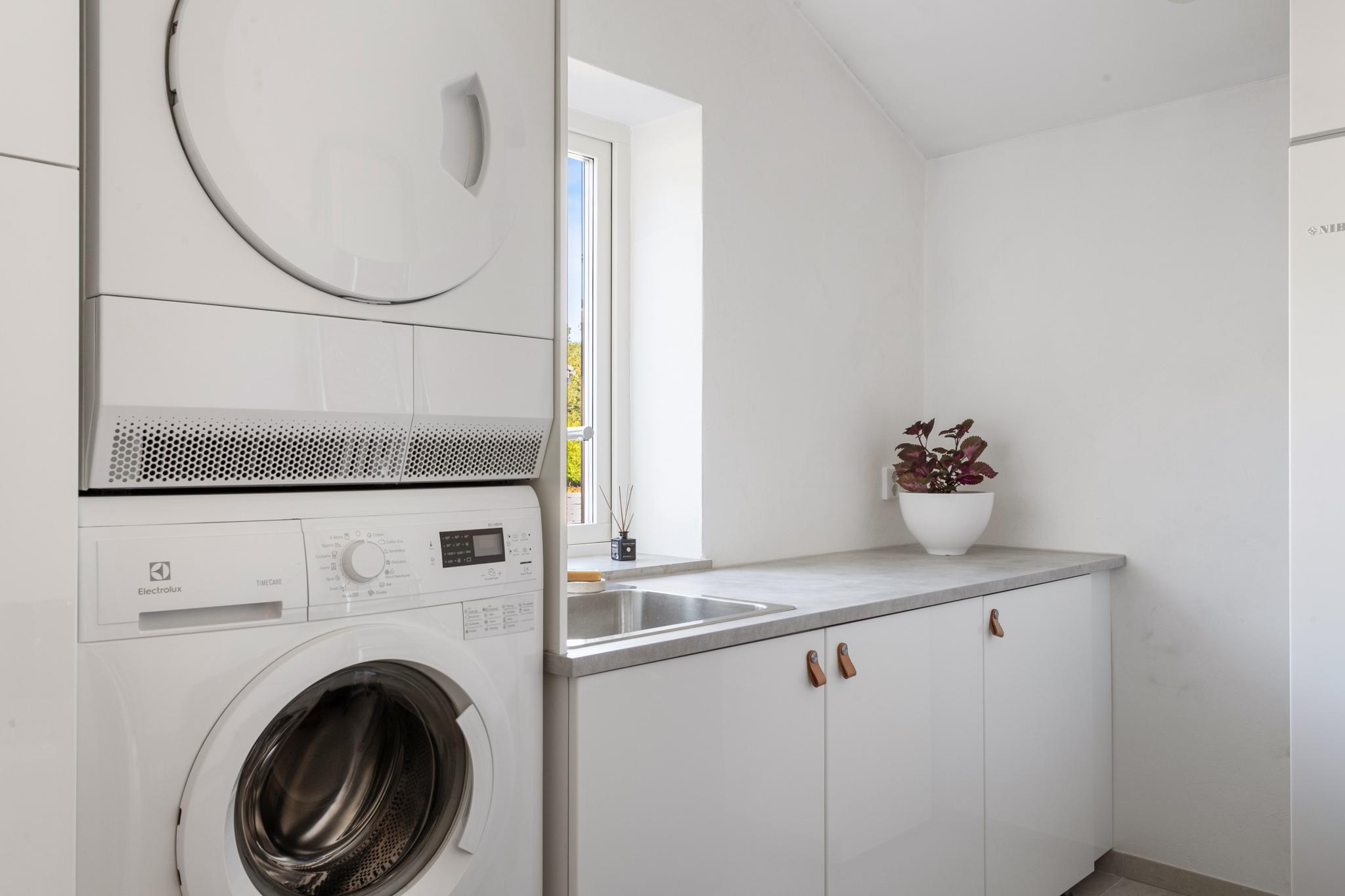Ljus och praktisk tvättstuga med fönster och bra förvaring i skåp. Lucka till vind med ytterligare utrymme för förvaring. I tvättstugan är även frånluftsvärmepumpen placerad samt skåp för teknik (golvvärme, el och fiber).