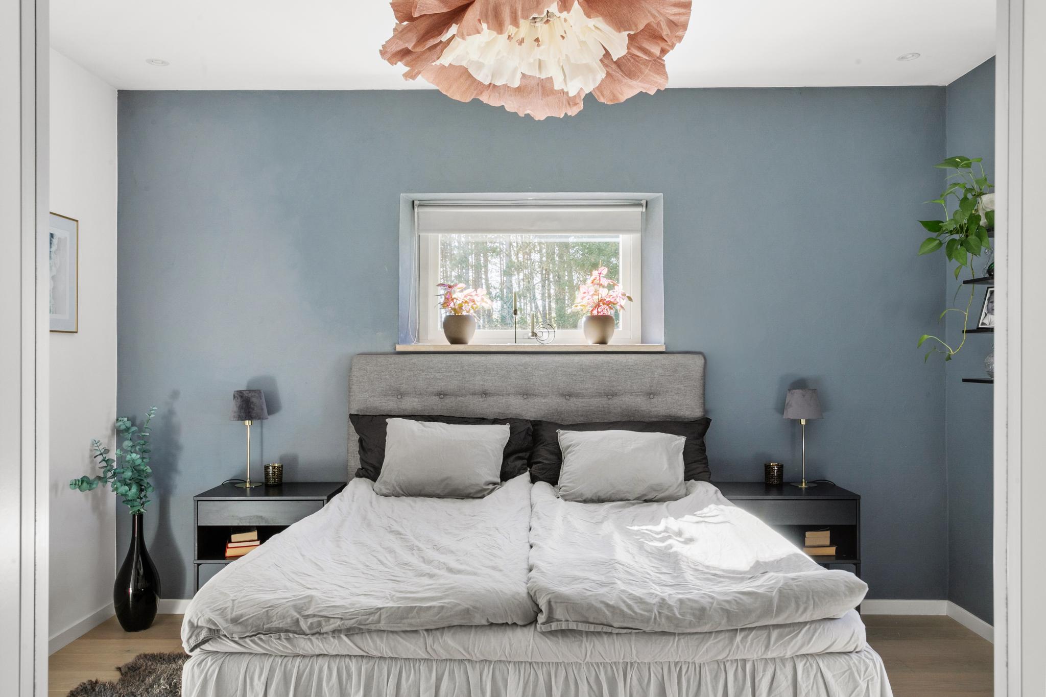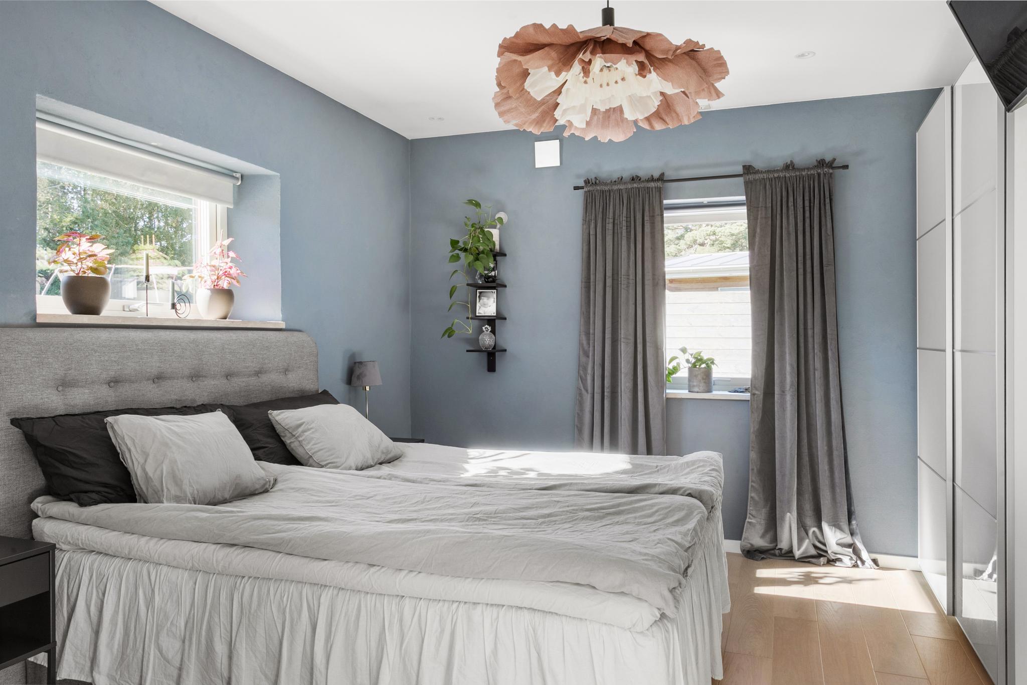 Stort och fint sovrum med väggfast TV och bra förvaring i garderober med skjutdörrar. Rummet har fönster åt två håll och direktaccess till badrum.