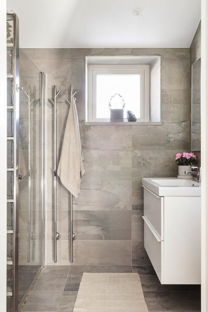 Stilrent badrum med klinker på både golv och väggar i smakfull beigegrå nyans. Rummet är stort och har både badkar och rymlig dusch med glasdörr och vägg av glasbetong. Golvvärme, vädringsfönster och dimbara spotlights gör det extra trevligt.