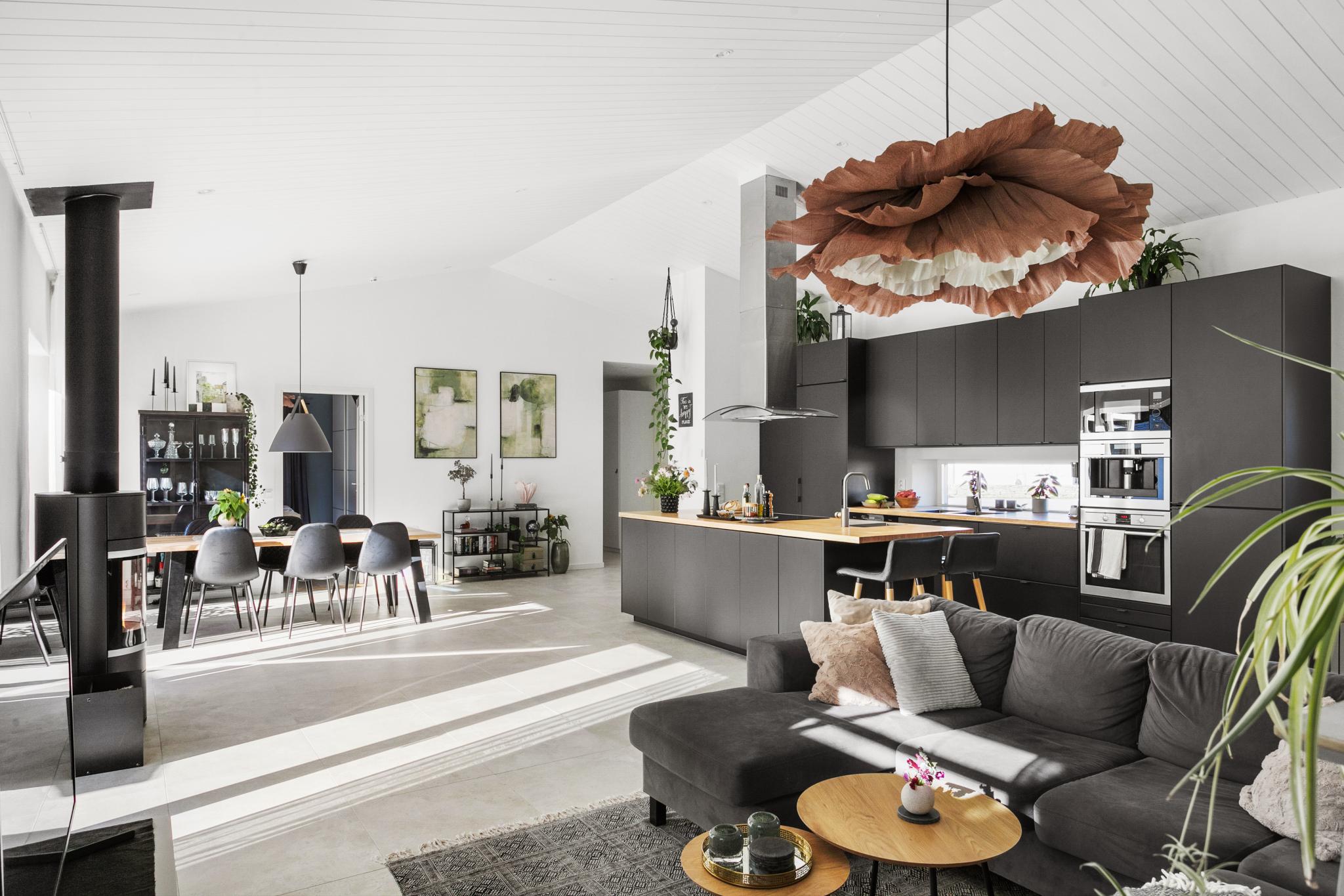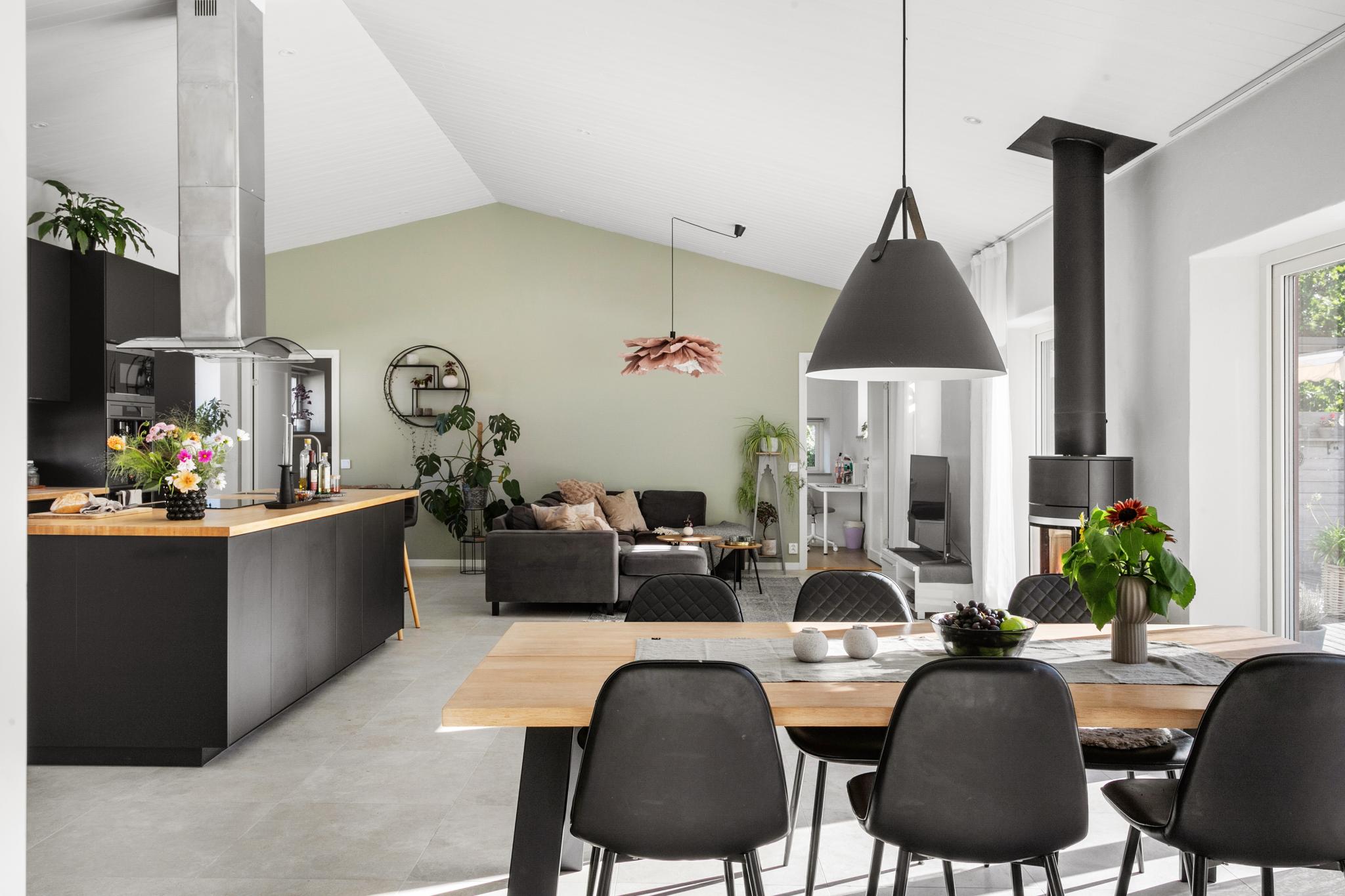 Underbart stort rum med kök, matplats och vardagsrum i härlig öppen planlösning. Rummet blir hemmets naturliga samlingspunkt med fina sällskapsytor och värmande braskamin. Två stora höga fönster och två dubbla fönsterdörrar ut mot altanen ger fint ljusinsläpp. Här njuter du av utsikten över trädgården och naturen.