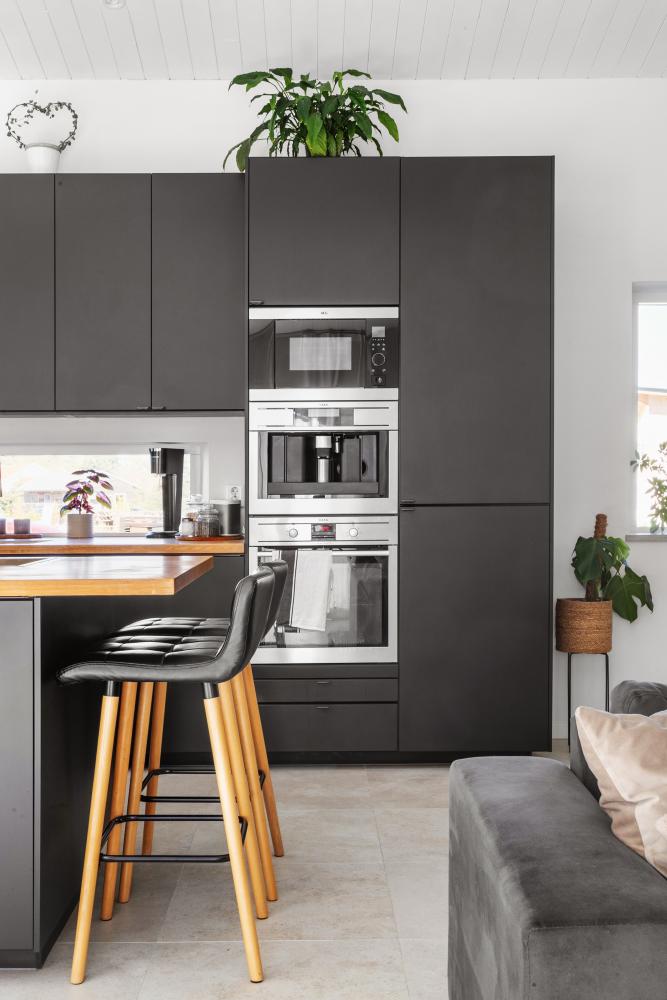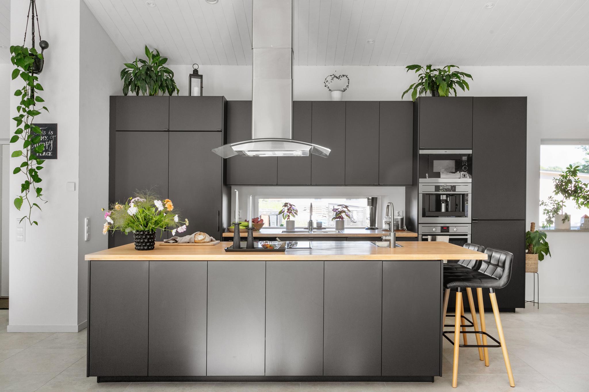 Köket är stilrent med matta luckor i mörkgrå kulör, bänkskivor i ask och rostfria vitvaror. Köket är väldisponerat och har ett smalt fönster mot huset framsida. Det finns en fin köksö i samma färg med induktionshäll, extra vask för smidig matlagning och förvaring. Här finns även sköna sittplatser för vänner att slå sig ner medan maten lagas.