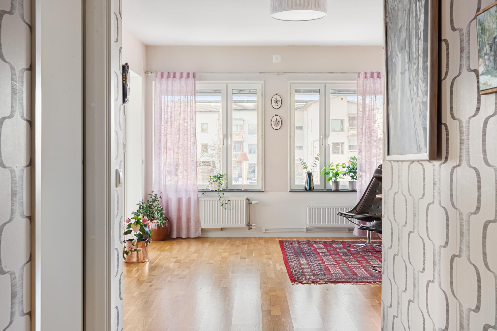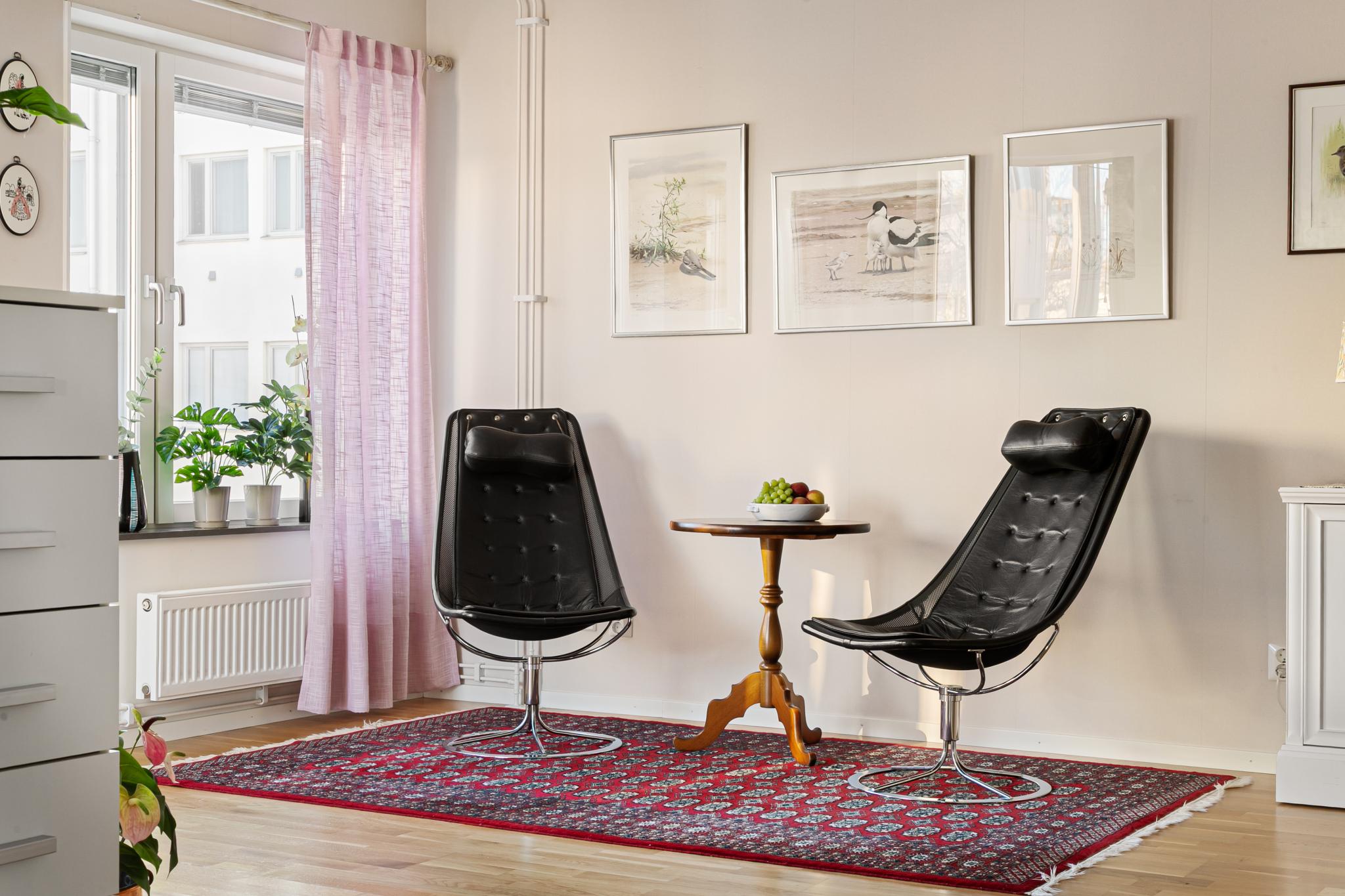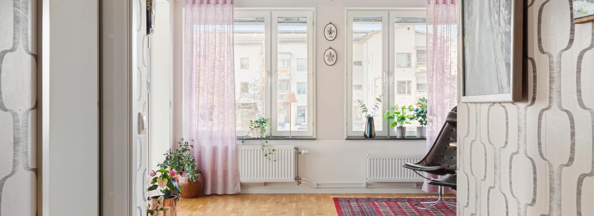 Fint vardagsrum med två stora fönster och utgång till den inglasade balkongen.