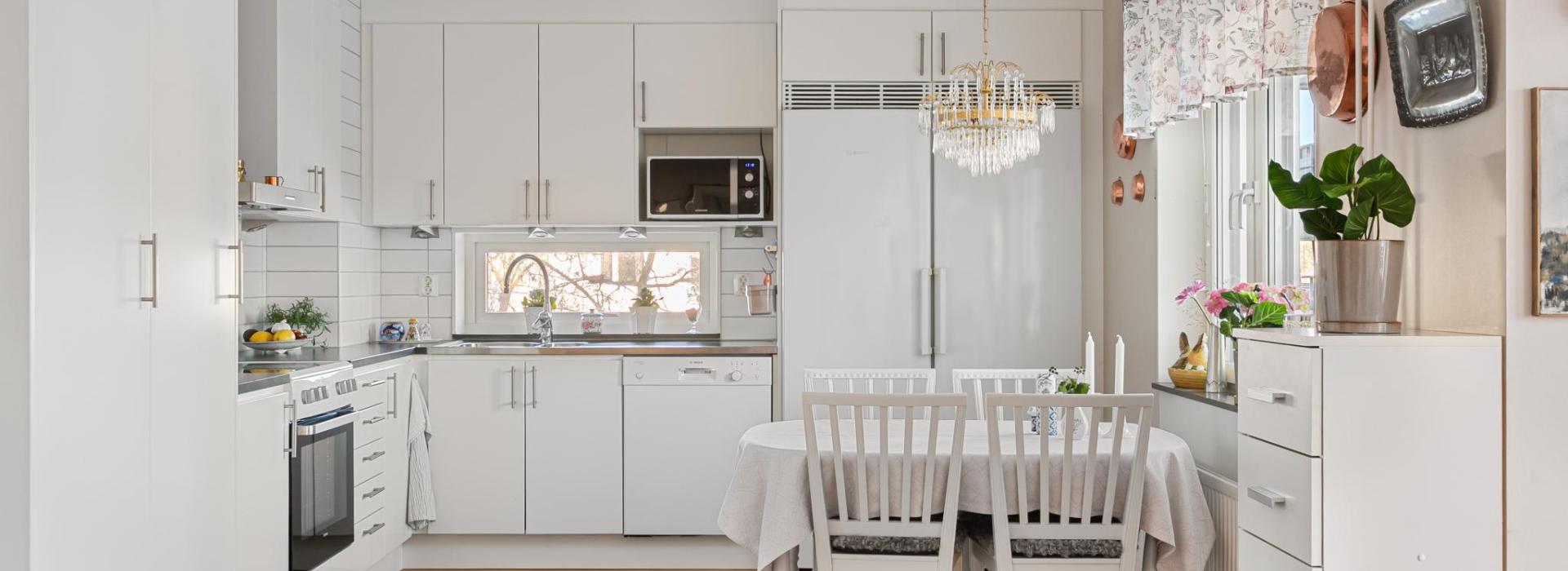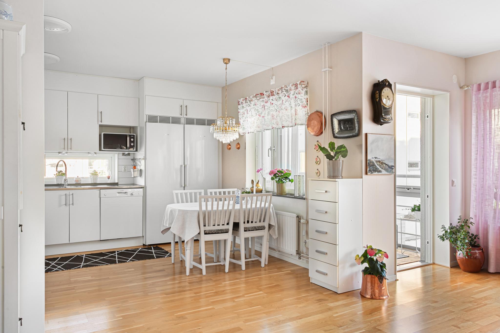 Kök och vardagsrum med öppen planlösning. Köket har en trivsam matplats vid fönster mot balkongen. Köket är fint och stilrent med vita skåpluckor, vitt kakel och gråa bänkskivor. Trevligt ljusinsläpp från fönster över arbetsbänken. Utrustning: städskåp, hällspis, spisfläkt, inbyggd mikrovågsugn, diskmaskin, kyl/frys och städskåp.