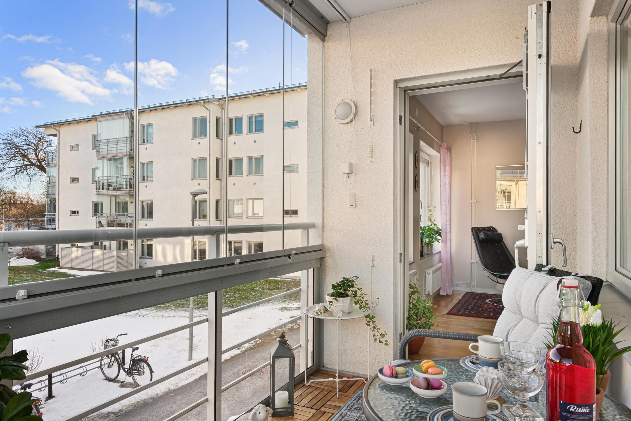 Inglasad balkong som du kan nyttja från tidig vår till sent på hösten.