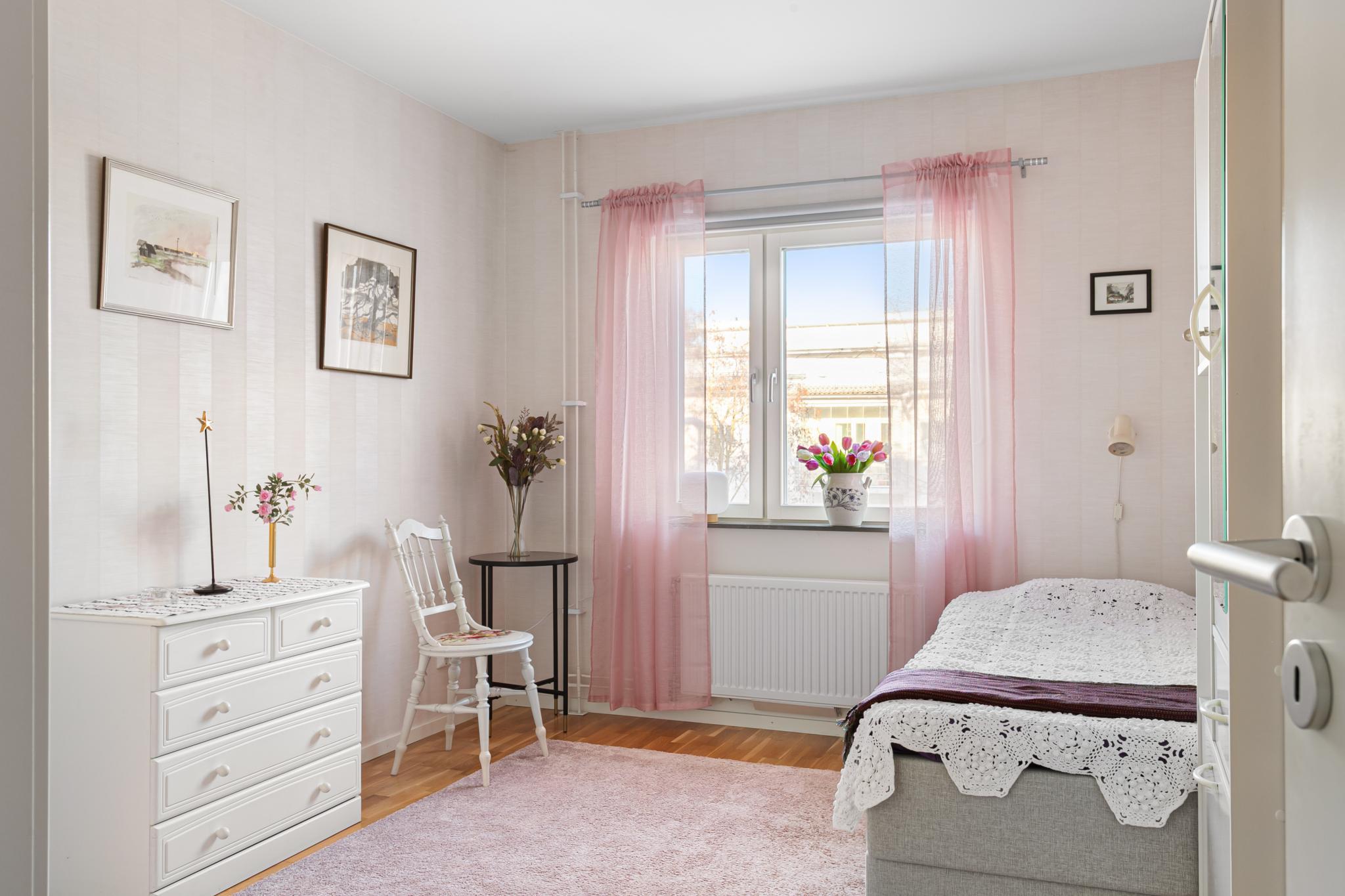 Sovrum med gott om förvaring i två garderober och ett linneskåp.