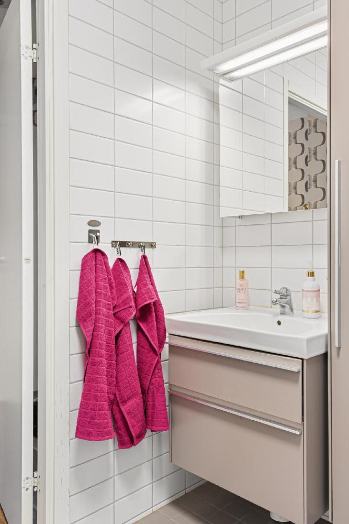 badrummet har förutom tvättkommod och badrumsskåp ett högskåp för bra förvaring