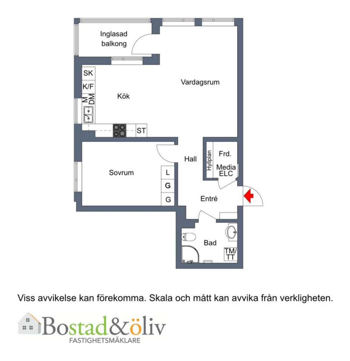 Samtliga areauppgifter är hämtade från bostadsrättsföreningen eller baserade på säljarens information. Dessa uppgifter kan av olika anledningar vara fel. Den köpare som tycker att arean har betydelse för köpet bör därför vidta en uppmätning.