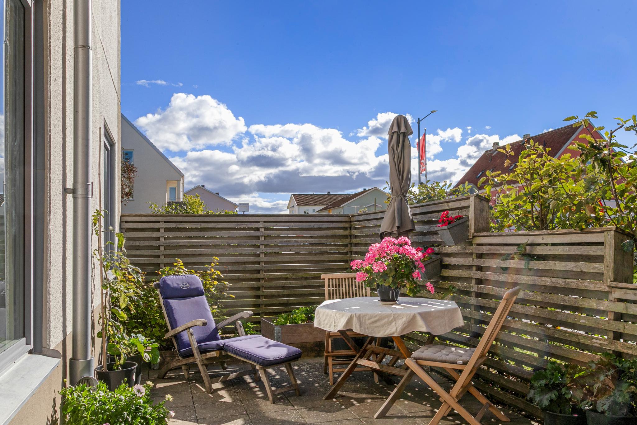 Stor stenlagd och insynsskyddad uteplats med sol hela dagen. Uteplatsen nås från köket och är fint inramad med staket och grind. Den andra skyddade uteplatsen har nordostläge. Här njuter du av morgonkaffe i solsken eller svalkande stunder varma sommardagar.