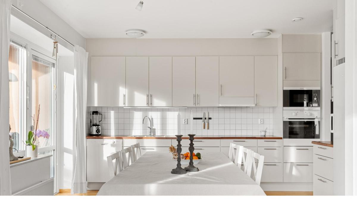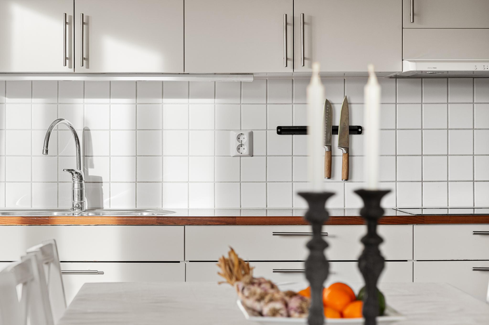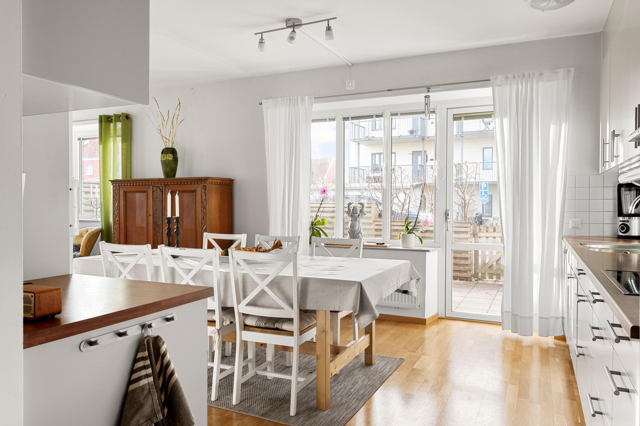 Trevligt kök med fint ljusinsläpp och plats för stort matbord och många gäster. Köket är stilrent med ljusa skåpluckor, vitt kakel och mörk bänkskiva. Stort fönster och fönsterdörr till uteplats.