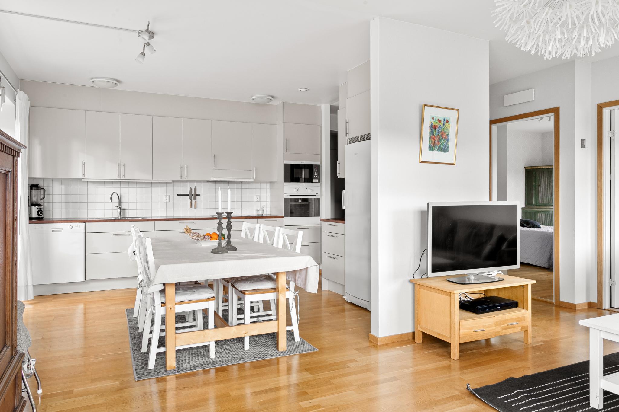 Till lägenheten hör ett rymligt vindsförråd som nås via hiss eller trappa.