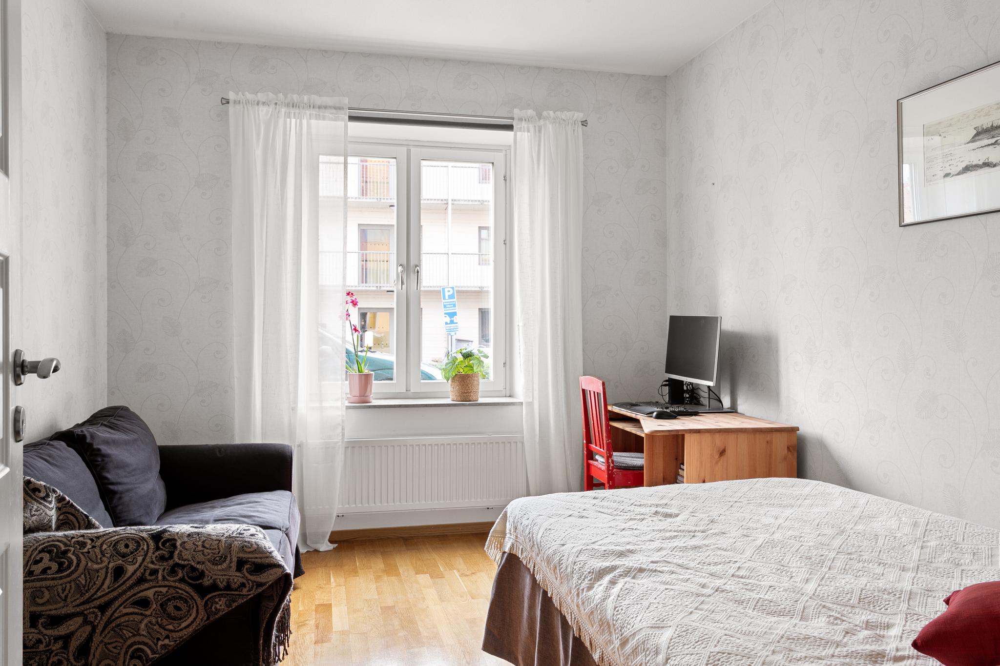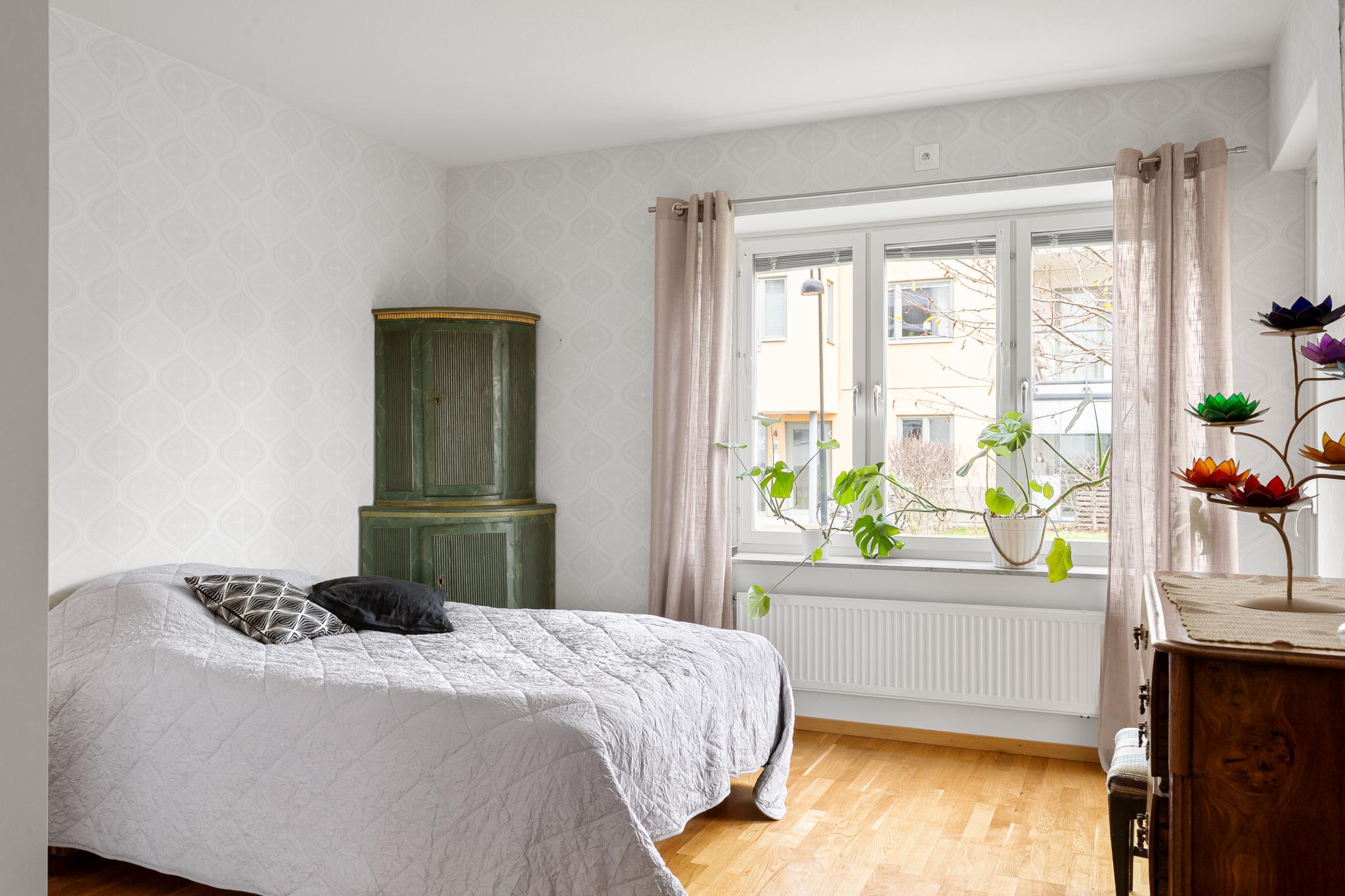 Stort sovrum med plats för dubbelsäng. Rummet har bra förvaring bakom skjutdörrar. Stort fönster och utgång till uteplats via fönsterdörr.