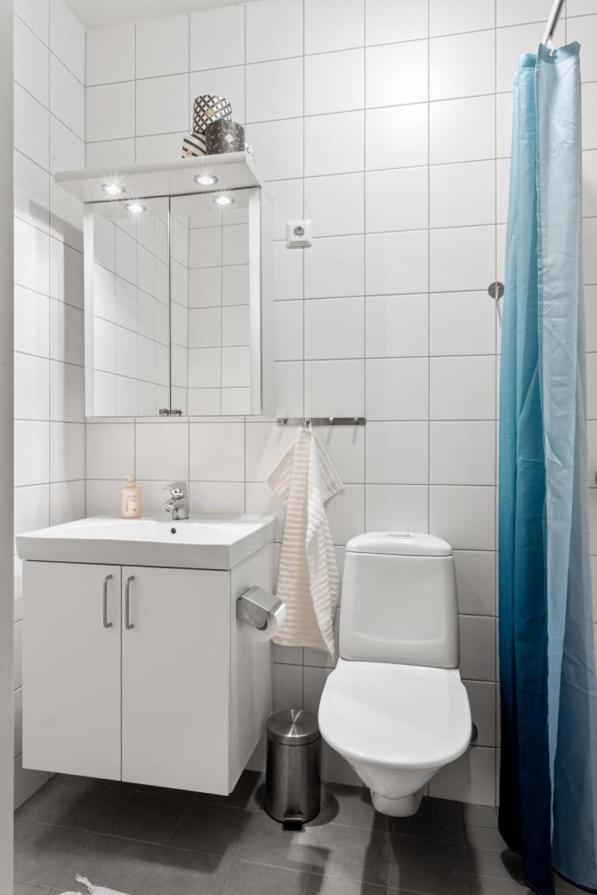Utrustning: tvättkommod, spegelskåp, vägghängd wc och dusch.