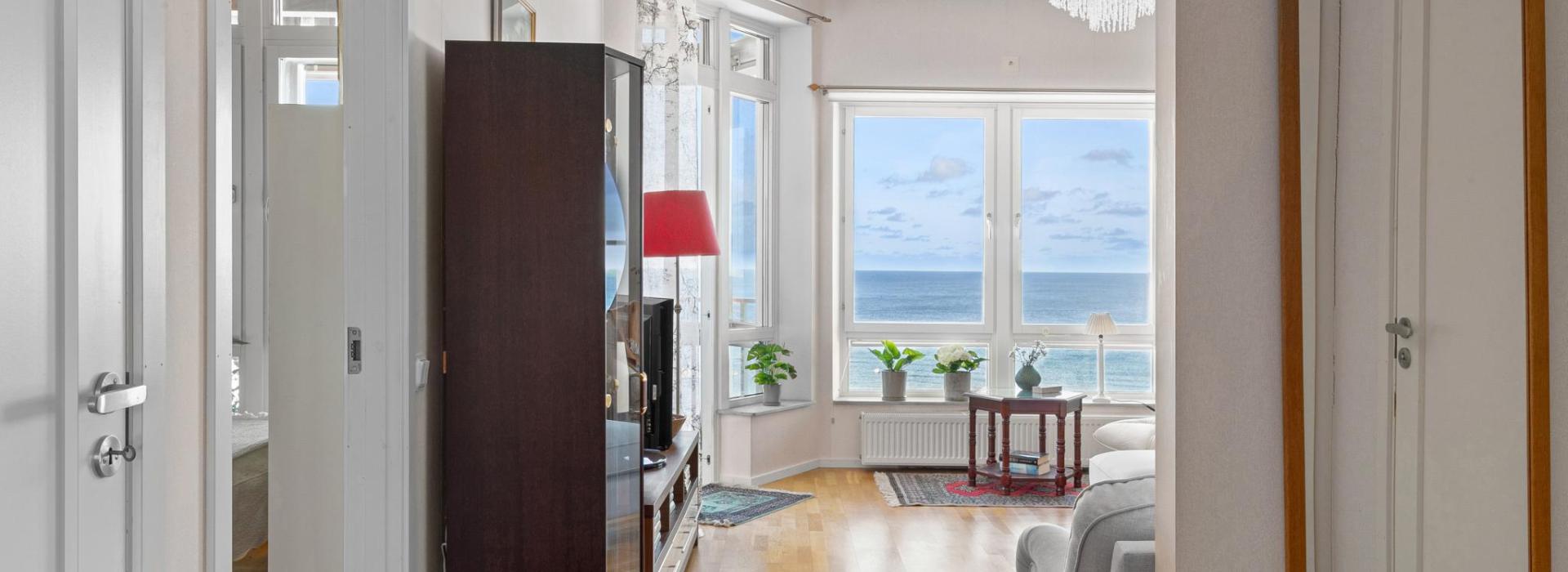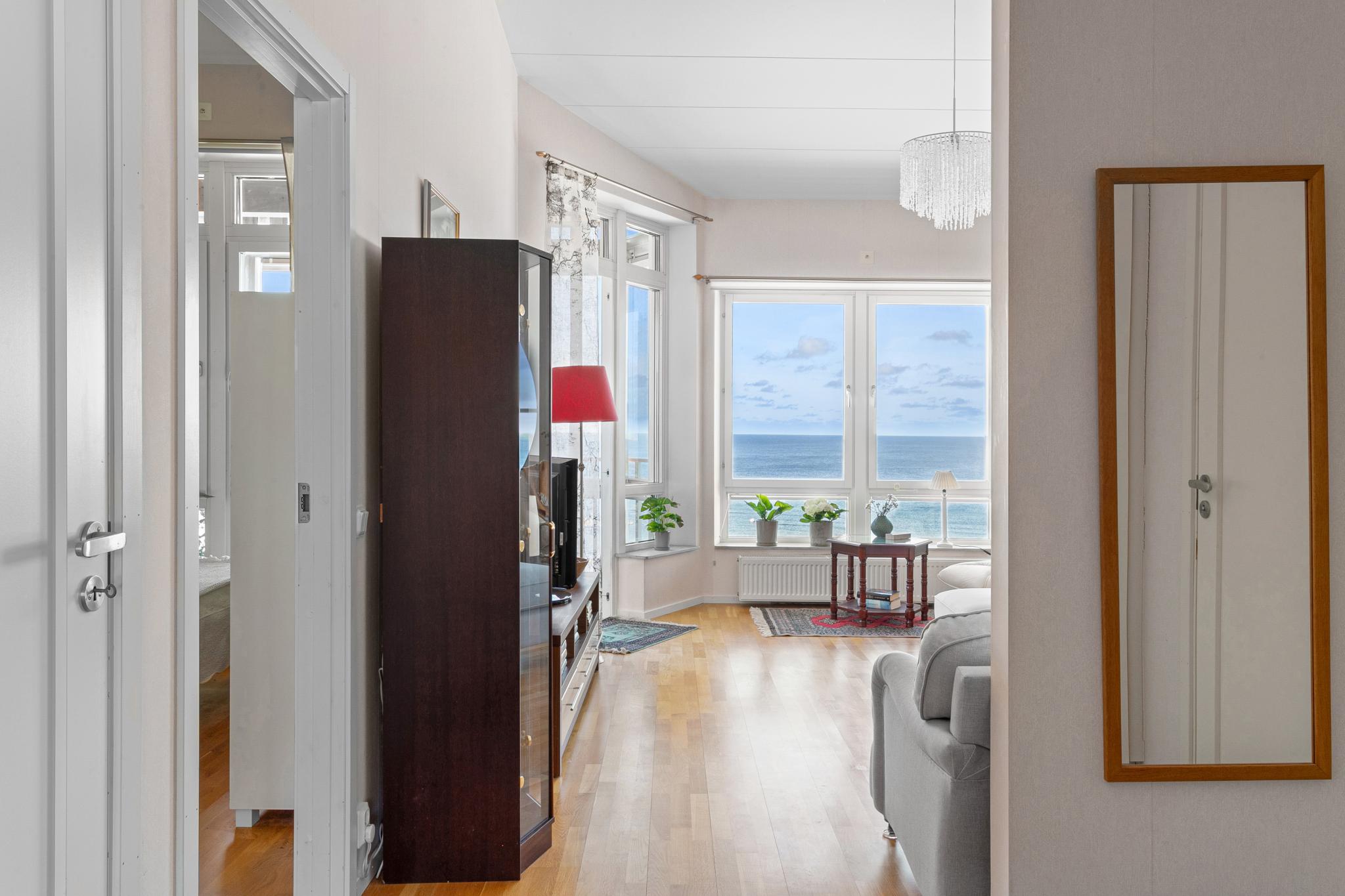 Redan i entrén möts du av det härliga ljusinsläppet och utsikten mot havet och horisonten. Takhöjden på nästan 3,30 m ger lägenheten en härlig rymd. Hela lägenheten har ett fint ekparkettgolv utom i hallen där ett stryktåligt klinkergolv ligger.