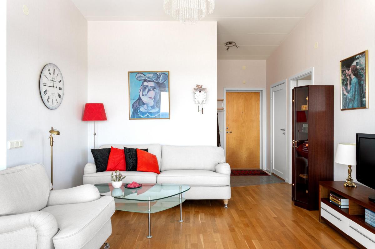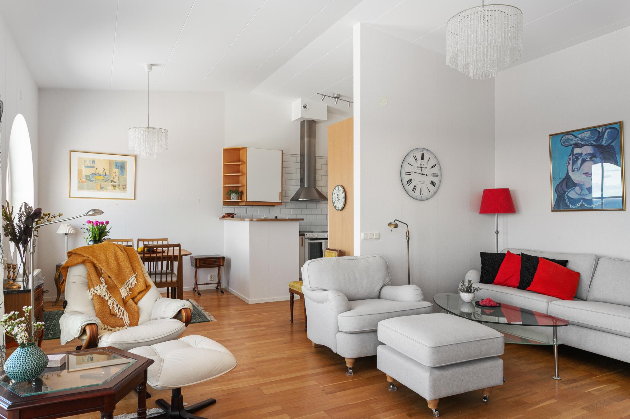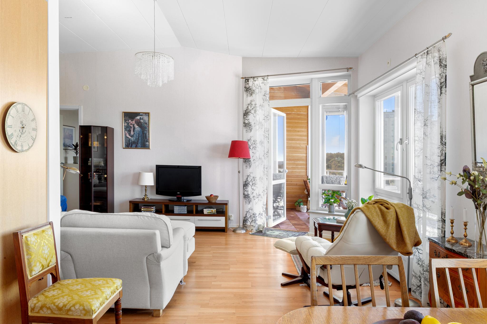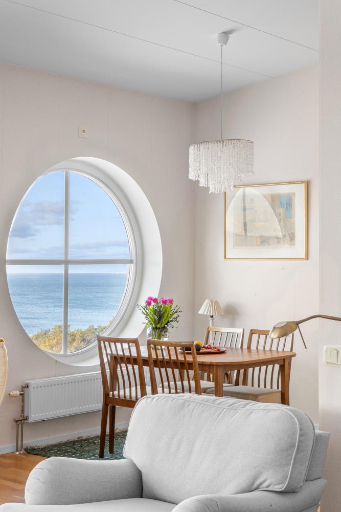 Vardagsrummet flödar av ljus och ligger i öppen planlösning mot köket. Stora fönster med fantastisk utsikt och utgång till balkong. Rummet har en vardagsrumsdel och en matplats vid stort runt fönster.