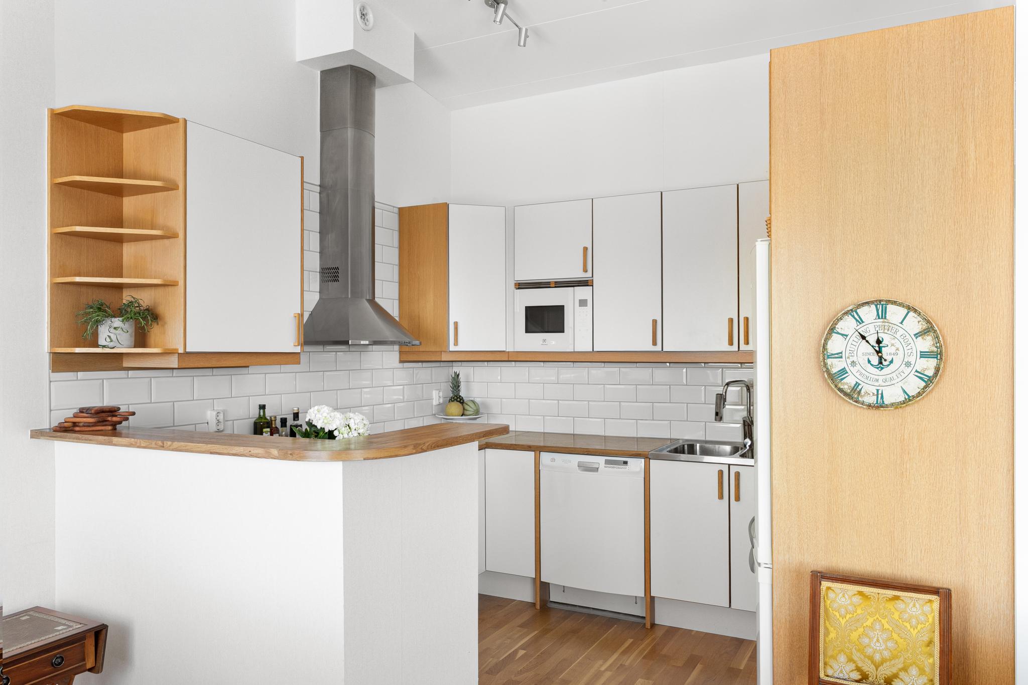 Ljust och praktiskt kök i vinkel med bardisk. Köket som är från byggåret har vita släta skåpluckor med detaljer av ek och stänkskydd av vitt kakel. Köket är utrustat med spis med häll och varmluftsugn, fläktkåpa, diskmaskin, inbyggd mikrovågsugn och kyl/frys.