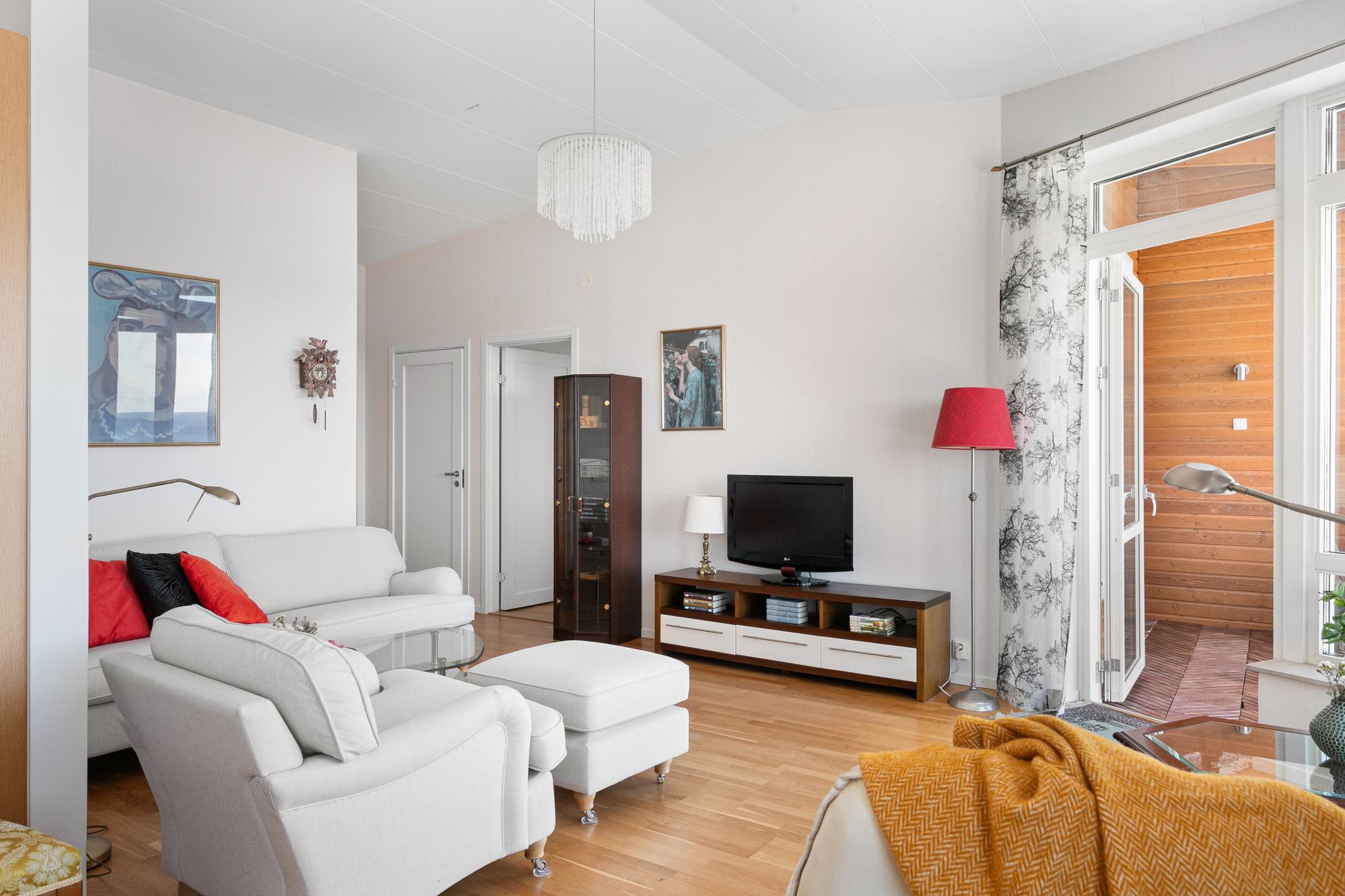 Vardagsrum mot balkong och sovrum