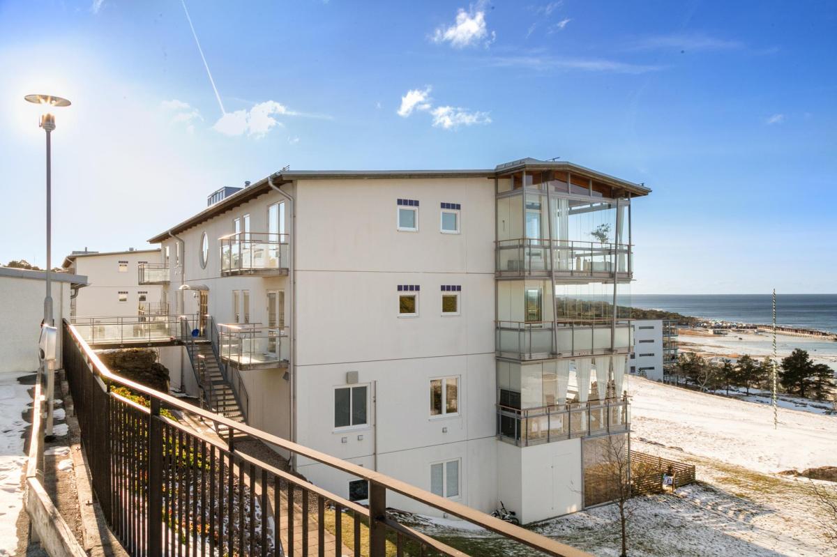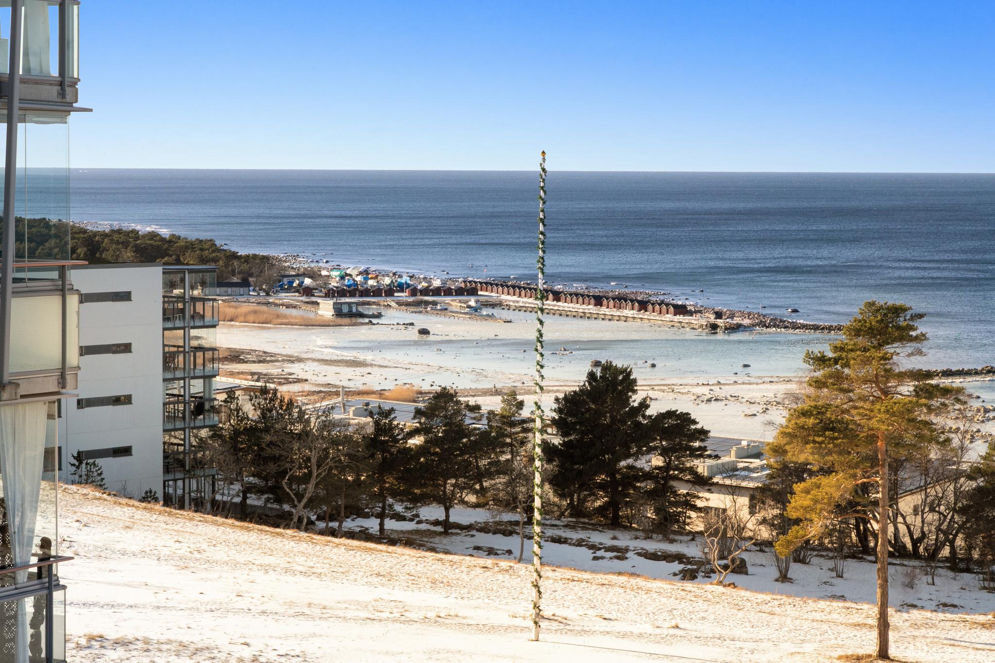 Välkommen till ett mycket fint boende med hänförande utsikt. Lägenheten ligger högst upp i huset med stora fönster, högt i tak och öppen planlösning. Från den inglasade balkongen och övriga rum njuter du av havets skiftningar under årets samtliga årstider. Fantastiska solnedgångar njuter du av året runt! Här bor du bekvämt på en lugn återvändsgata med hiss och förråd i huset och nära till parkering eller garage. Tillgång till fin gemensamhetslokal med övernattningsmöjlighet, bastu och balkong med vacker utsikt. Underbar natur med vackra promenadstråk runt knuten, kort promenad till bad och hav samt gångavstånd till flygplatsen. Snabbt tillträde möjligt för dig som önskar det.