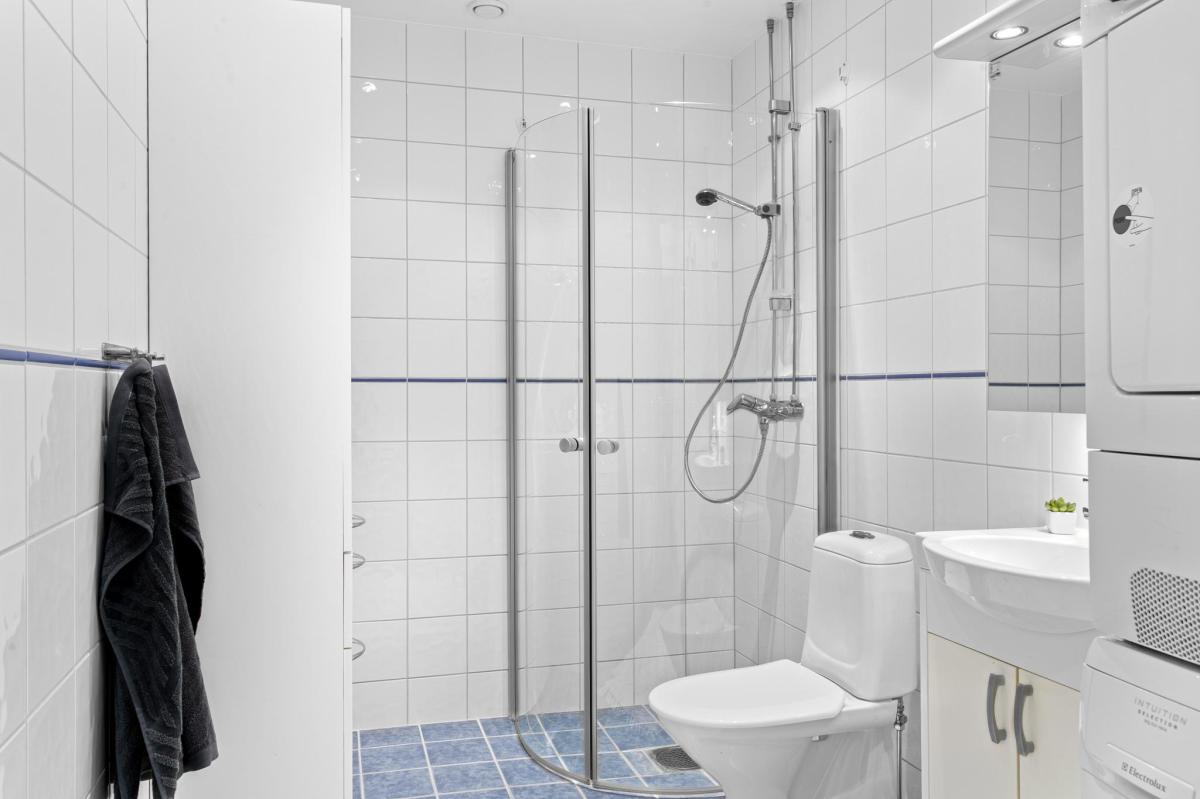 Badrum med vita helkaklade väggar och blått klinkergolv. Badrummet är utrustat med dusch, wc, tvättkommod, badrumsskåp, tvättpelare med tvättmaskin och torktumlare samt handdukstork.