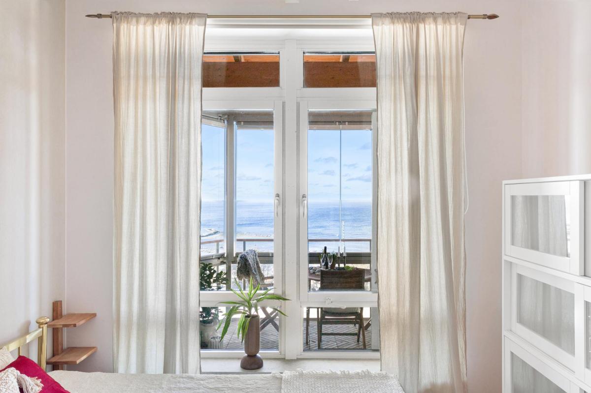 Sovrum med stora fönster mot balkongen och havet. Rummet har plats för dubbelsäng och två garderober. Här kan du vakna och se ut över himmel och hav från sängen.