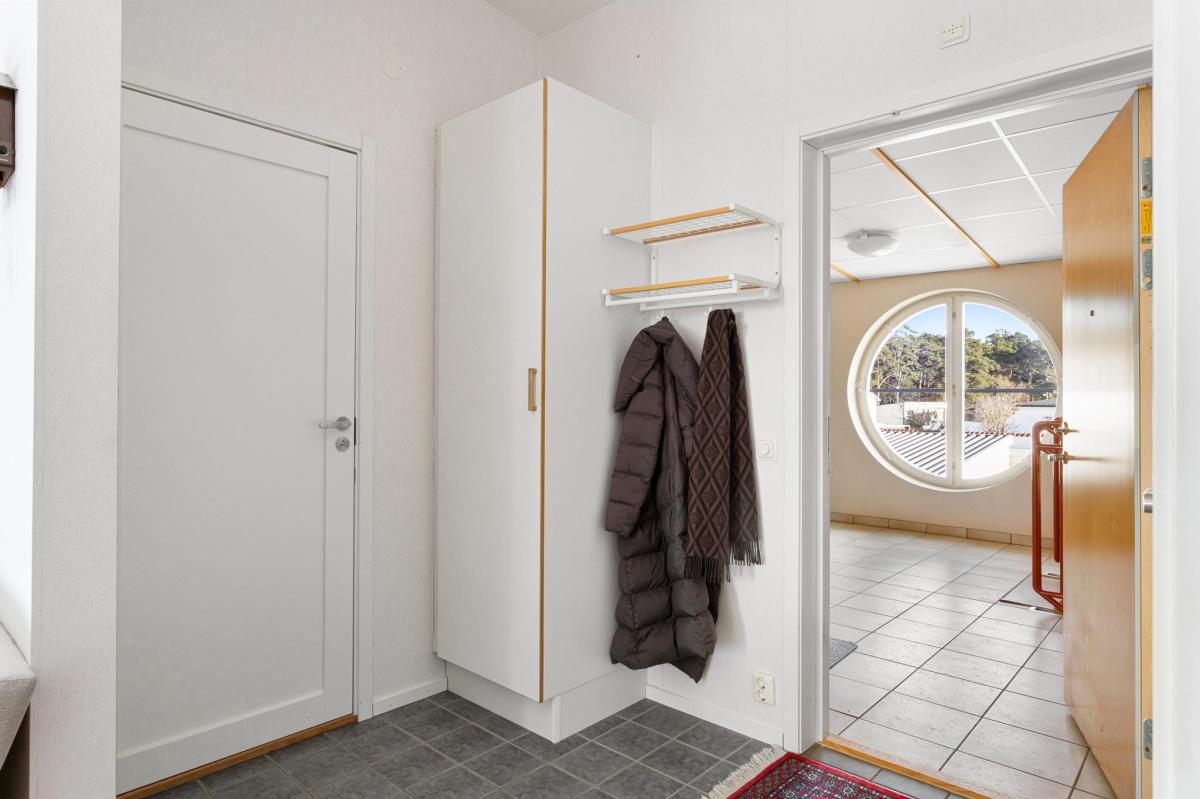 Entré med kapphänge och städskåp. Bra förvaring i klädkammare.