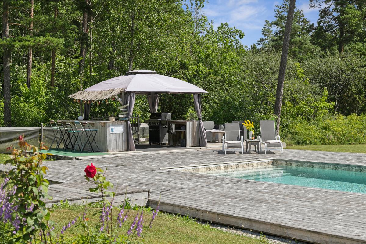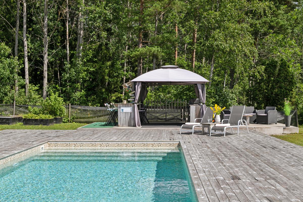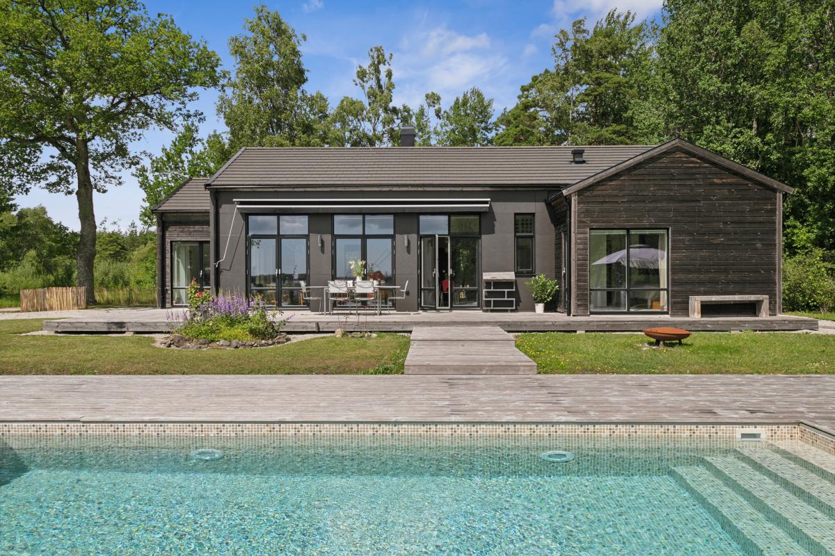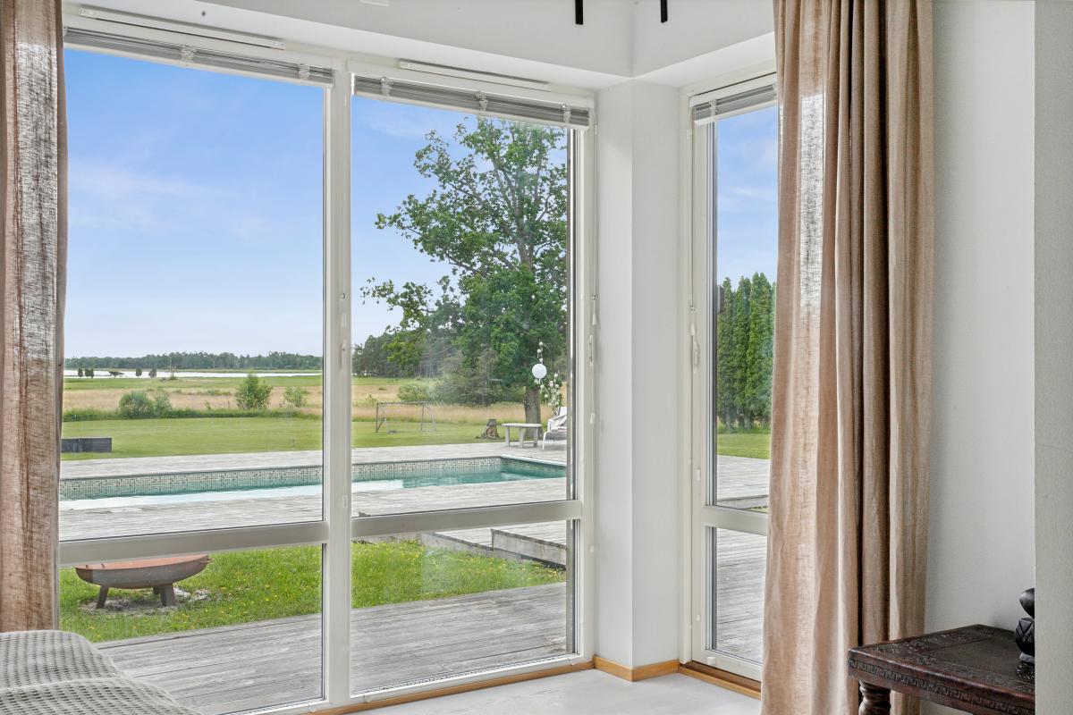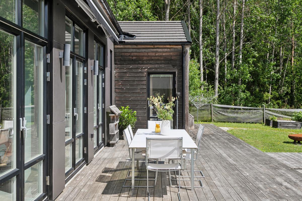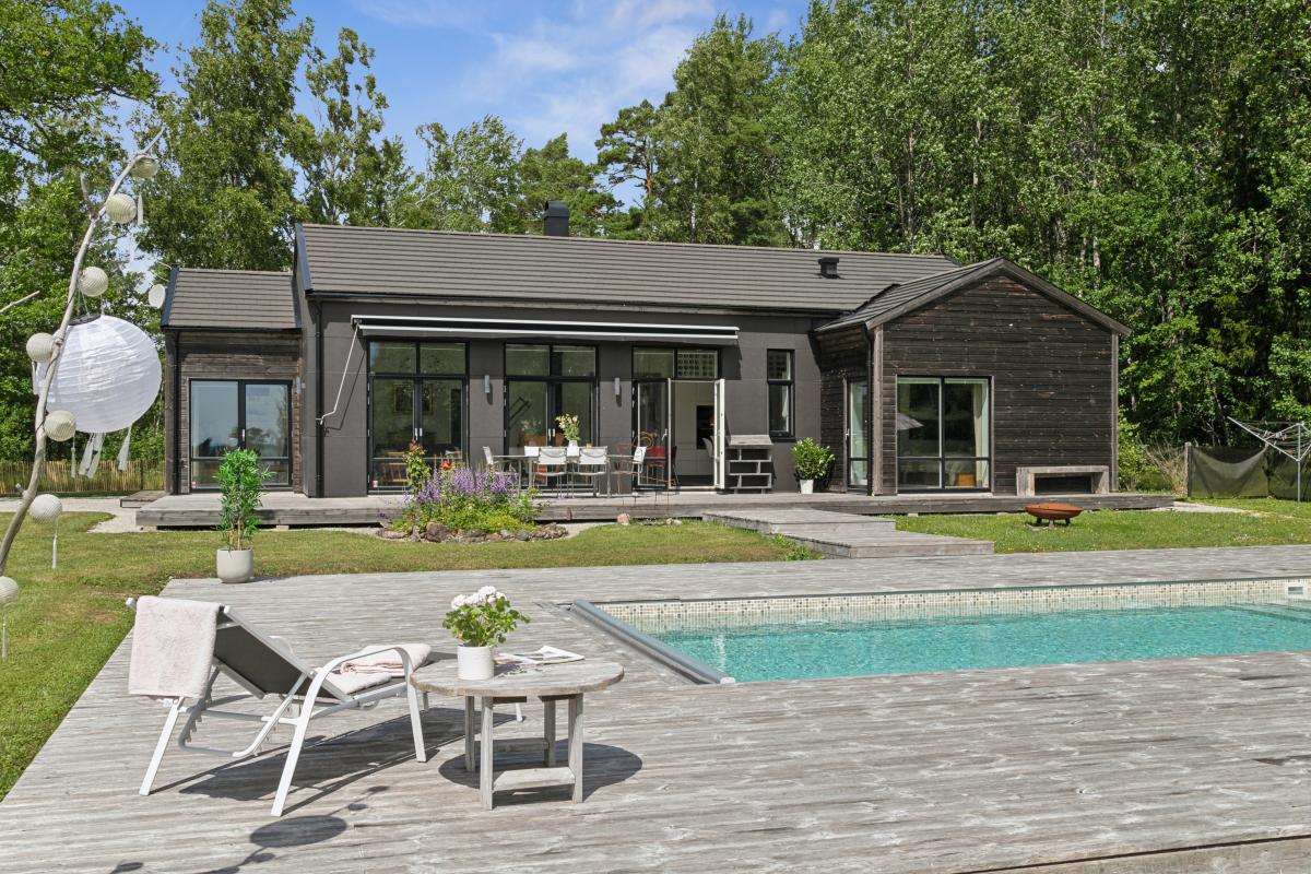 På husets baksida finns en stor härlig altan i solvänligt läge och underbar utsikt över trädgården, strandängarna och havet. Altanen är lättillgänglig från huset via totalt fem altandörrar varav tre dubbla. Från altanen når du enkelt det stora trädäcket och den uppvärmda poolen (4x8 m). En given mötesplats för både familj och vänner lata sommardagar. Vid husets entré finns en stenlagd uteplats, delvis under tak, som följs av en grusad uteplats. Uteplatserna är fint inramade och har eftermiddags- och kvällssol. Här finns plats för både loungemöbler och trädgårdsmöbler - perfekt för sköna grillkvällar.