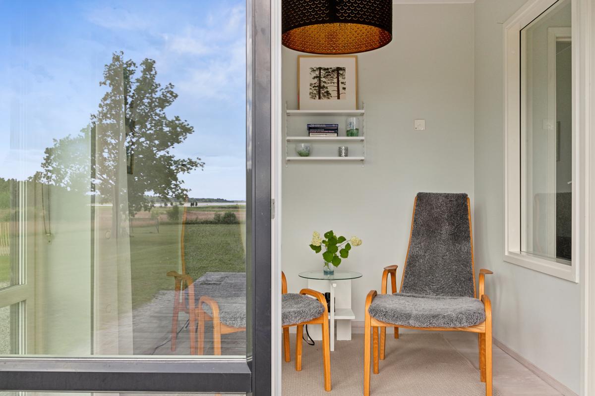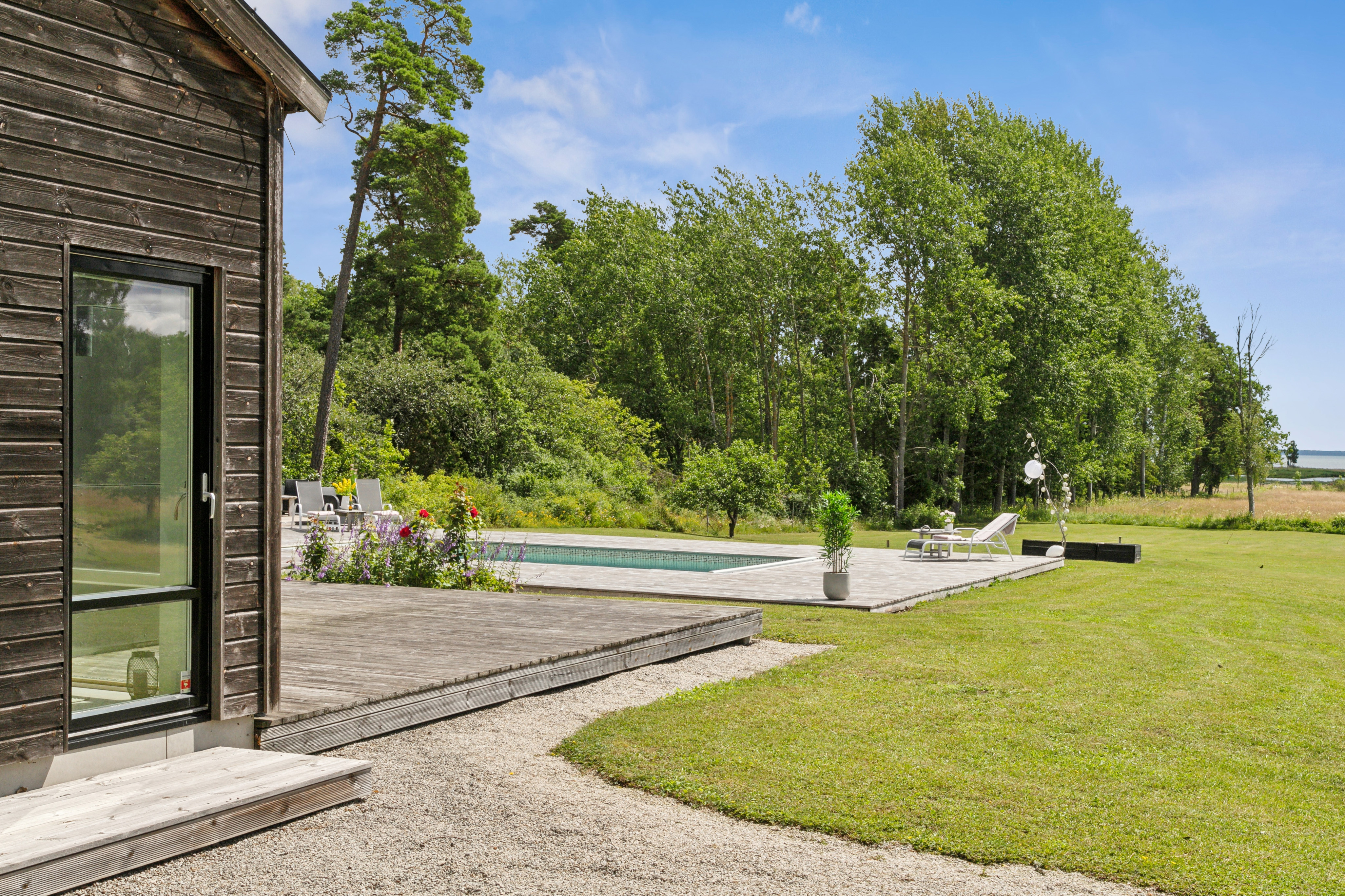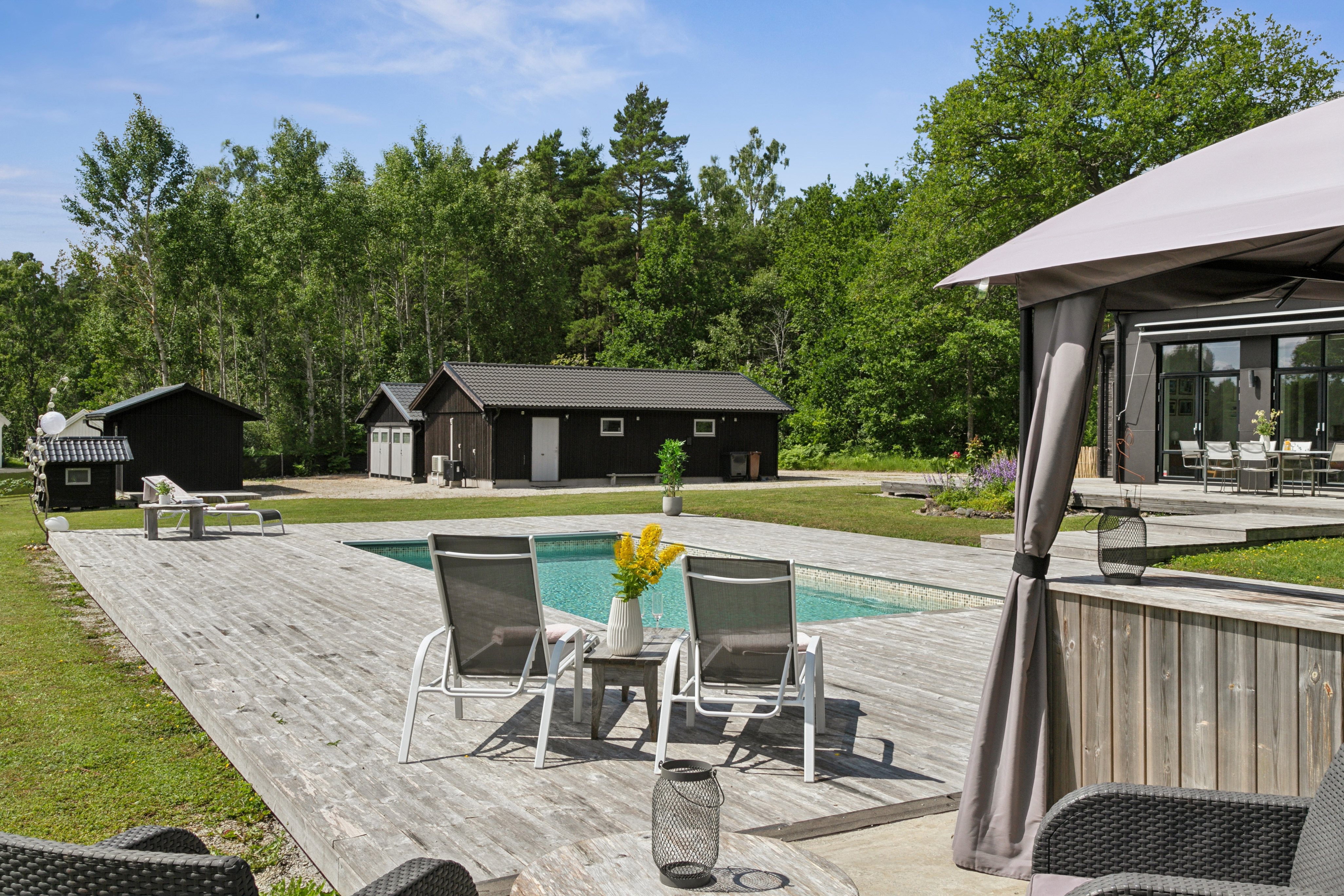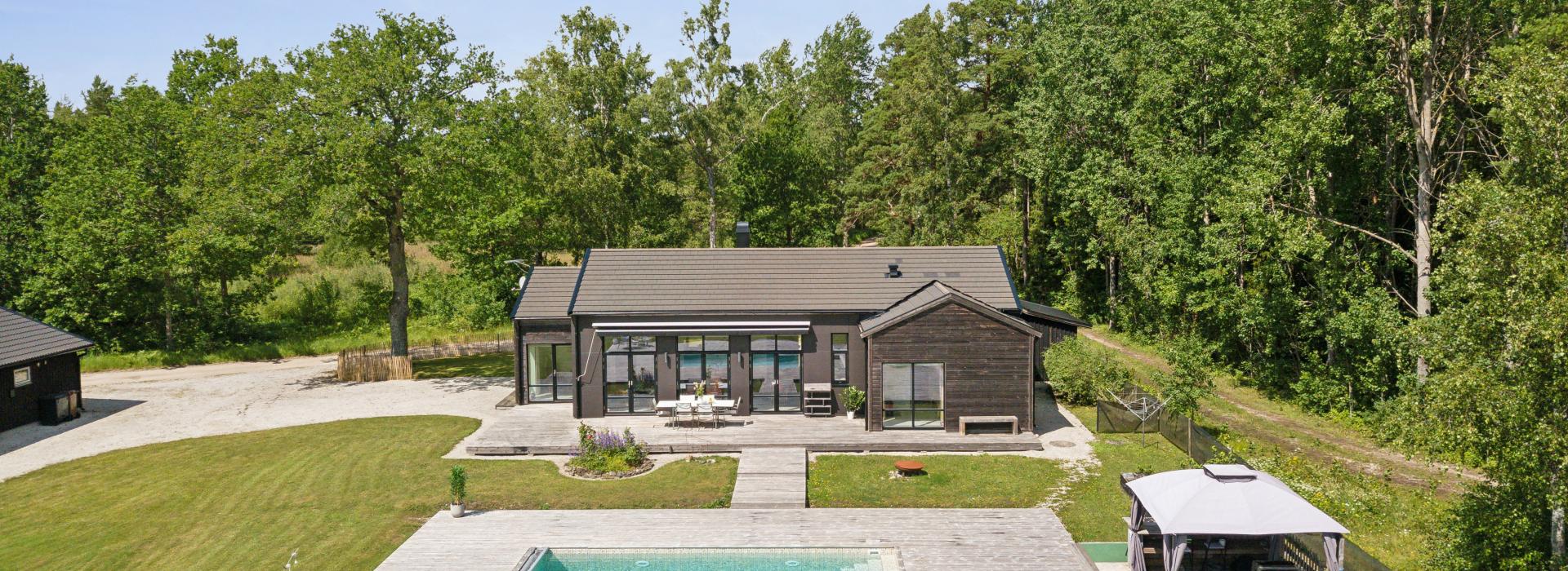 På husets baksida finns en stor härlig altan i solvänligt läge och underbar utsikt över trädgården, strandängarna och havet. Altanen är lättillgänglig från huset via totalt fem altandörrar varav tre dubbla. Från altanen når du enkelt det stora trädäcket och den uppvärmda poolen (4x8 m). En given mötesplats för både familj och vänner lata sommardagar. Vid husets entré finns en stenlagd uteplats, delvis under tak, som följs av en grusad uteplats. Uteplatserna är fint inramade och har eftermiddags- och kvällssol. Här finns plats för både loungemöbler och trädgårdsmöbler - perfekt för sköna grillkvällar.