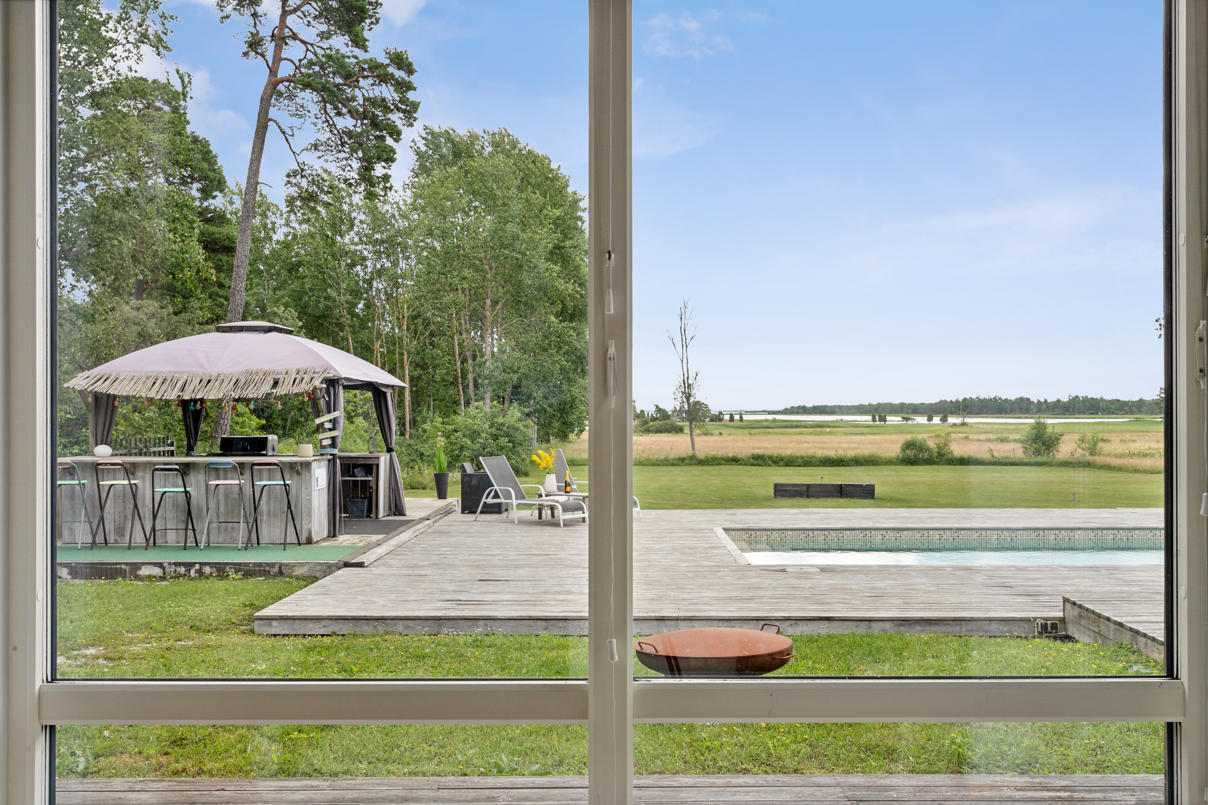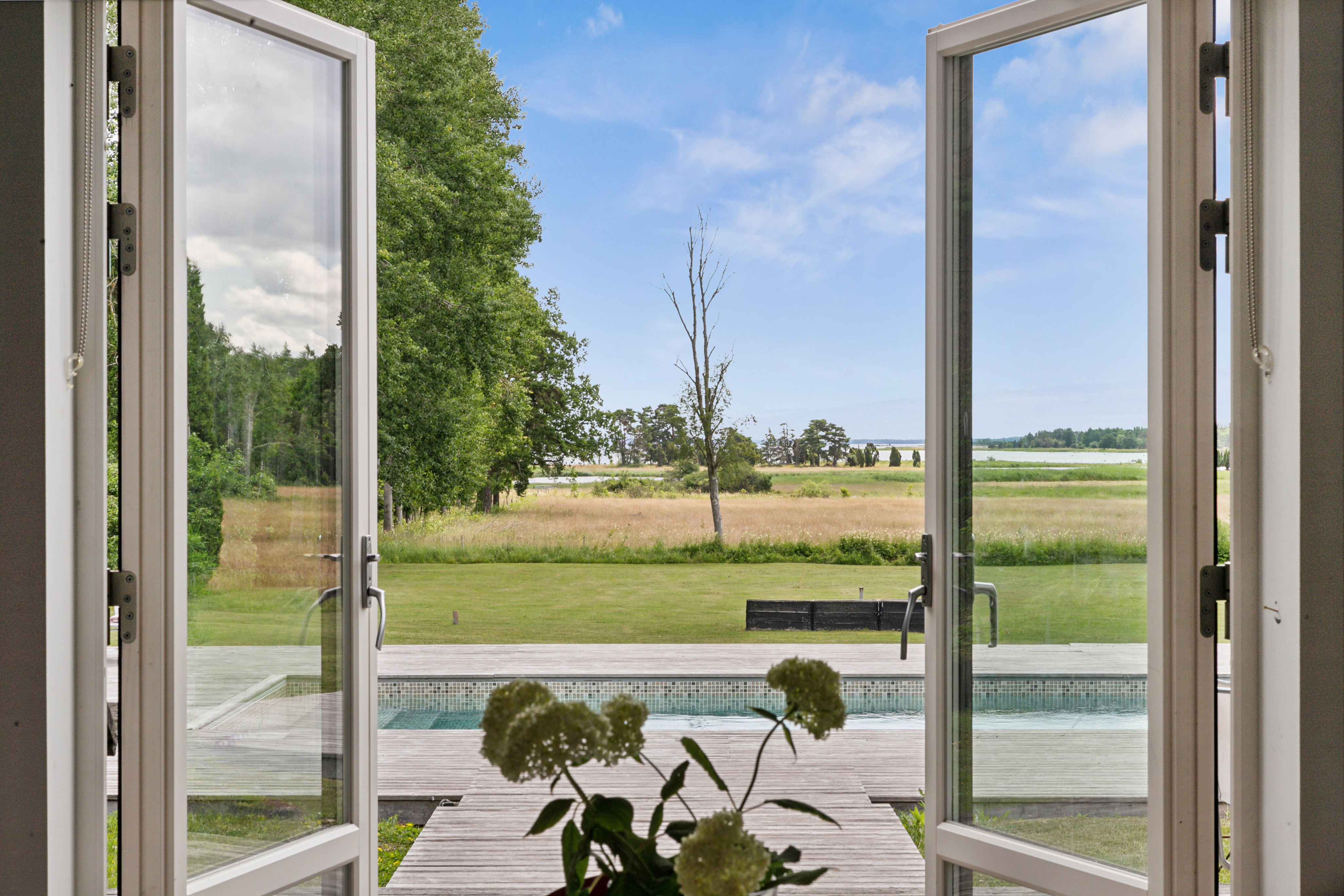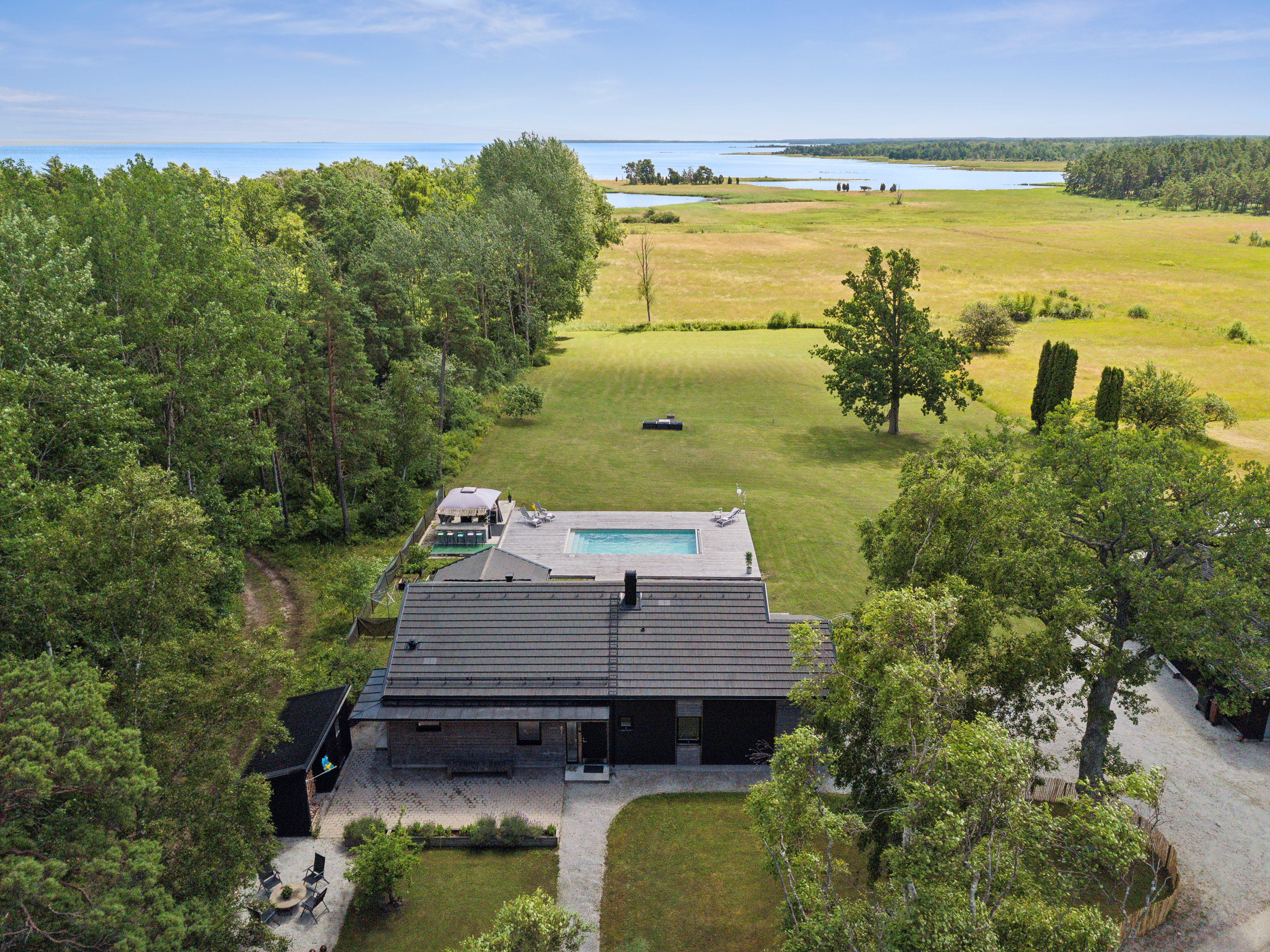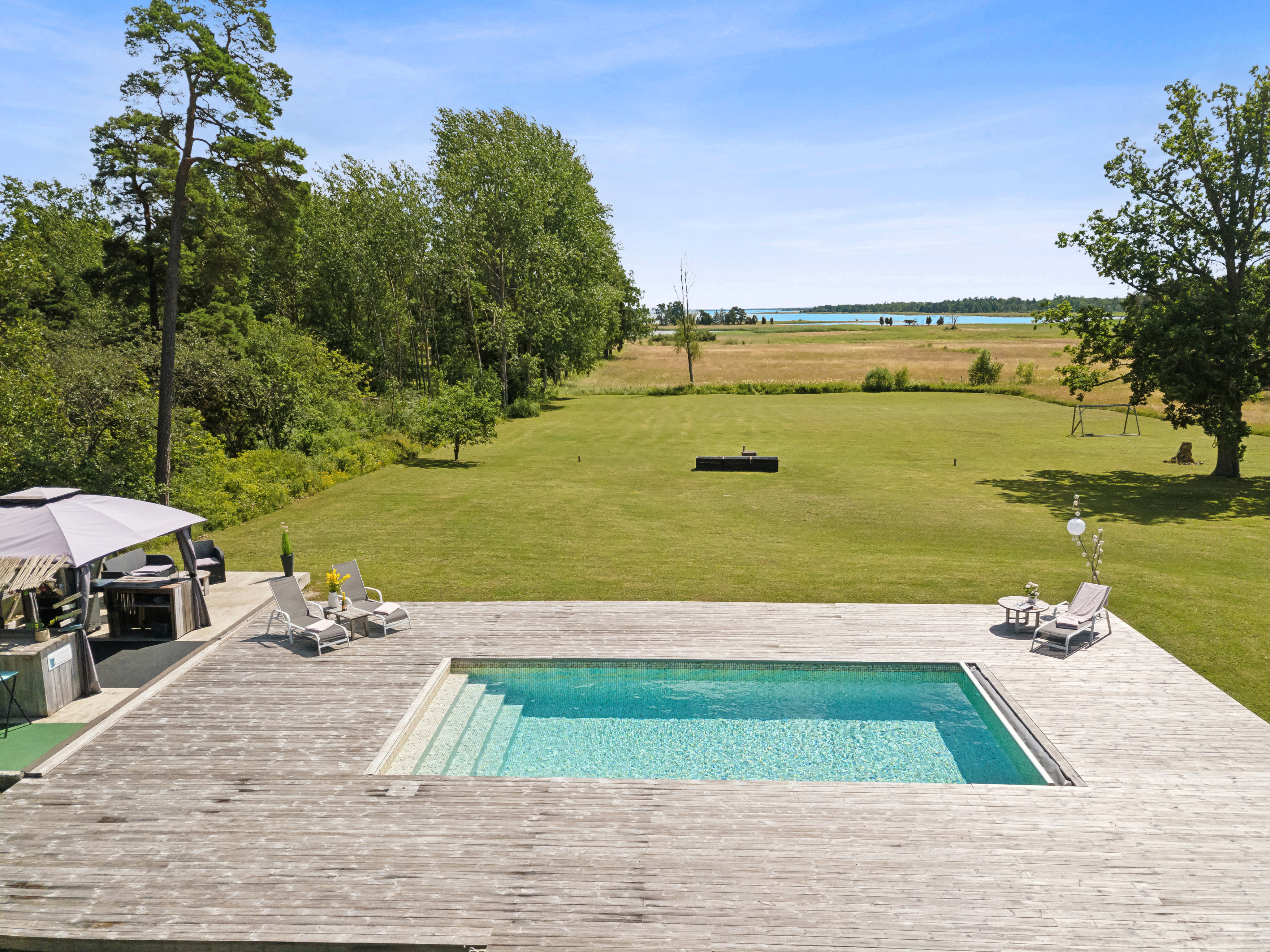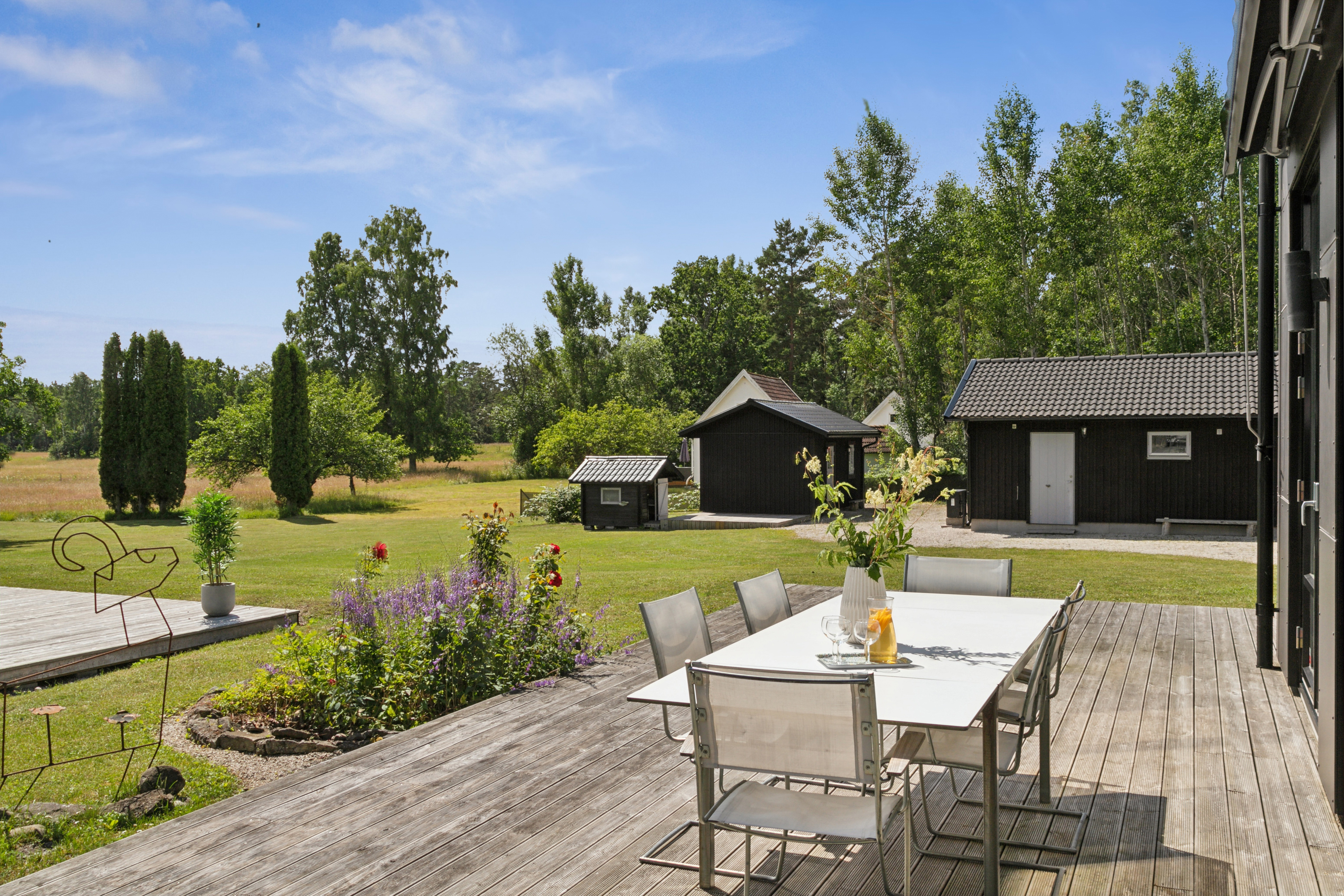 På husets baksida finns en stor härlig altan i solvänligt läge och underbar utsikt över trädgården, strandängarna och havet. Altanen är lättillgänglig från huset via totalt fem altandörrar varav tre dubbla. Från altanen når du enkelt det stora trädäcket och den uppvärmda poolen (4x8 m). En given mötesplats för både familj och vänner lata sommardagar. Vid husets entré finns en stenlagd uteplats, delvis under tak, som följs av en grusad uteplats. Uteplatserna är fint inramade och har eftermiddags- och kvällssol. Här finns plats för både loungemöbler och trädgårdsmöbler - perfekt för sköna grillkvällar.