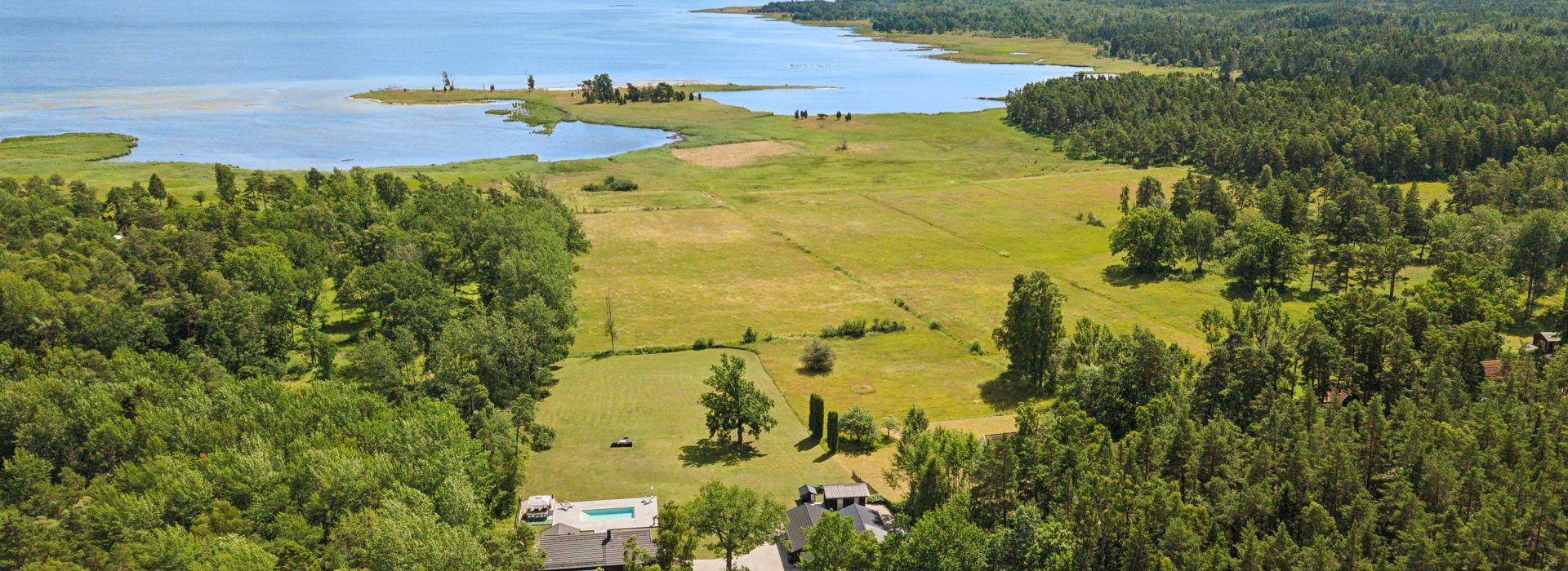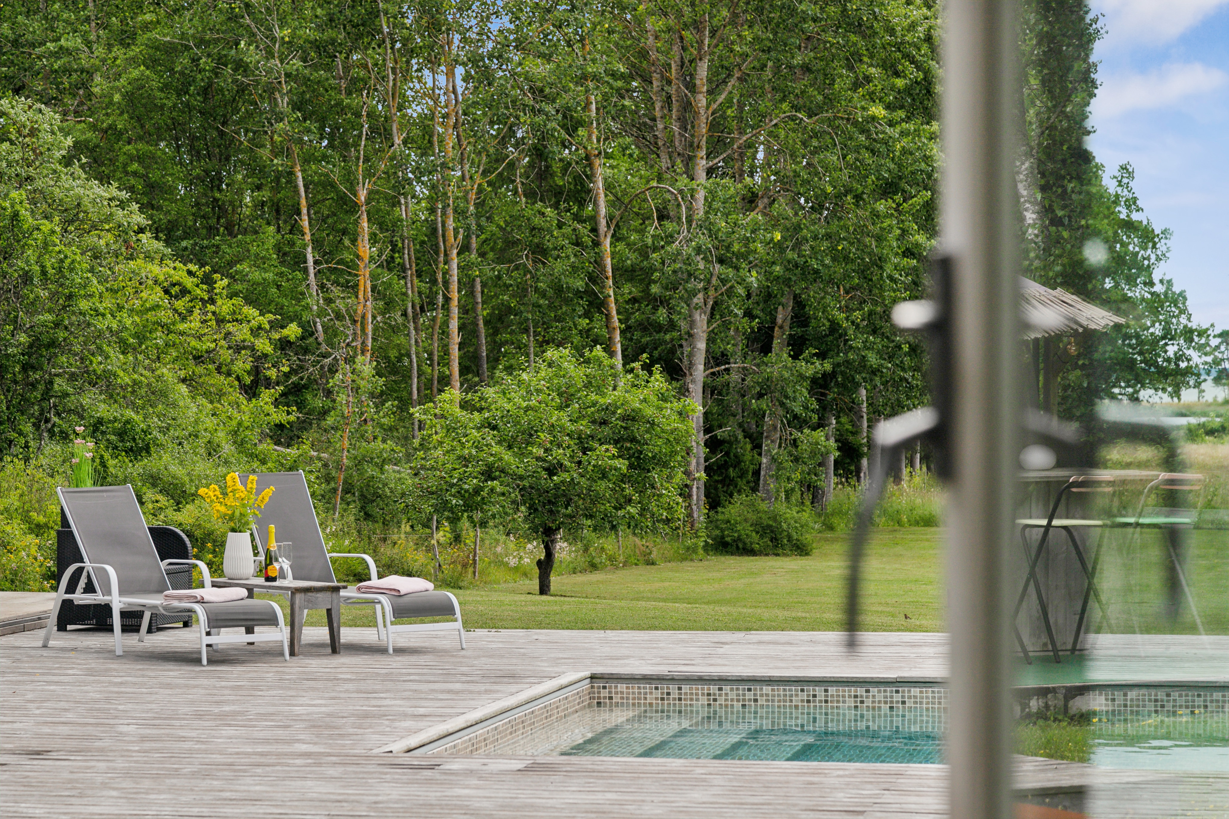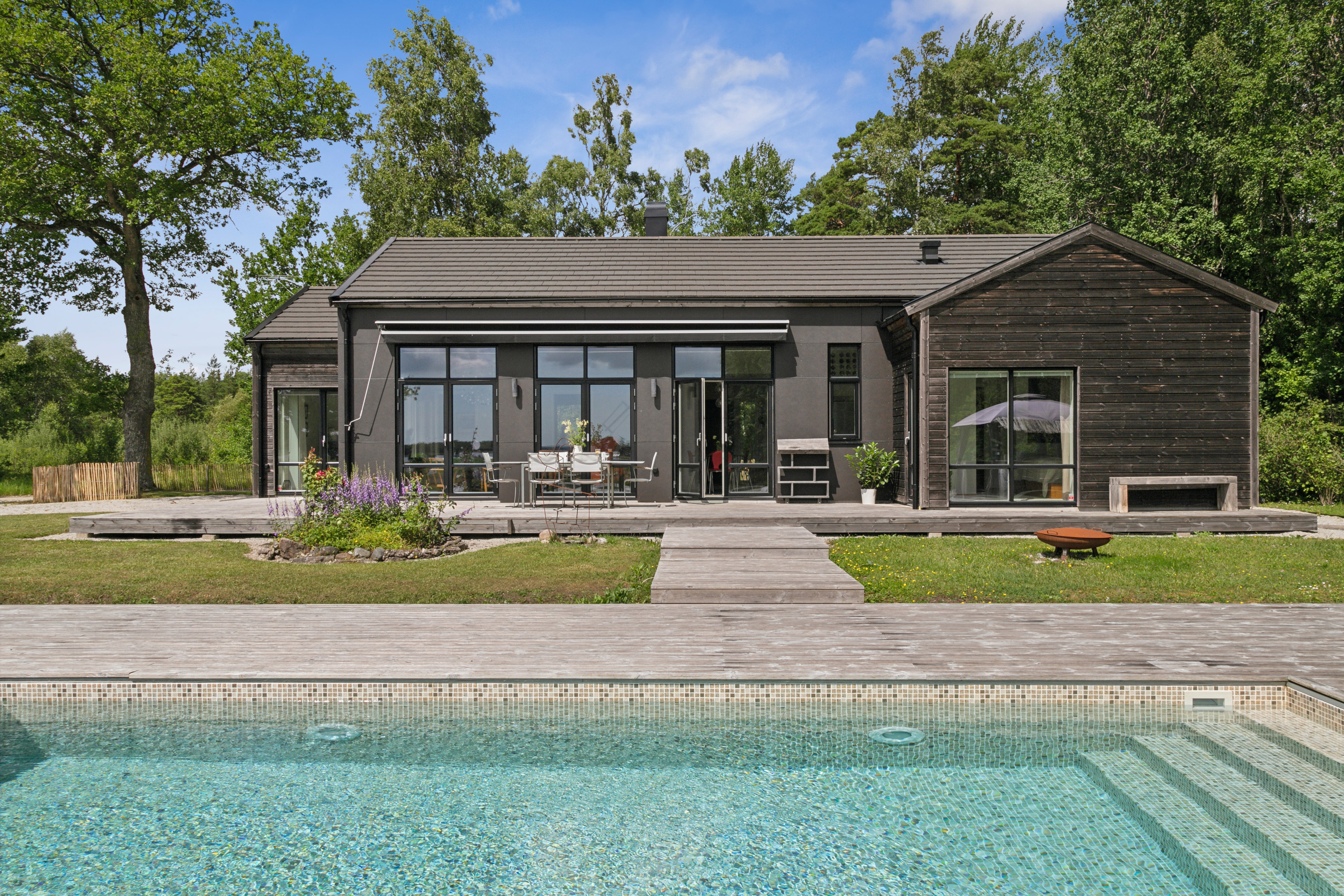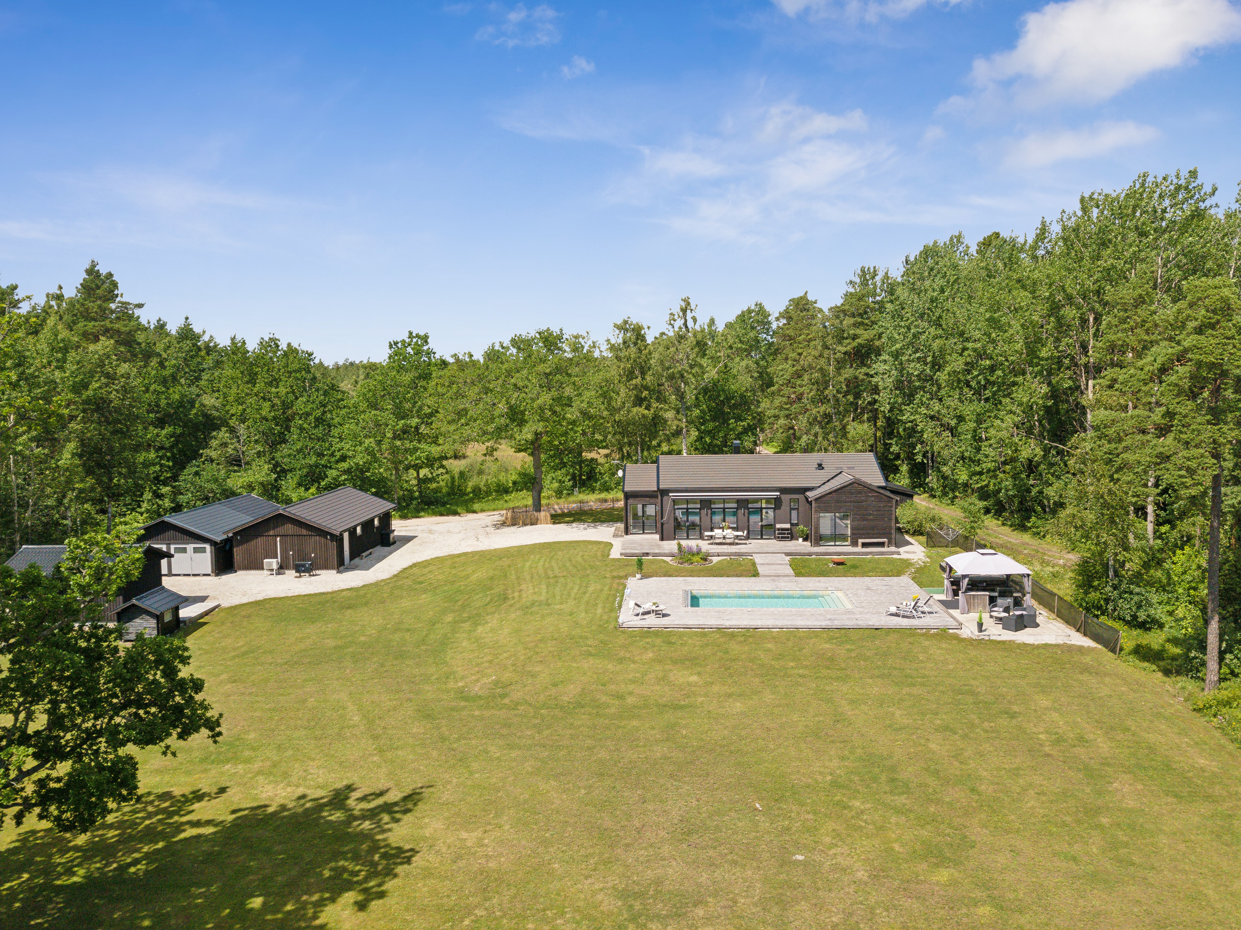 På husets baksida finns en stor härlig altan i solvänligt läge och underbar utsikt över trädgården, strandängarna och havet. Altanen är lättillgänglig från huset via totalt fem altandörrar varav tre dubbla. Från altanen når du enkelt det stora trädäcket och den uppvärmda poolen (4x8 m). En given mötesplats för både familj och vänner lata sommardagar. Vid husets entré finns en stenlagd uteplats, delvis under tak, som följs av en grusad uteplats. Uteplatserna är fint inramade och har eftermiddags- och kvällssol. Här finns plats för både loungemöbler och trädgårdsmöbler - perfekt för sköna grillkvällar.