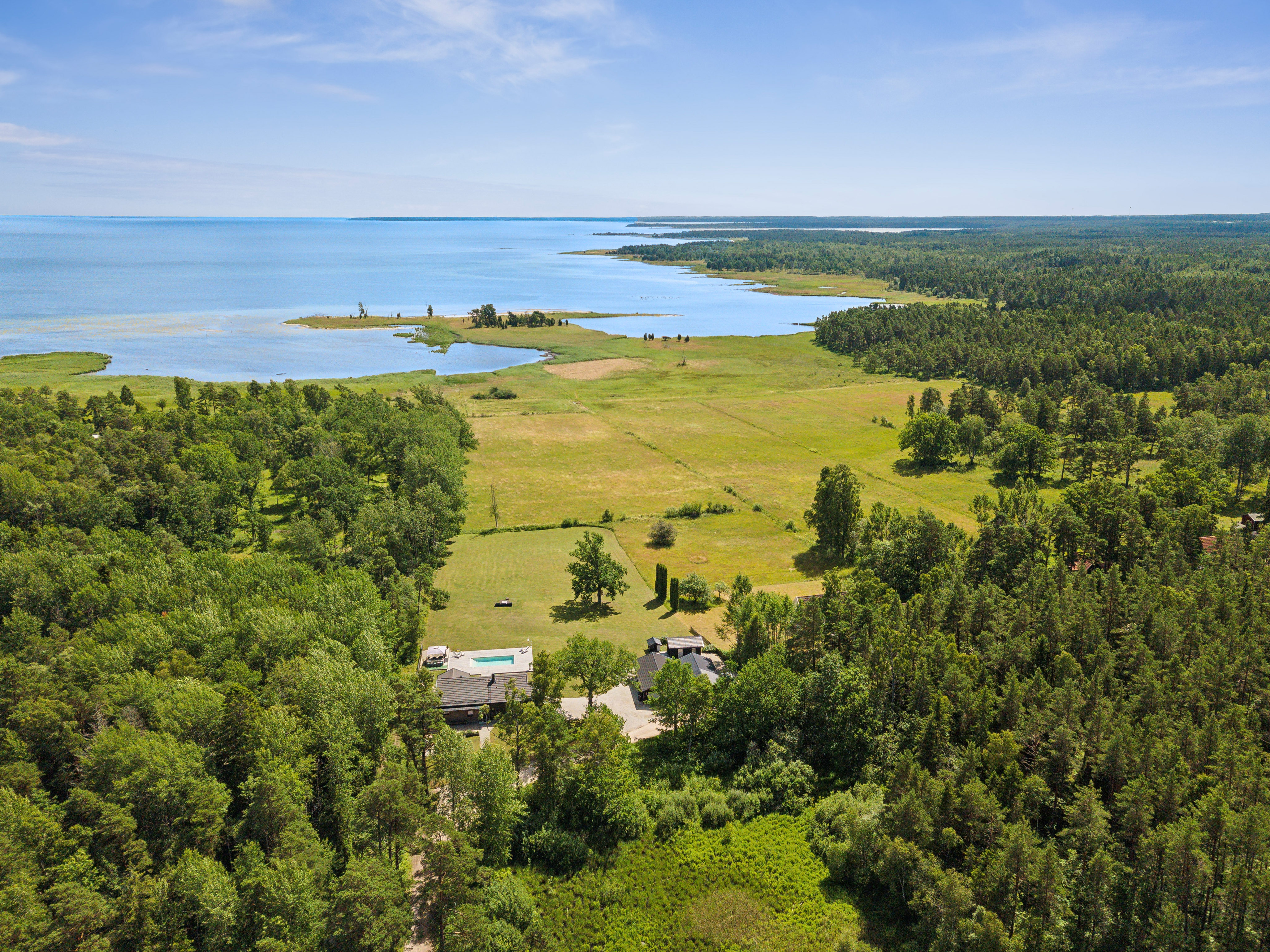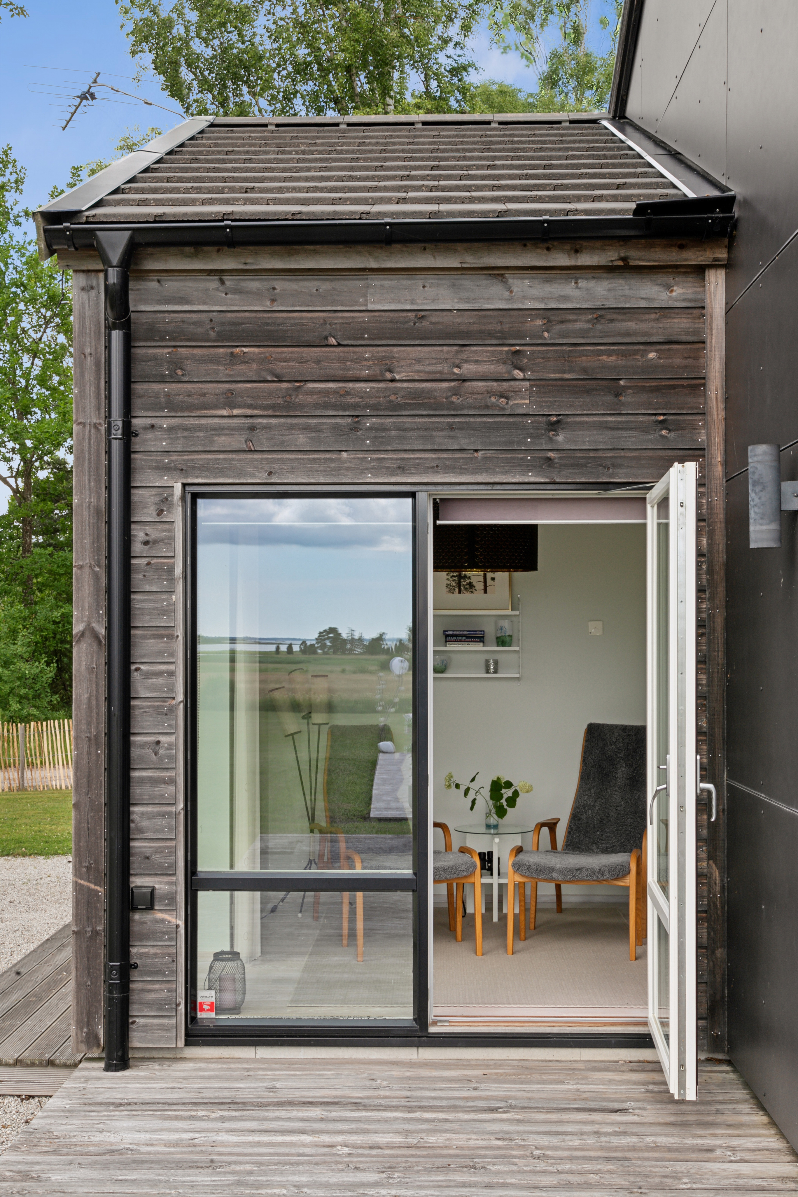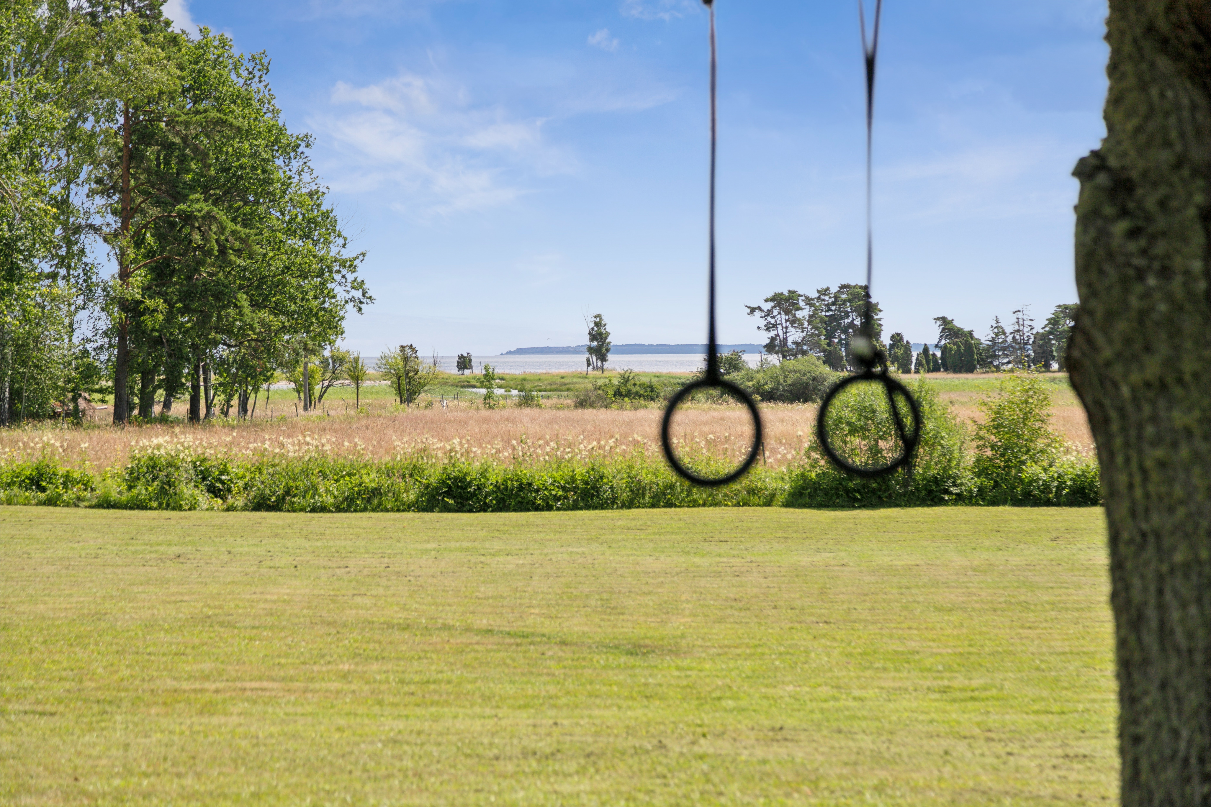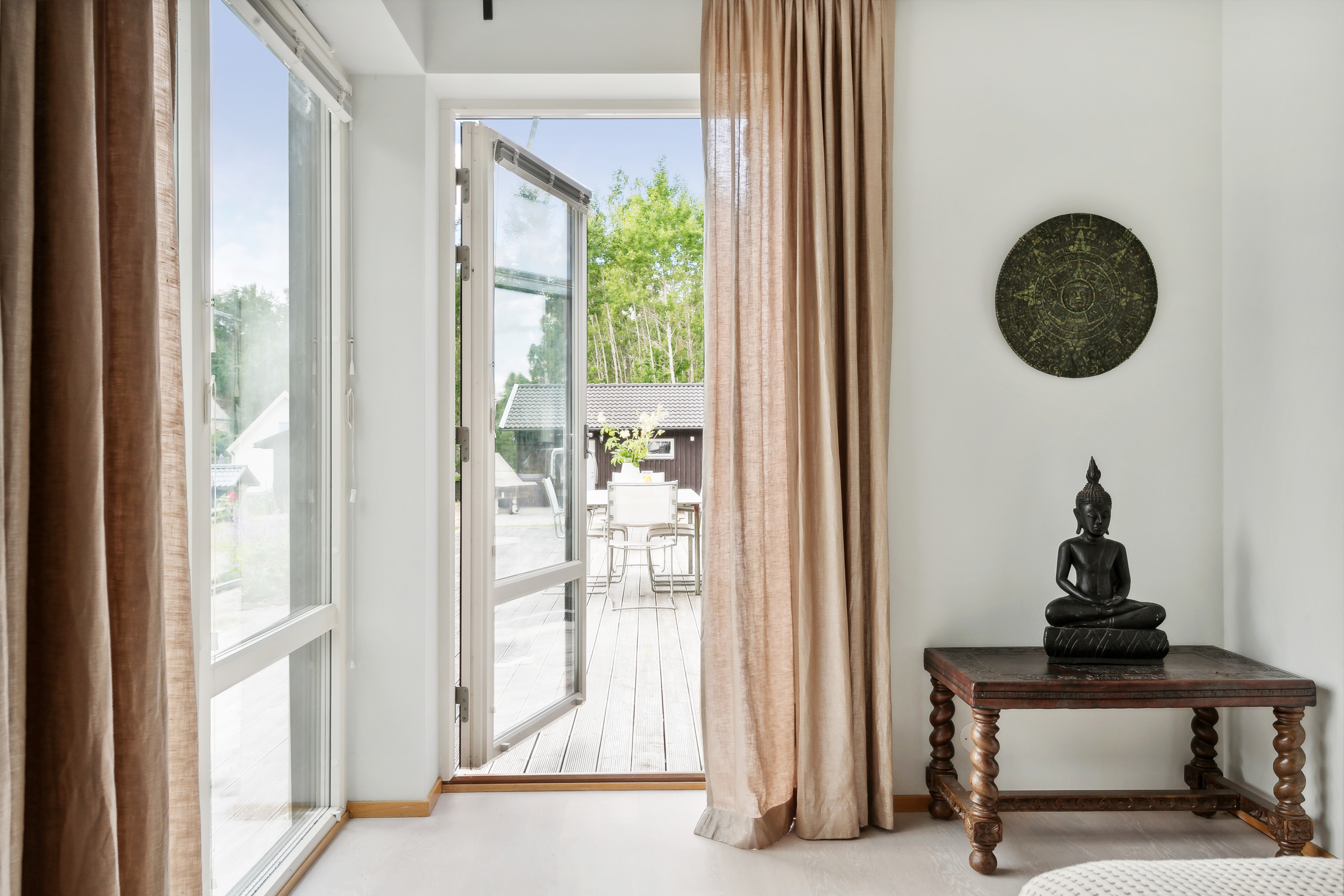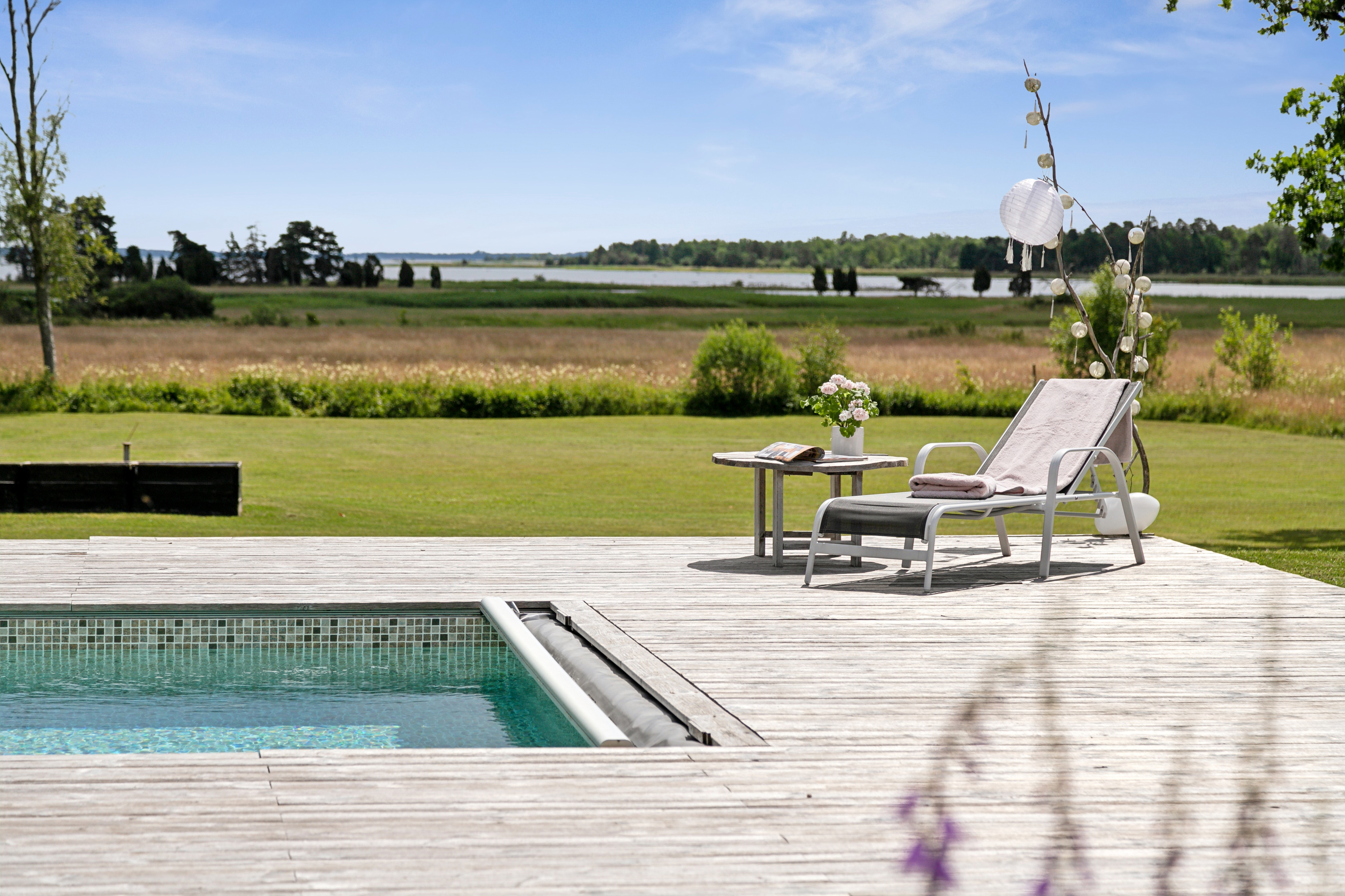 På husets baksida finns en stor härlig altan i solvänligt läge och underbar utsikt över trädgården, strandängarna och havet. Altanen är lättillgänglig från huset via totalt fem altandörrar varav tre dubbla. Från altanen når du enkelt det stora trädäcket och den uppvärmda poolen (4x8 m). En given mötesplats för både familj och vänner lata sommardagar. Vid husets entré finns en stenlagd uteplats, delvis under tak, som följs av en grusad uteplats. Uteplatserna är fint inramade och har eftermiddags- och kvällssol. Här finns plats för både loungemöbler och trädgårdsmöbler - perfekt för sköna grillkvällar.