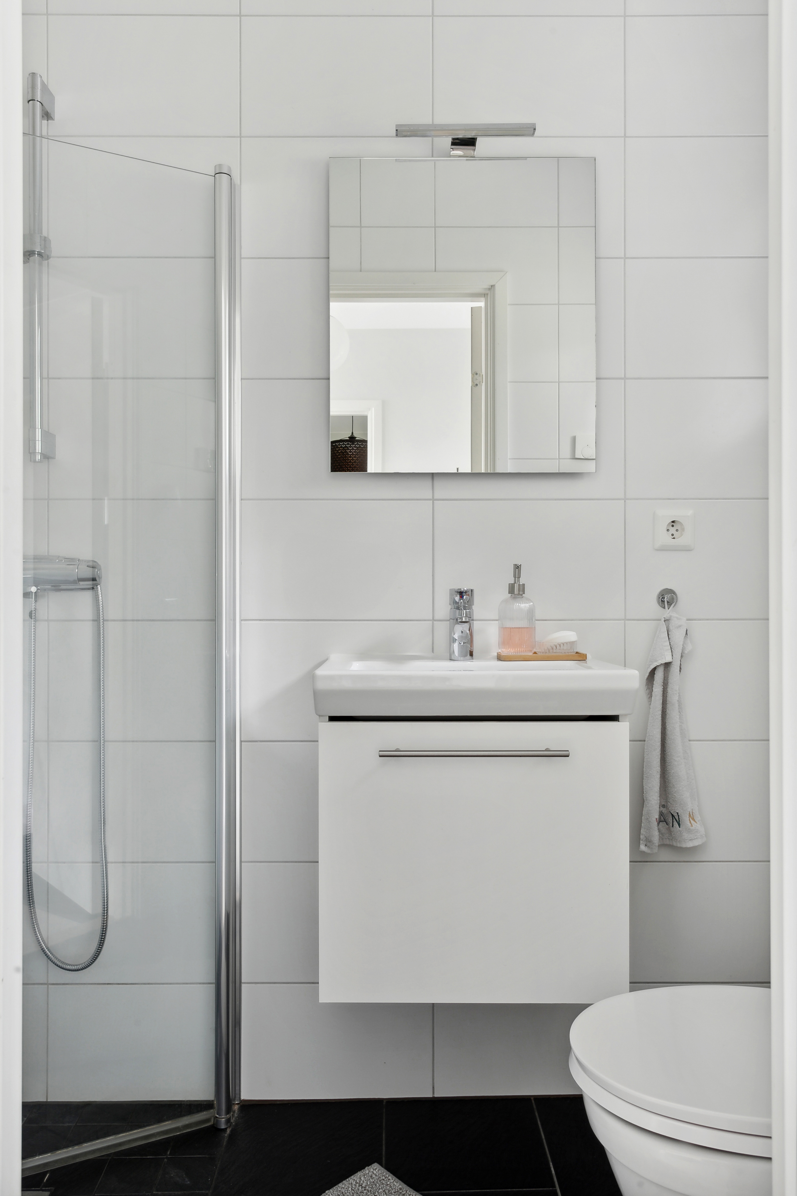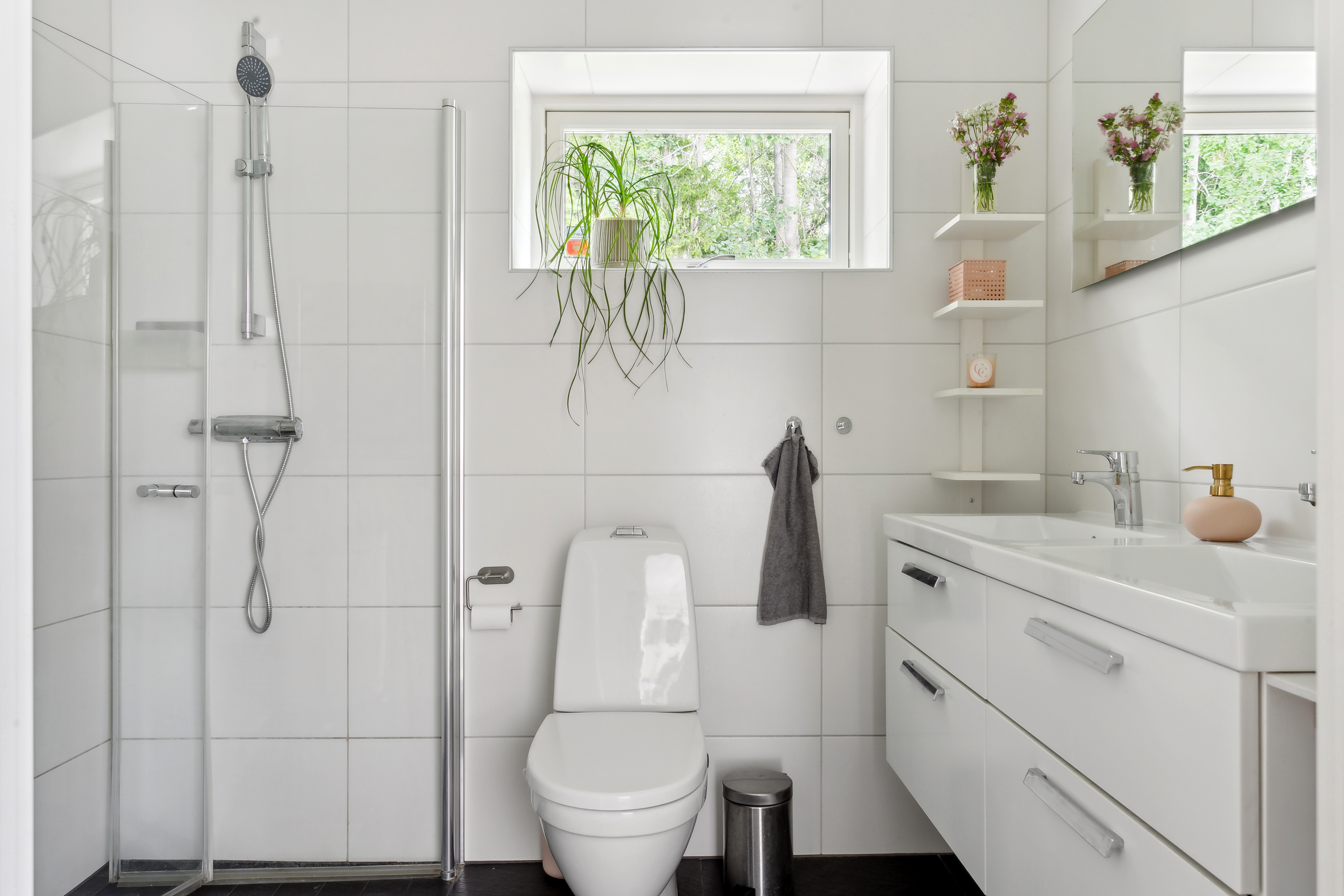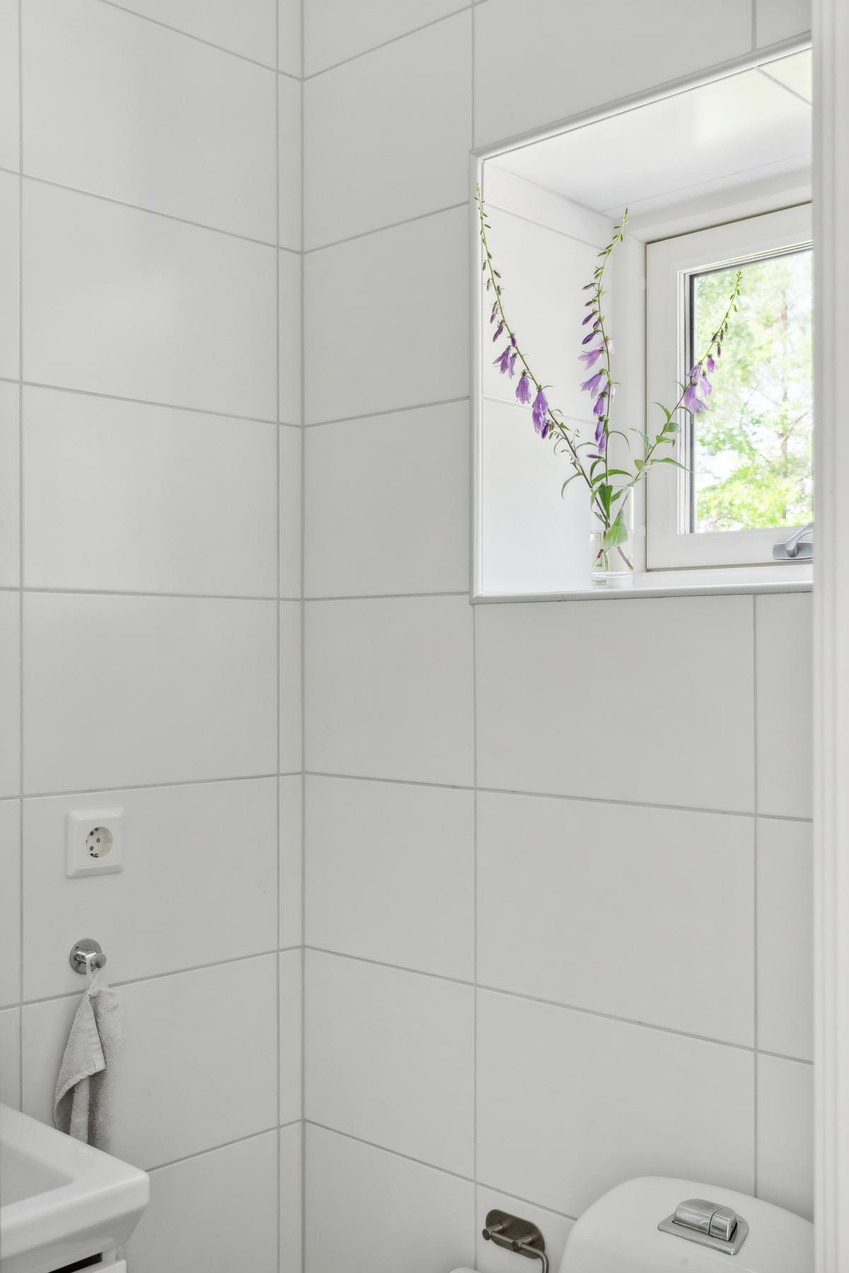 Fräscht helkaklat badrum med klinkergolv och golvvärme. Vädringsfönster.