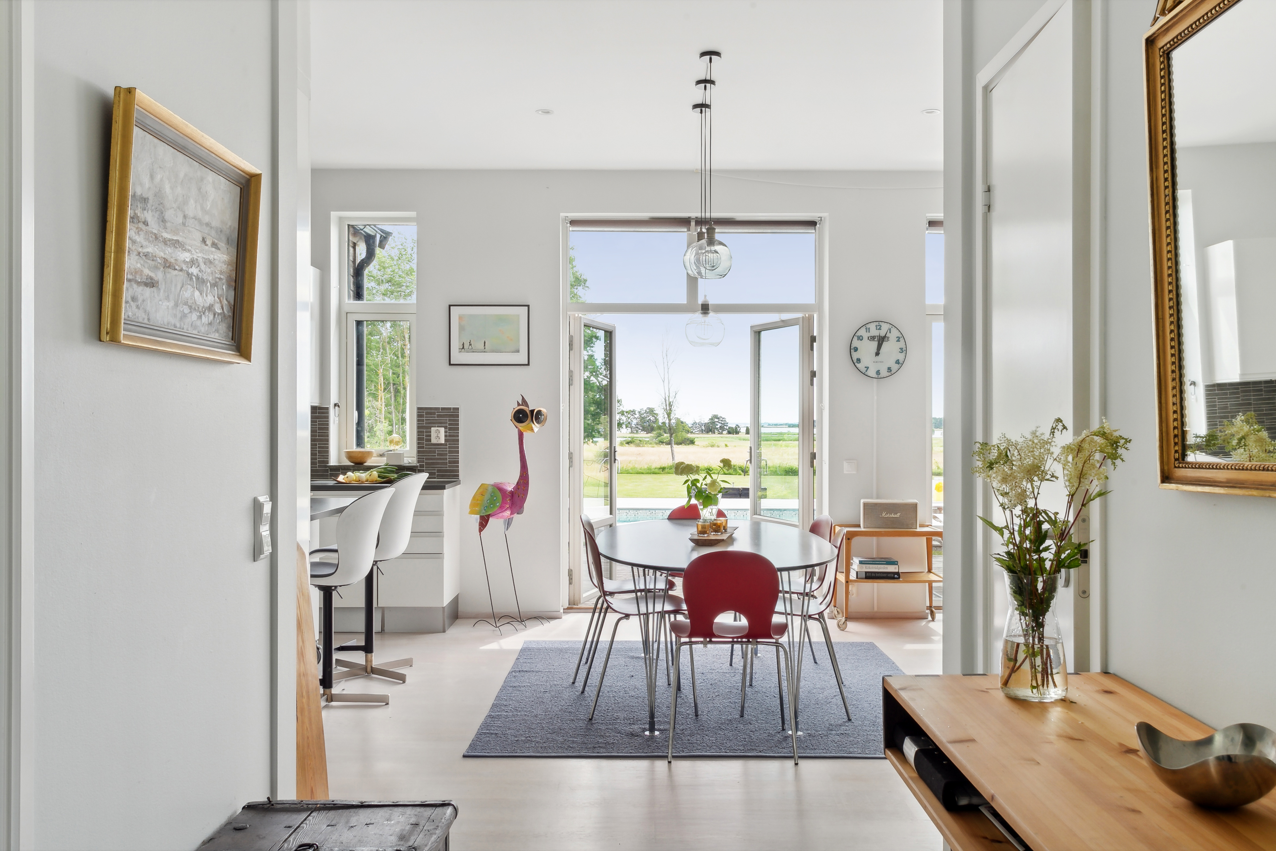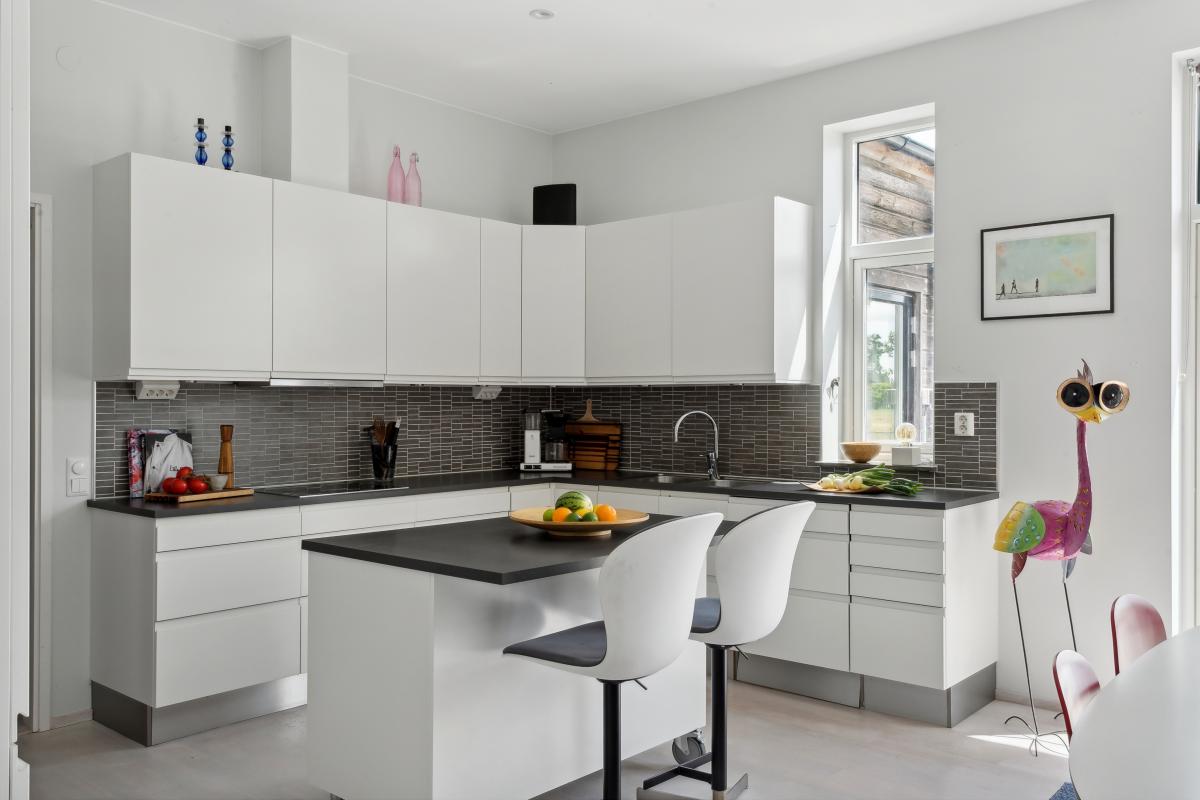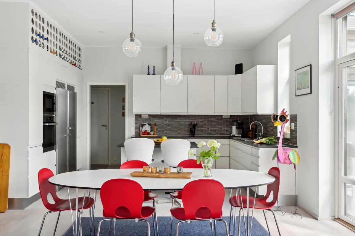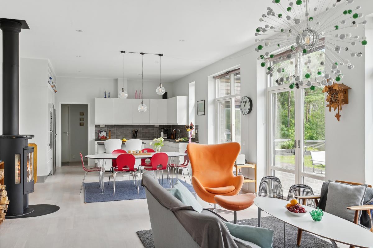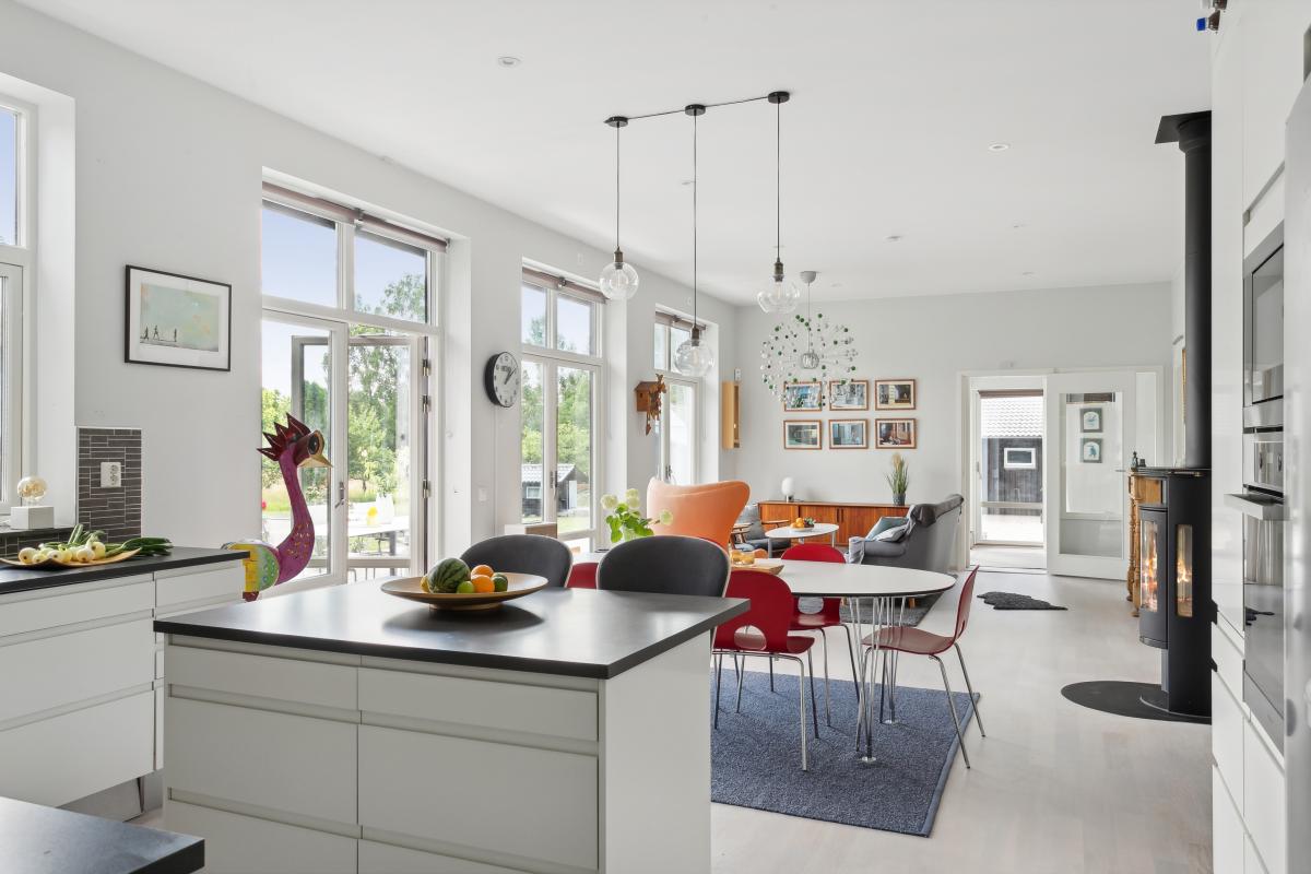 Underbart stort rum med kök, matplats och vardagsrum i härlig öppen planlösning. Tre dubbla fönsterdörrar ut mot altanen ger fint ljusinsläpp. Här njuter du av stora ytor och fantastisk utsikt. Köket är stilrent i vitt med mörk bänkskiva, grått kakel och påkostade vitvaror från Miele. Köket är väldisponerat med gott om arbetsytor och förvaring. Här finns även en praktisk mobil köksö med två sittplatser. Rummet har plats för stort matbord, rymlig vardagsrumsdel och en välplacerad braskamin för värme och trivsel. Rummet har en takhöjd på 2,95 meter.