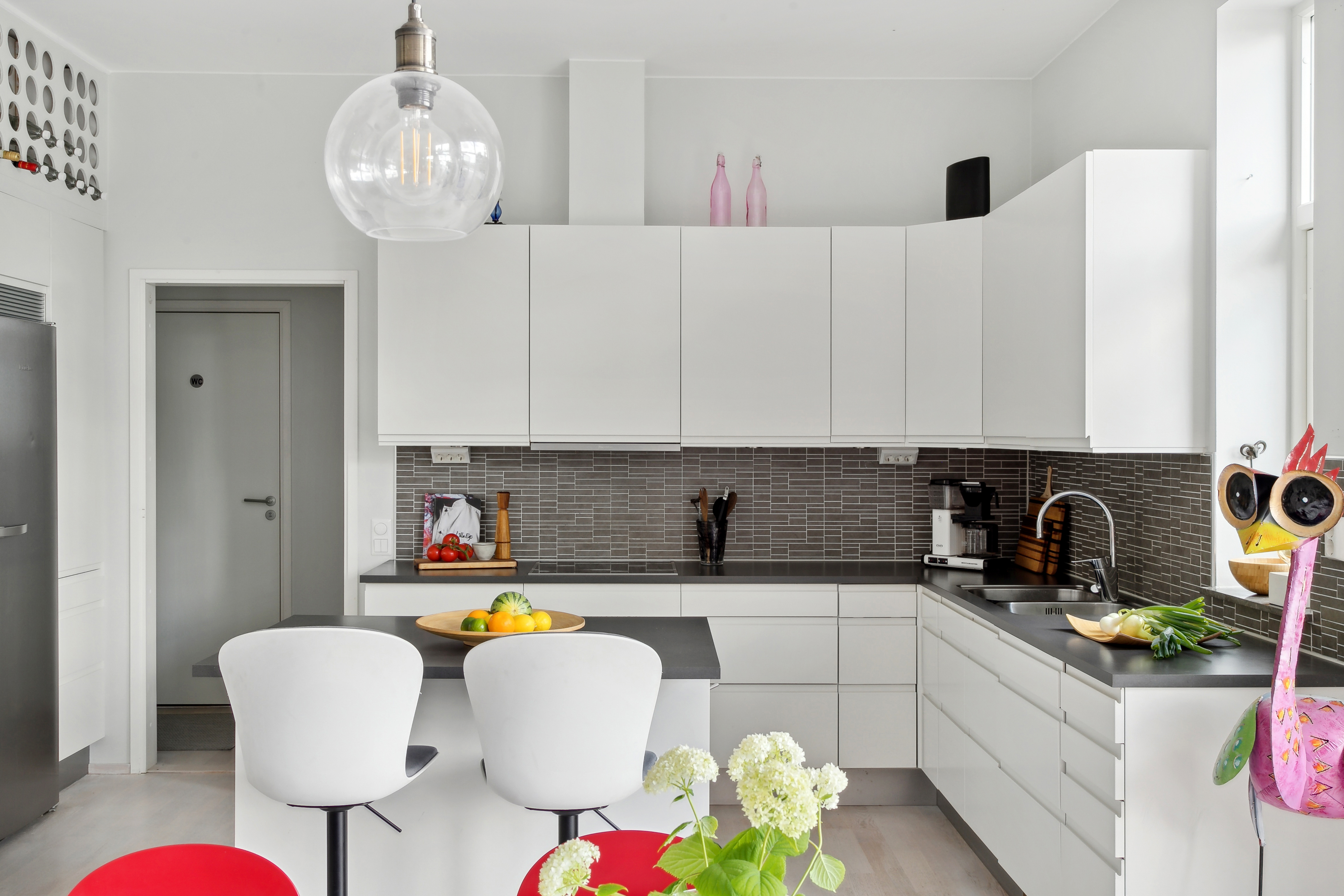 Utrustning: skåp, inbyggd microvågsugn, inbyggd ugn, frys, kyl, skåp, spishäll, spisfläkt och integrerad diskmaskin.