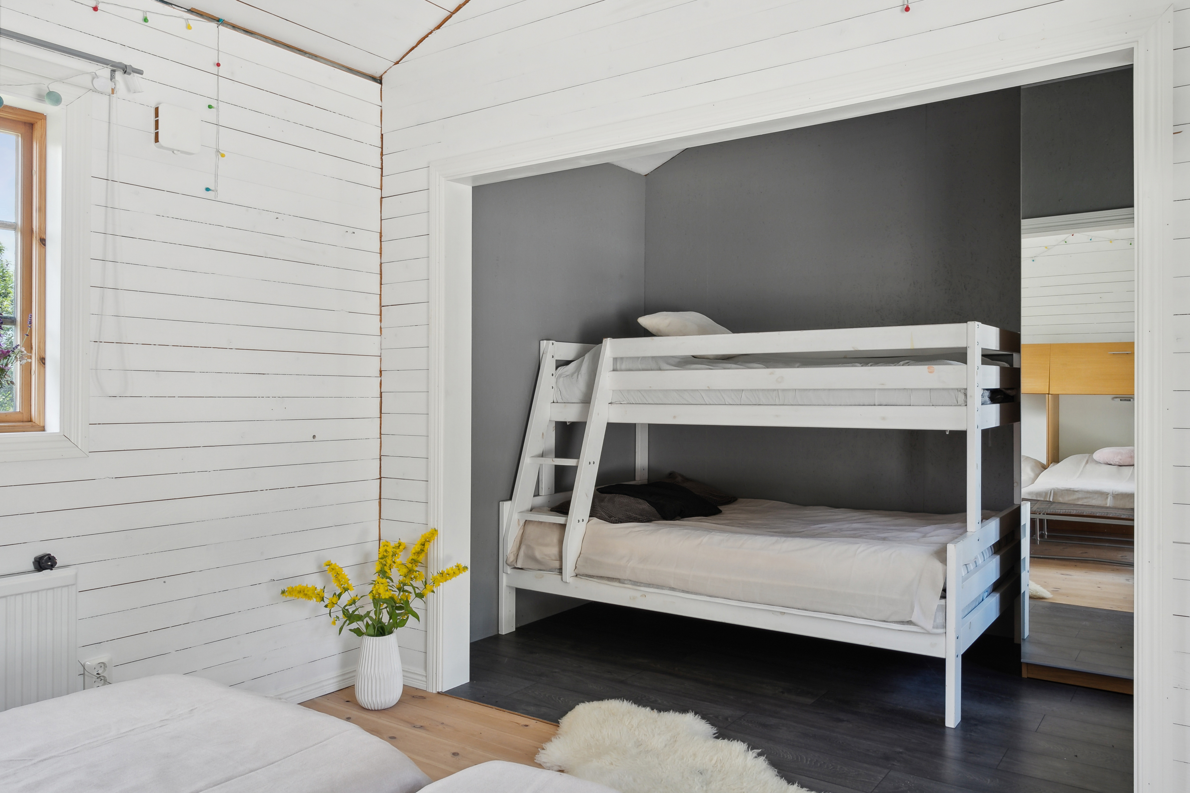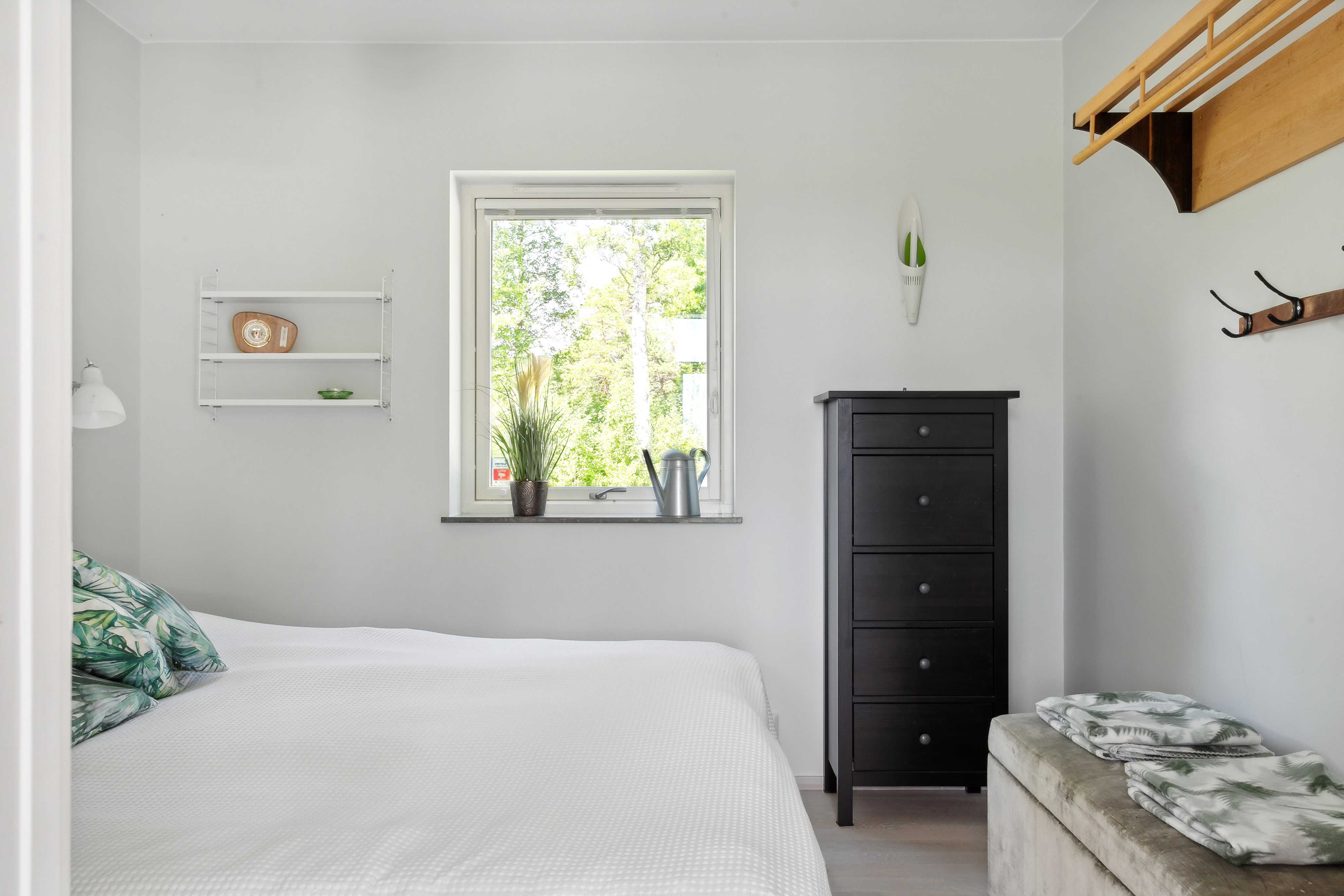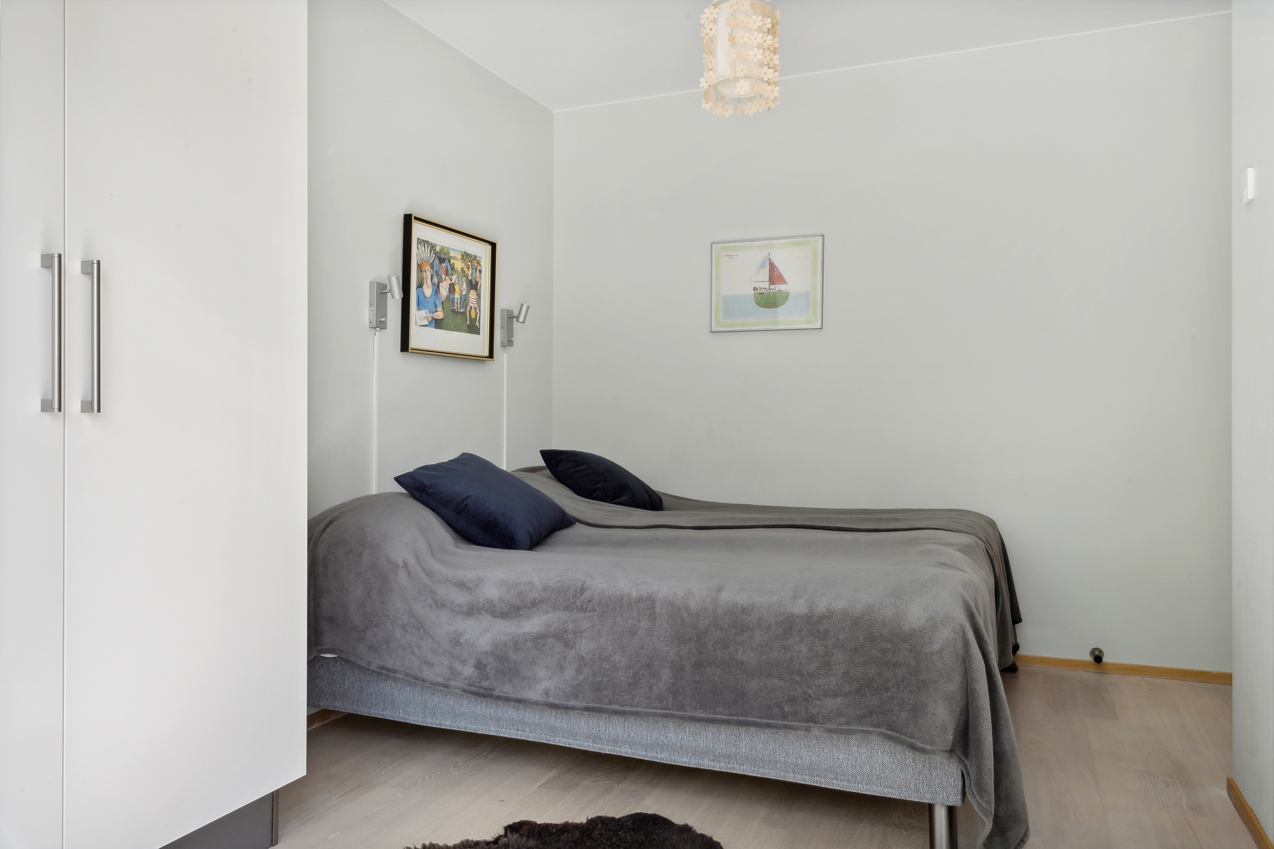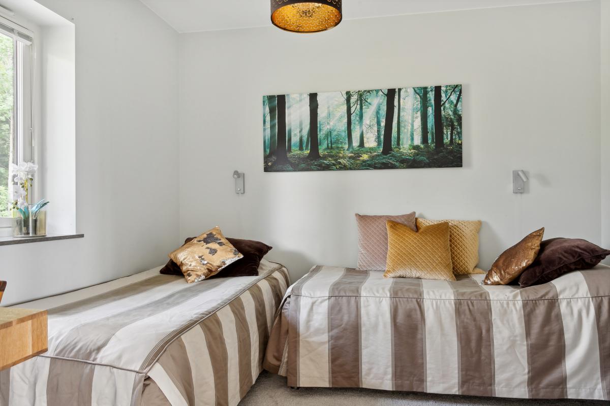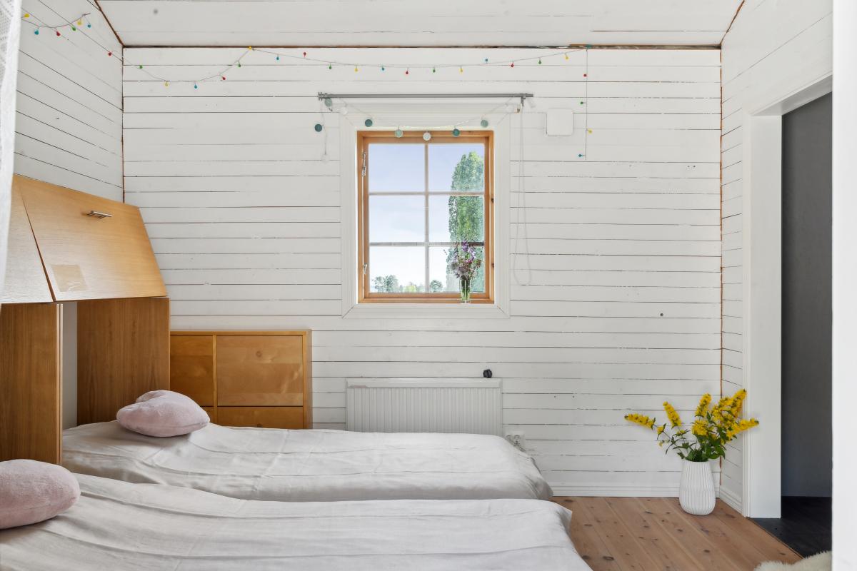 Ljust och fint sovrum med plats för två sängar.