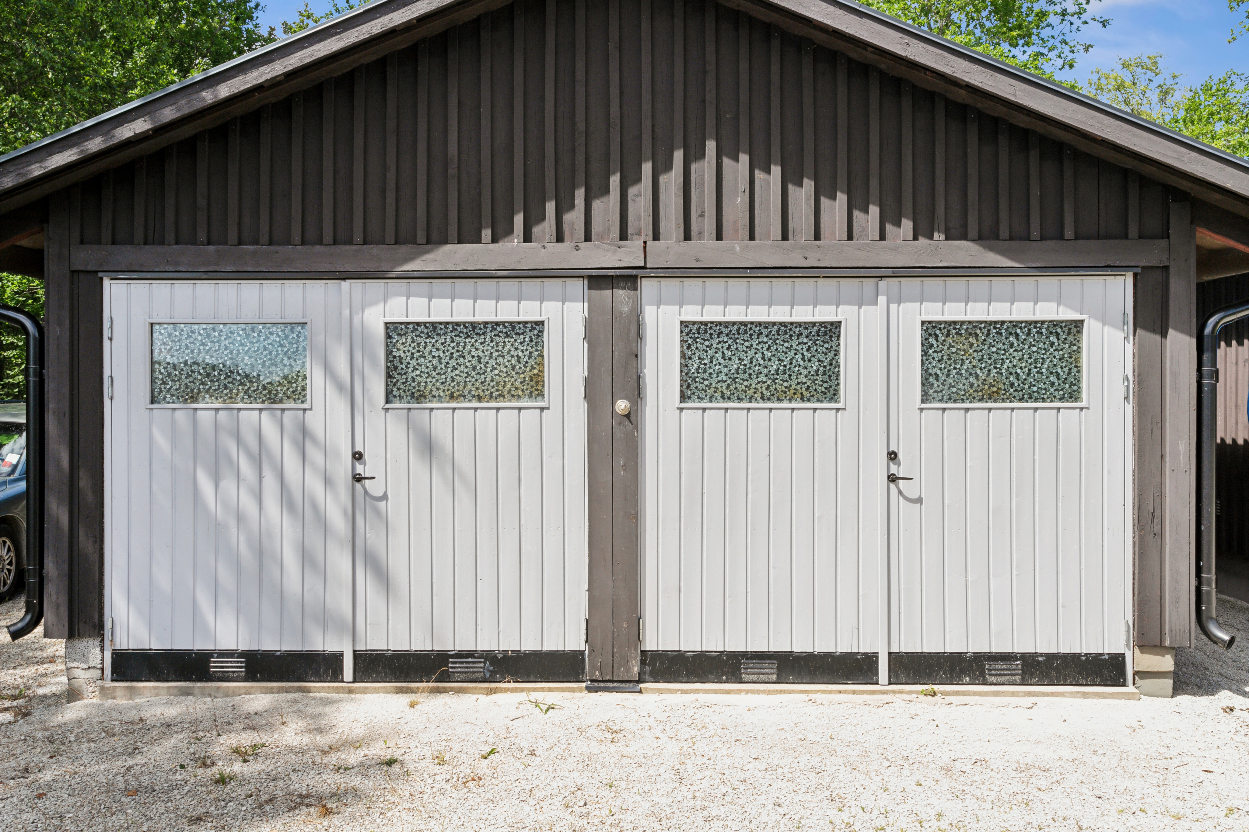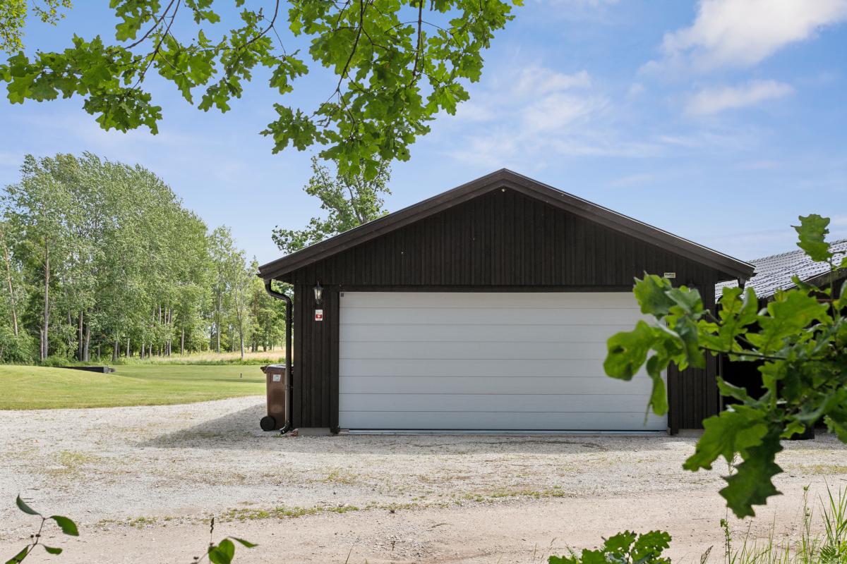Det finns gott om parkerings- eller förvaringsmöjligheter i två dubbelgarage och carport. Dessutom finns det plats att parkera flera bilar på den grusade parkeringen/gårdsplanen. Det ena garaget är från 2015 och cirka 70 kvm (trä med betongpannor). Det är isolerat, har både dörr och fjärrstyrd dubbelport och en luft/luft värmepump från 2016. Här finns möjlighet att sätta upp en vägg och ha hobbyrum/gym/förvaring. Det är förberett för vatten. Det andra garaget är renoverat 2007 och cirka 25 kvm (trä med plåttak). Det är isolerat, har dubbla portar och oljefyllda elelement. Garaget är vidbyggt 2015 med en rymlig carport med eluttag.